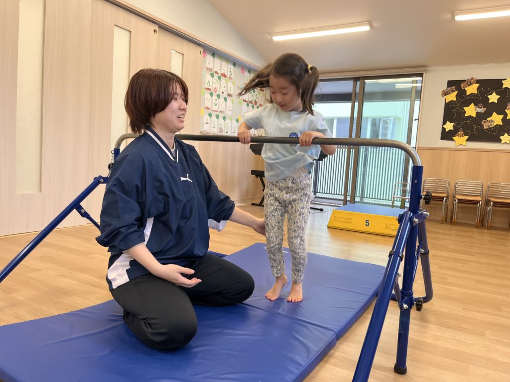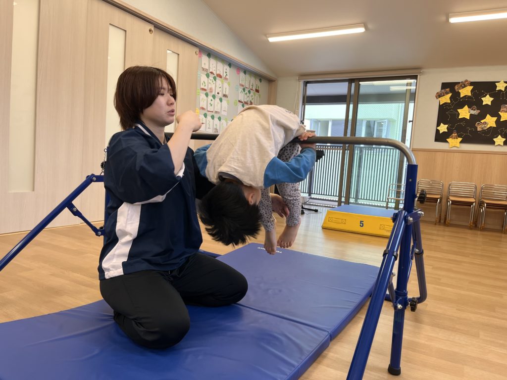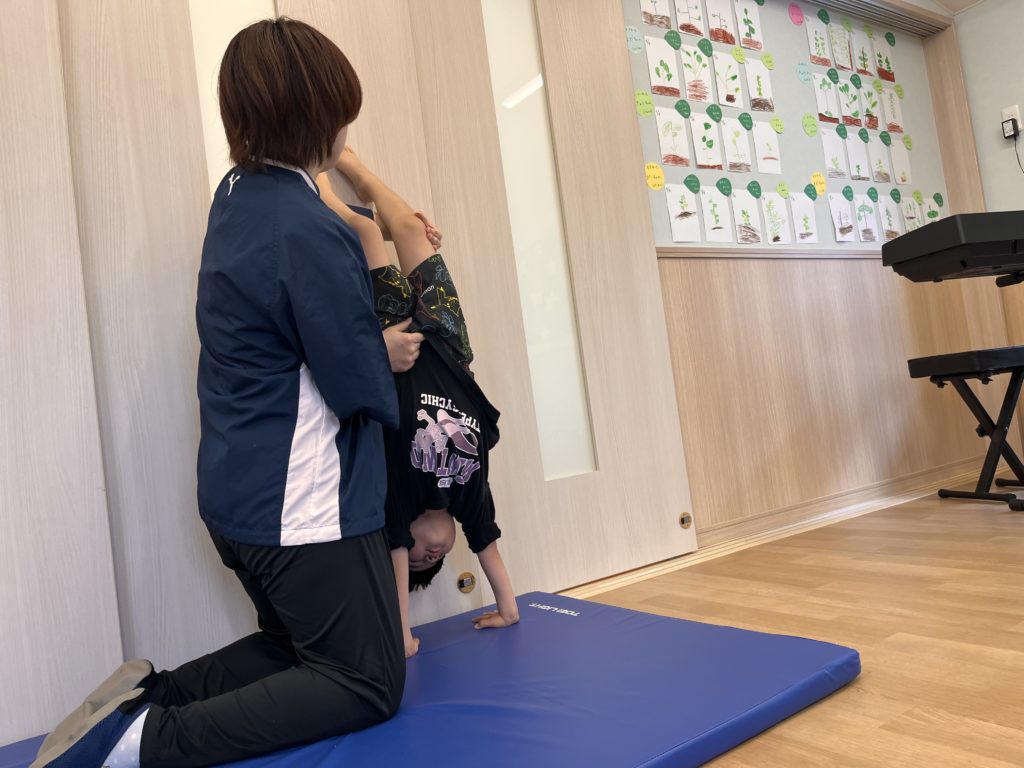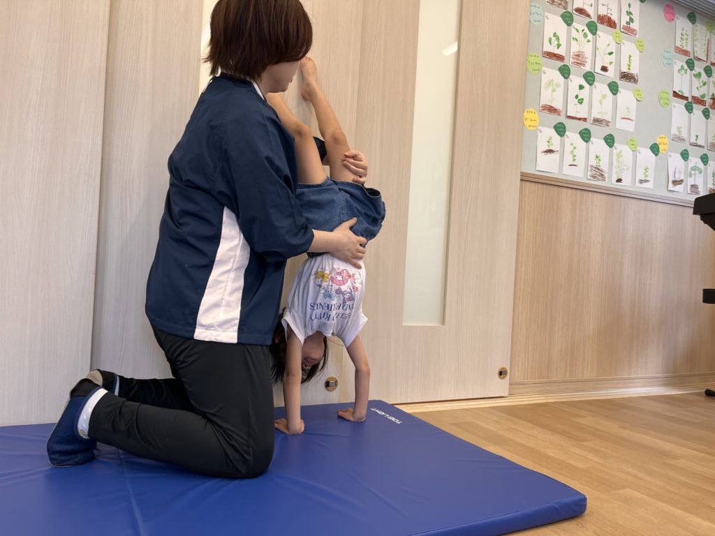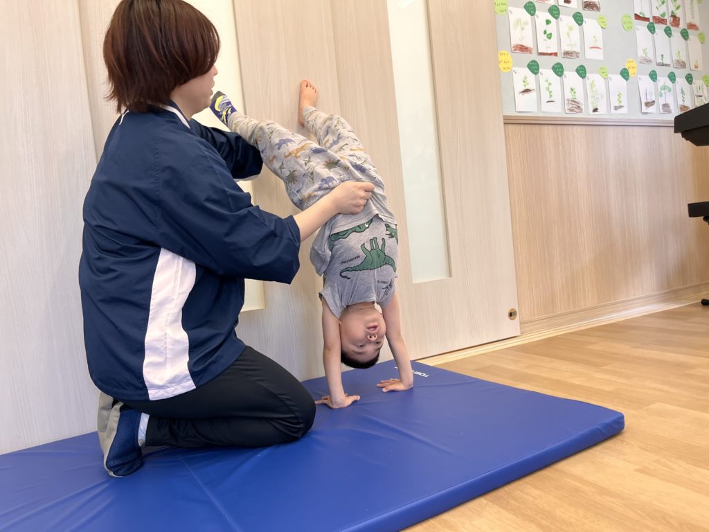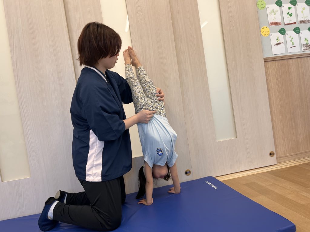 逆立ちは壁を使いながら、先生の補助付きで行っています!
