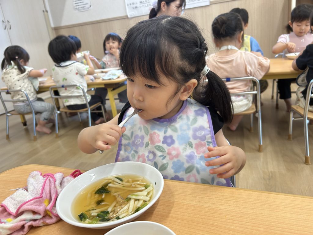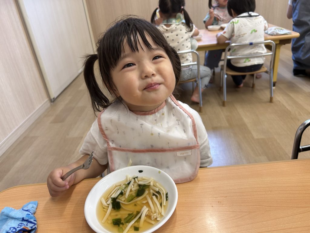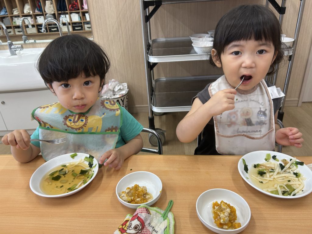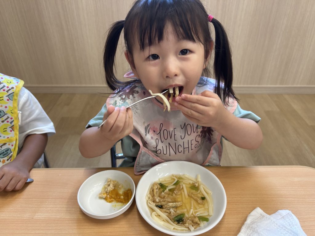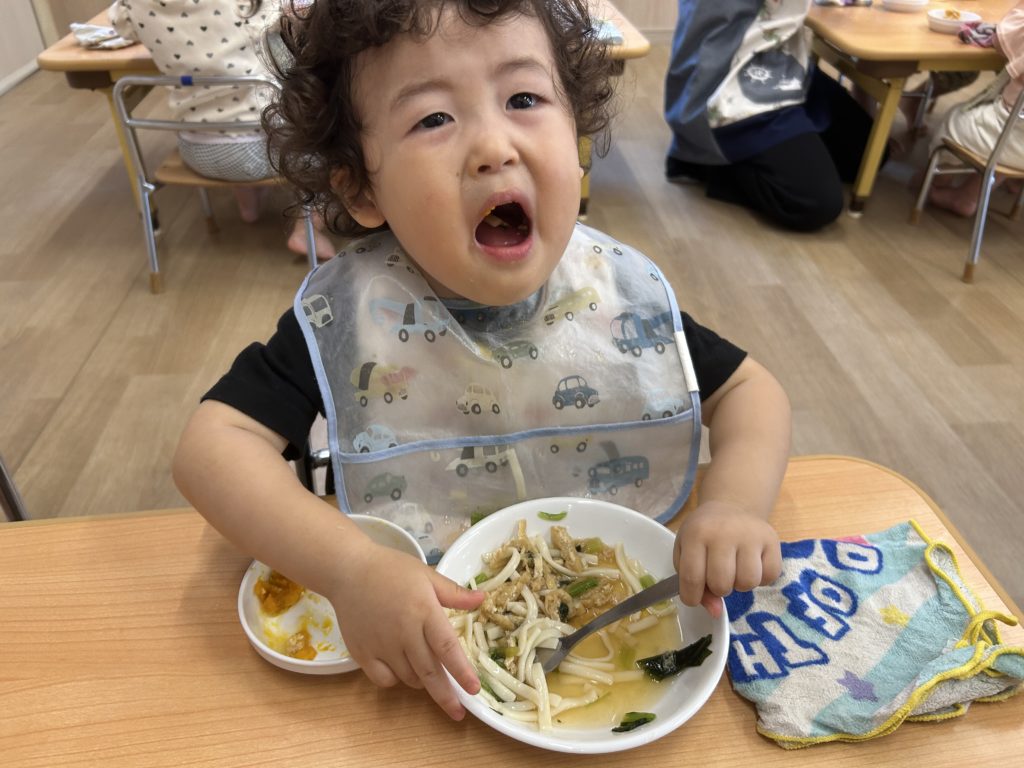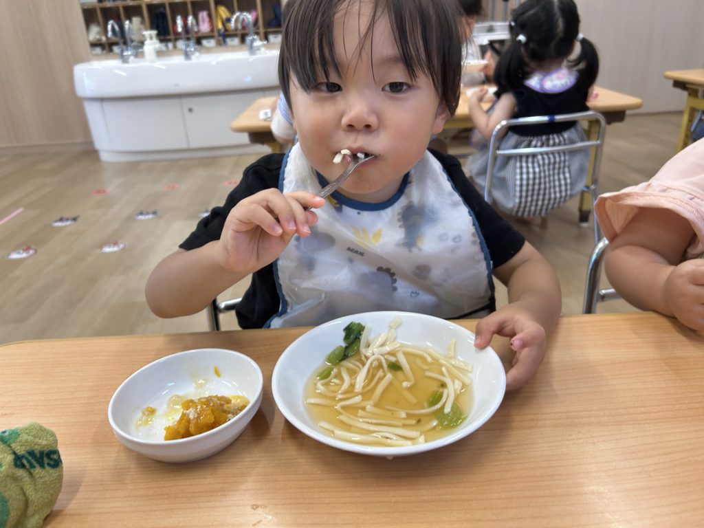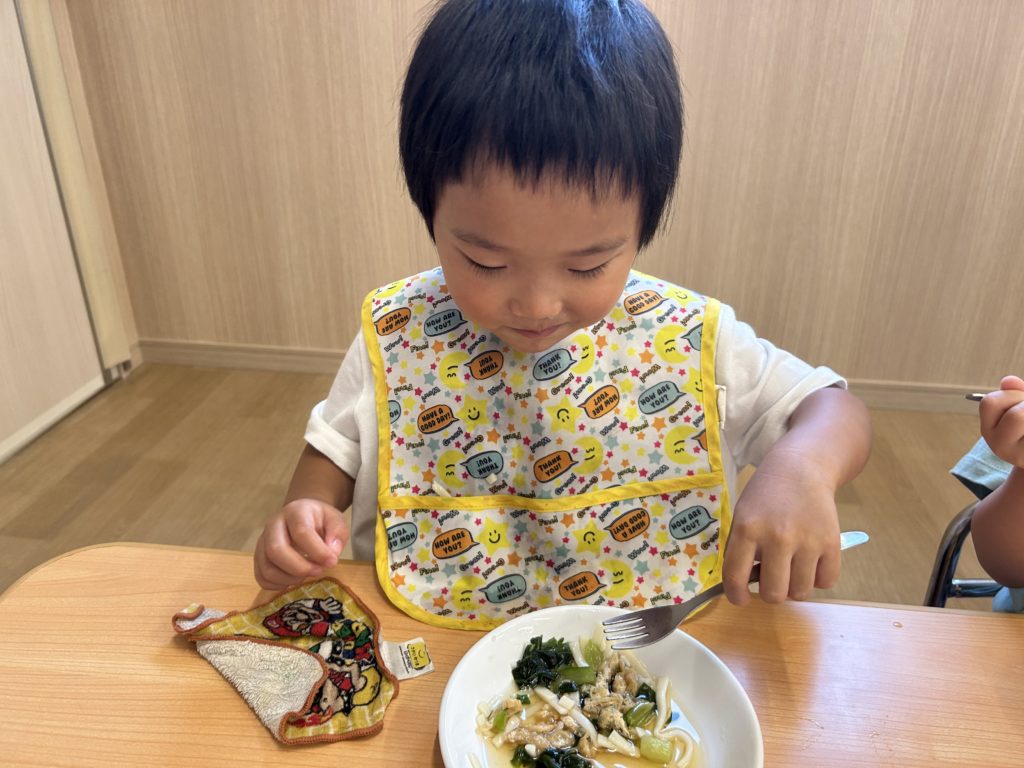 上手にフォークを使って一生懸命食べていました🎶「先生見ててね!」と苦手なお野菜もお口へ!お皿ピカピカのかっこいいあざらし組でした🍉