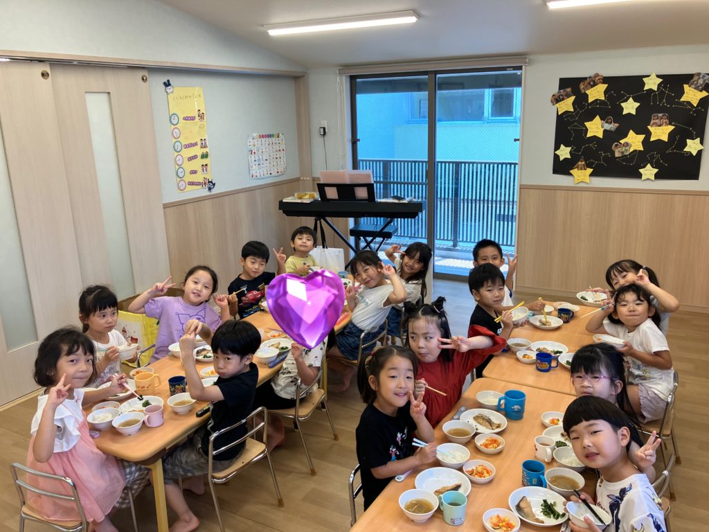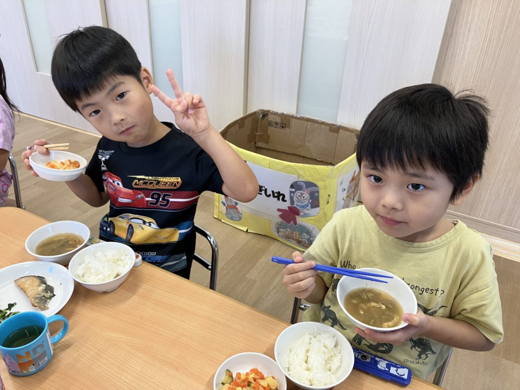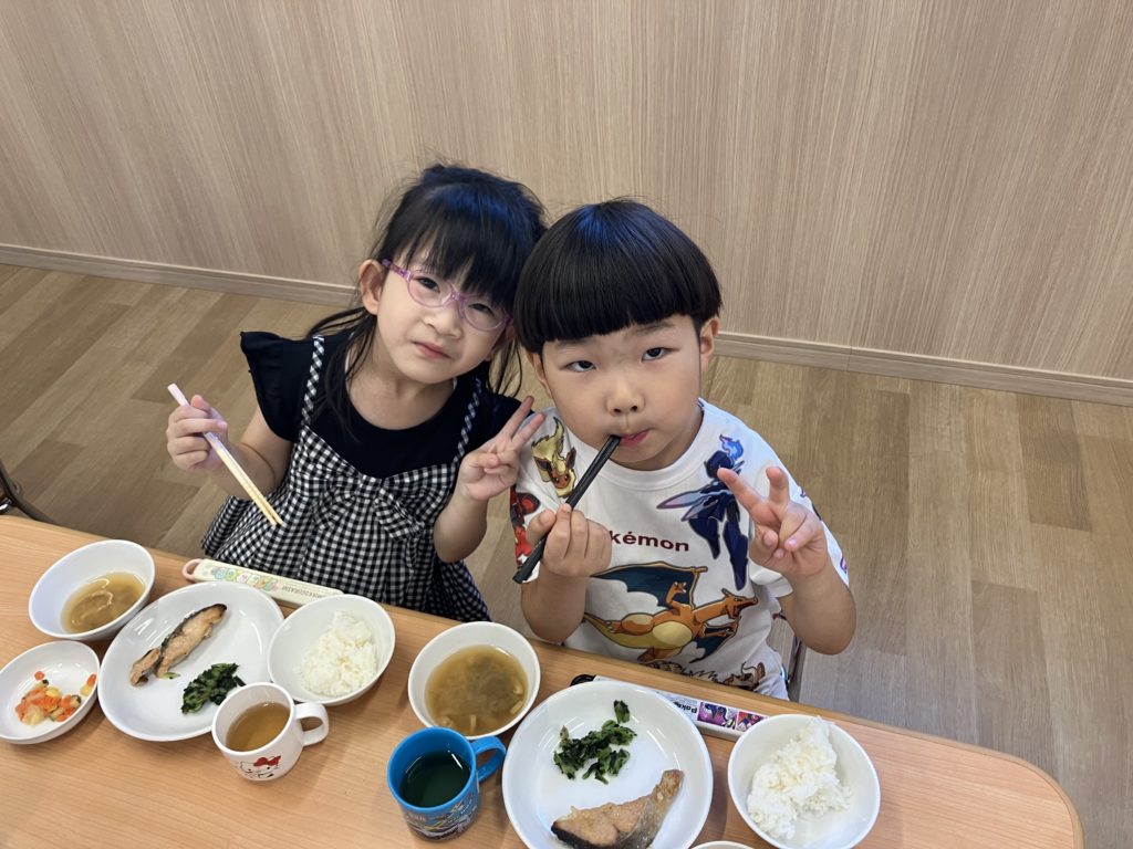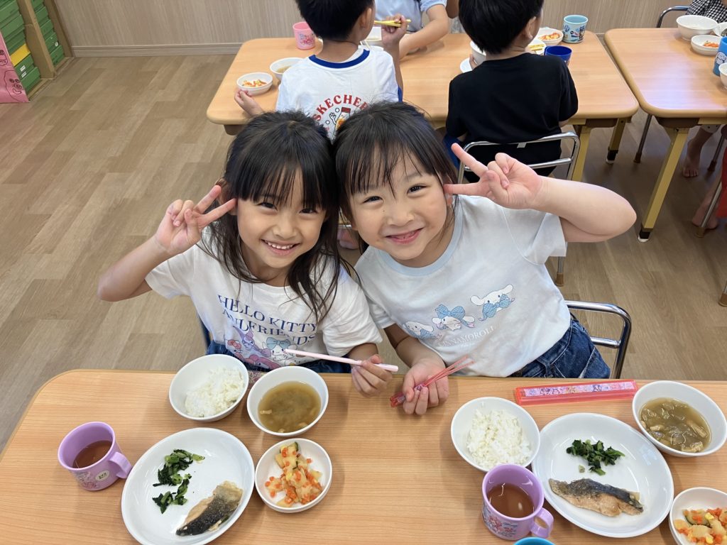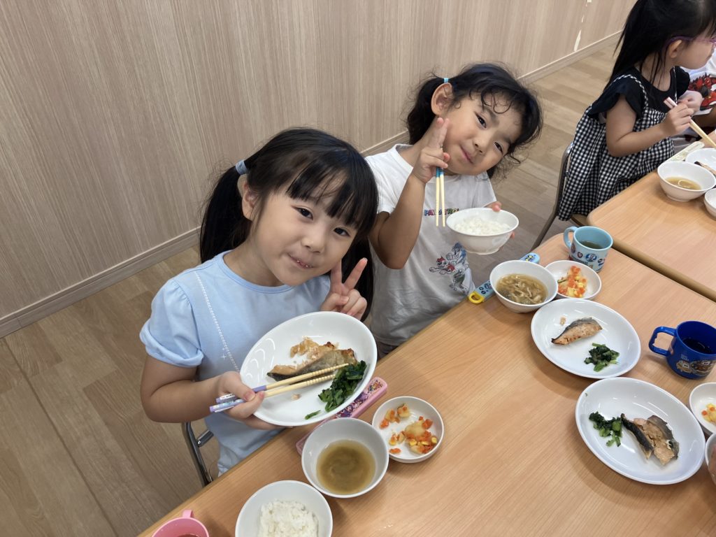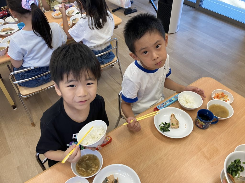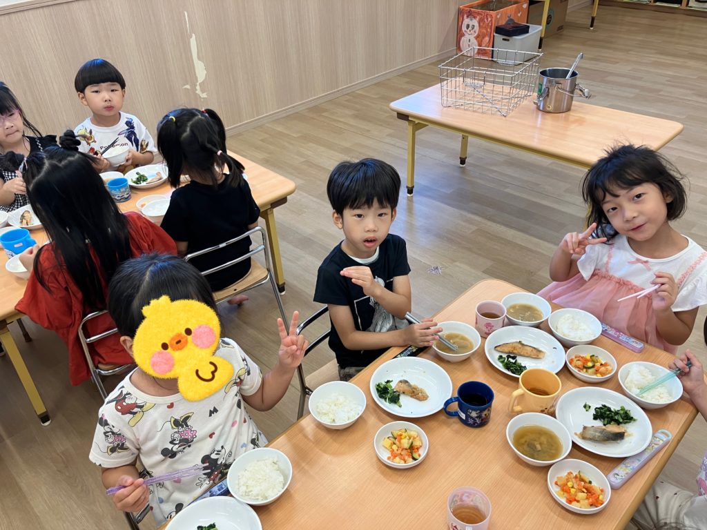 「練習頑張ったからお腹がぺこぺこ🍚」「大好きなお魚で嬉しすぎる💕」と大喜びのくじら組のみんなでした☺️