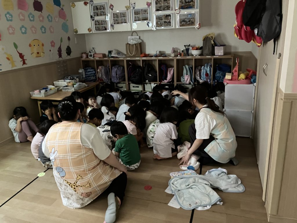 いつもの訓練とは違い、不審者が保育園内に入ってきてしまった時を想定して訓練をしました。