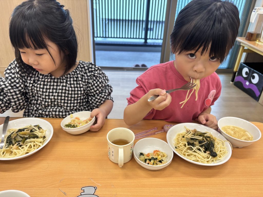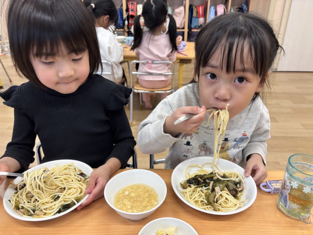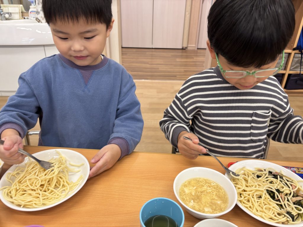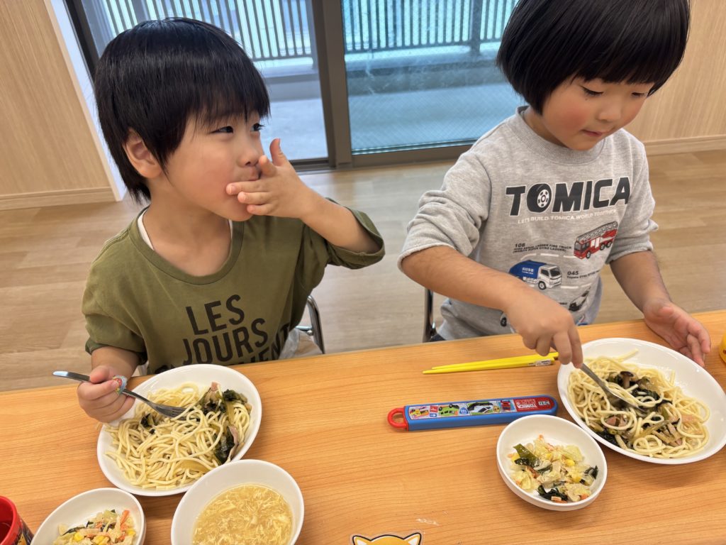 今日の給食はパスタでした🍝いるか組は、フォークでクルクル🍴上手に食べられるよ😊