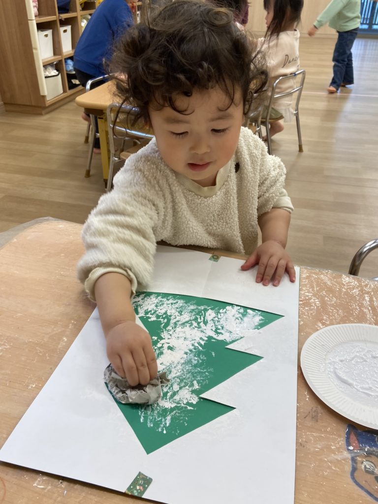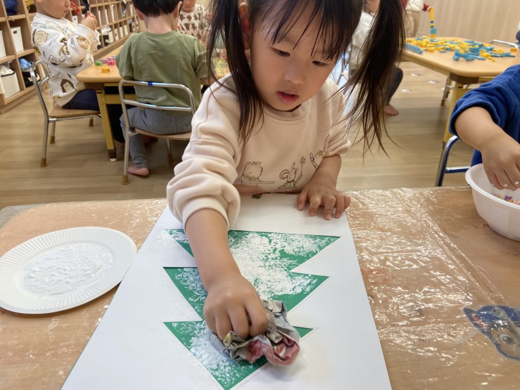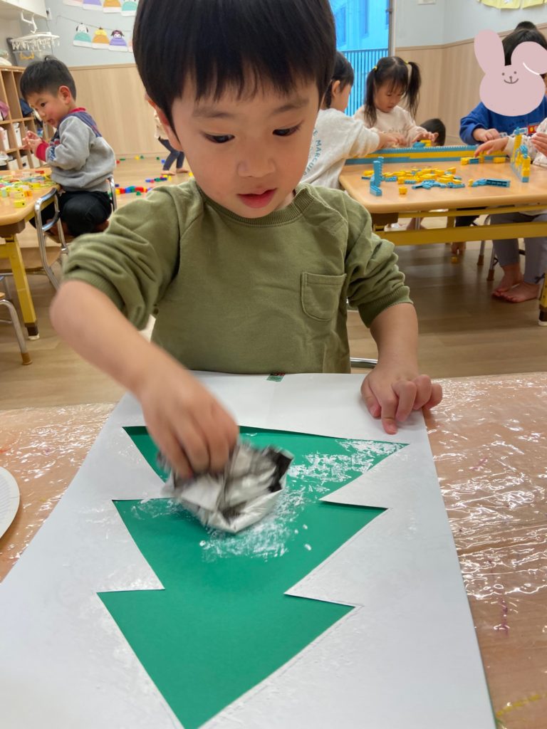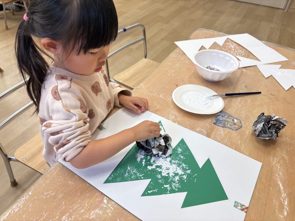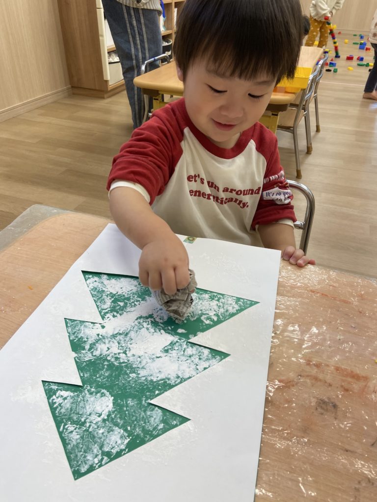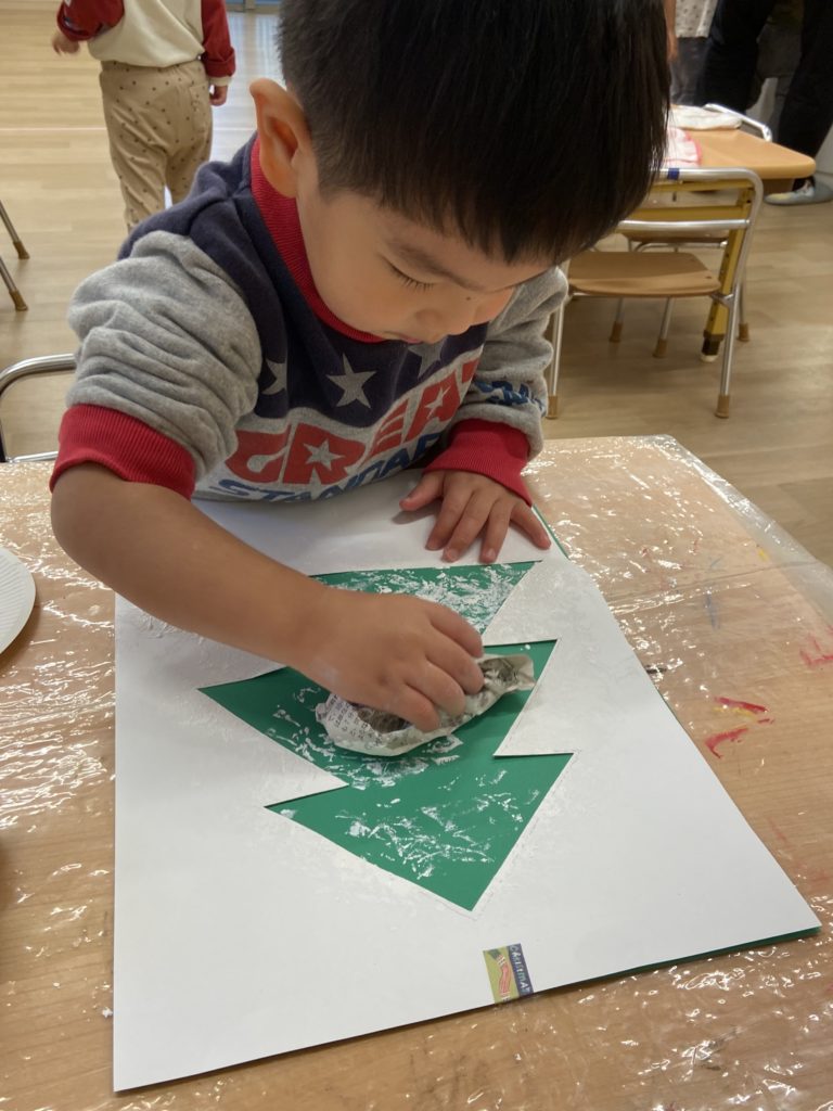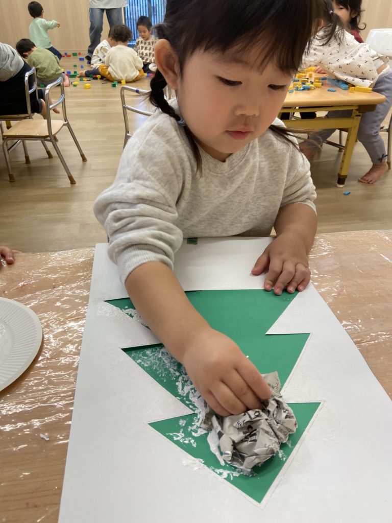 丸めた新聞紙でポンポン楽しくスタンプをしていると、クリスマスツリーが出現!🎄✨