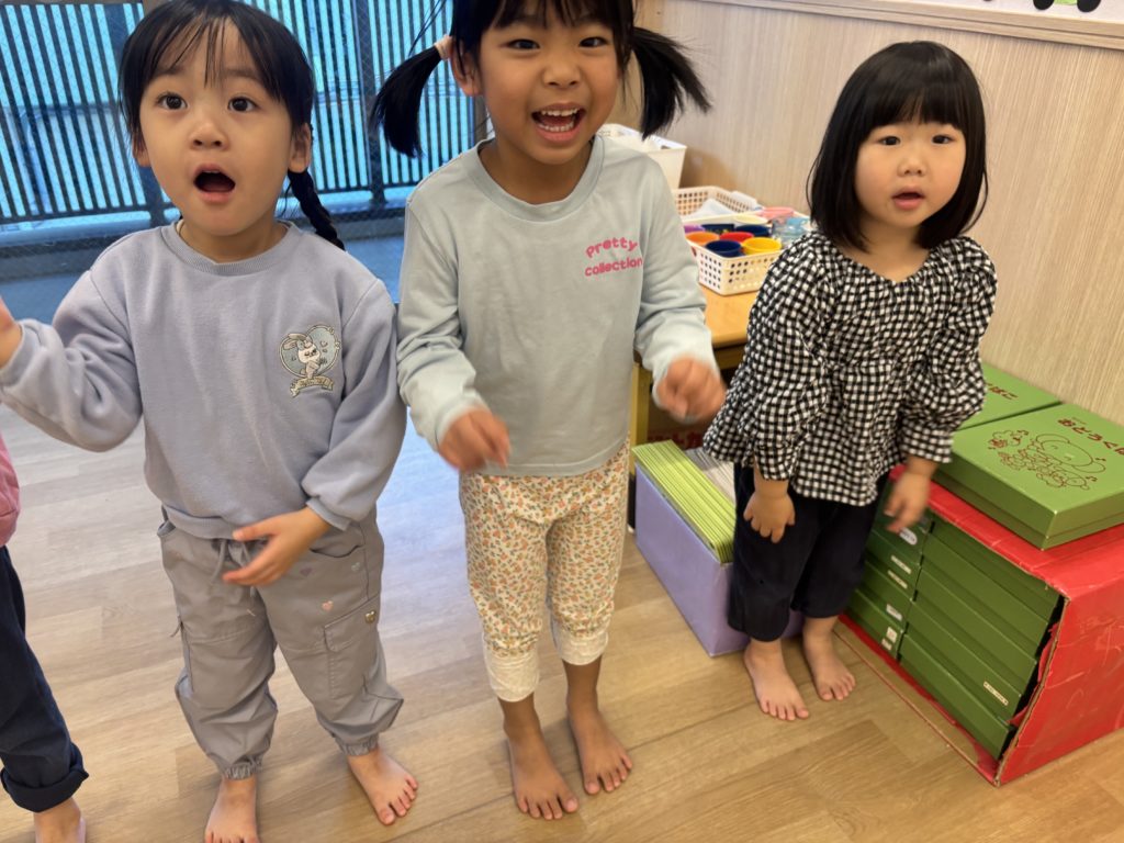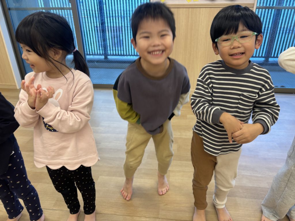 挨拶と準備体操をして、今年も元気に正課体育スタート! ぺんぎん組は、跳び箱とトンネルが大好き! いるか組は、はっぴょう会に向けて楽器遊び🪇 トライアングルや