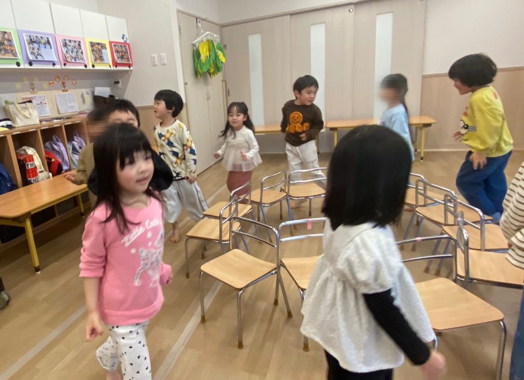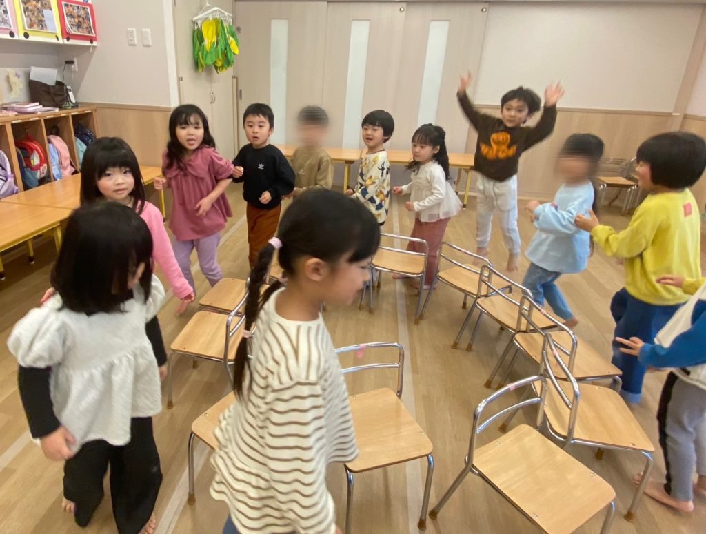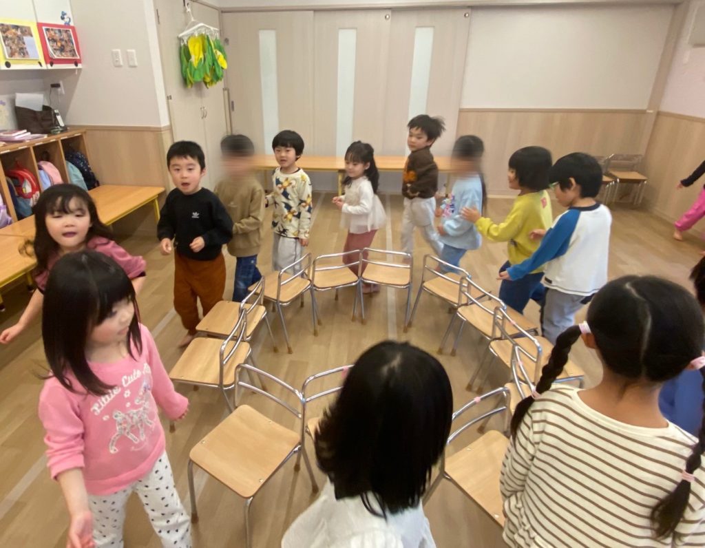 誕生日会のあとはお部屋で椅子取りゲームをしました。子どもたちの好きな音楽を流すとノリノリで身体を動かしながら楽しんでいました!
