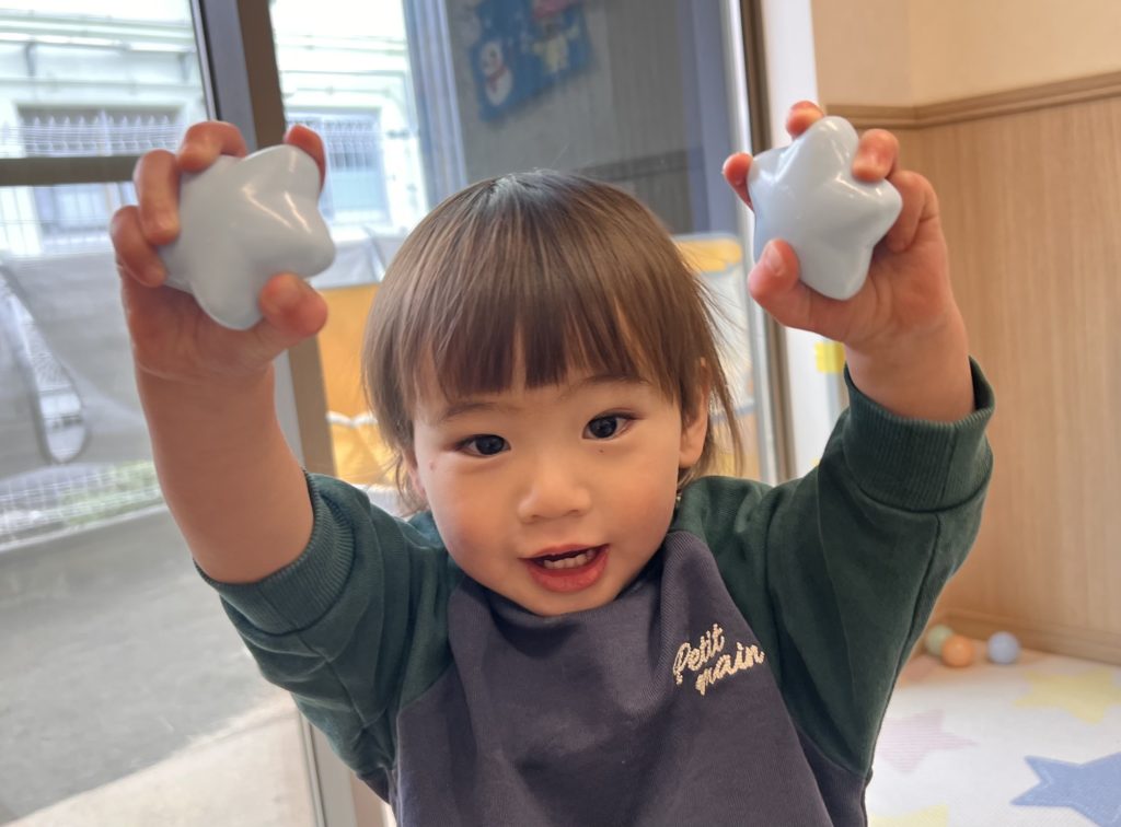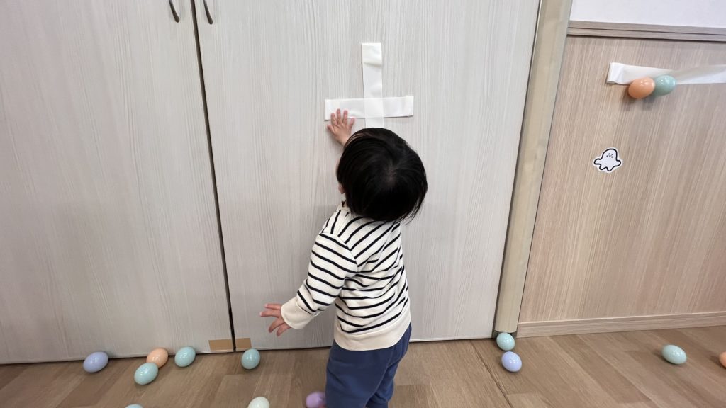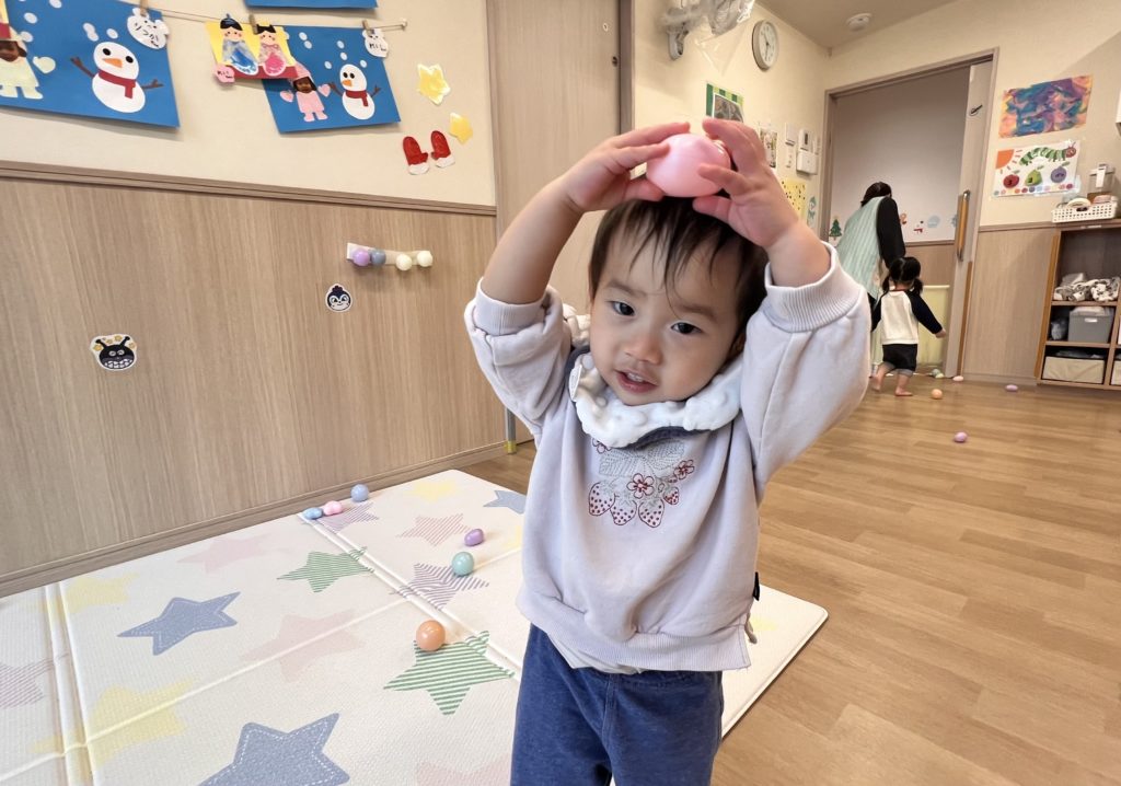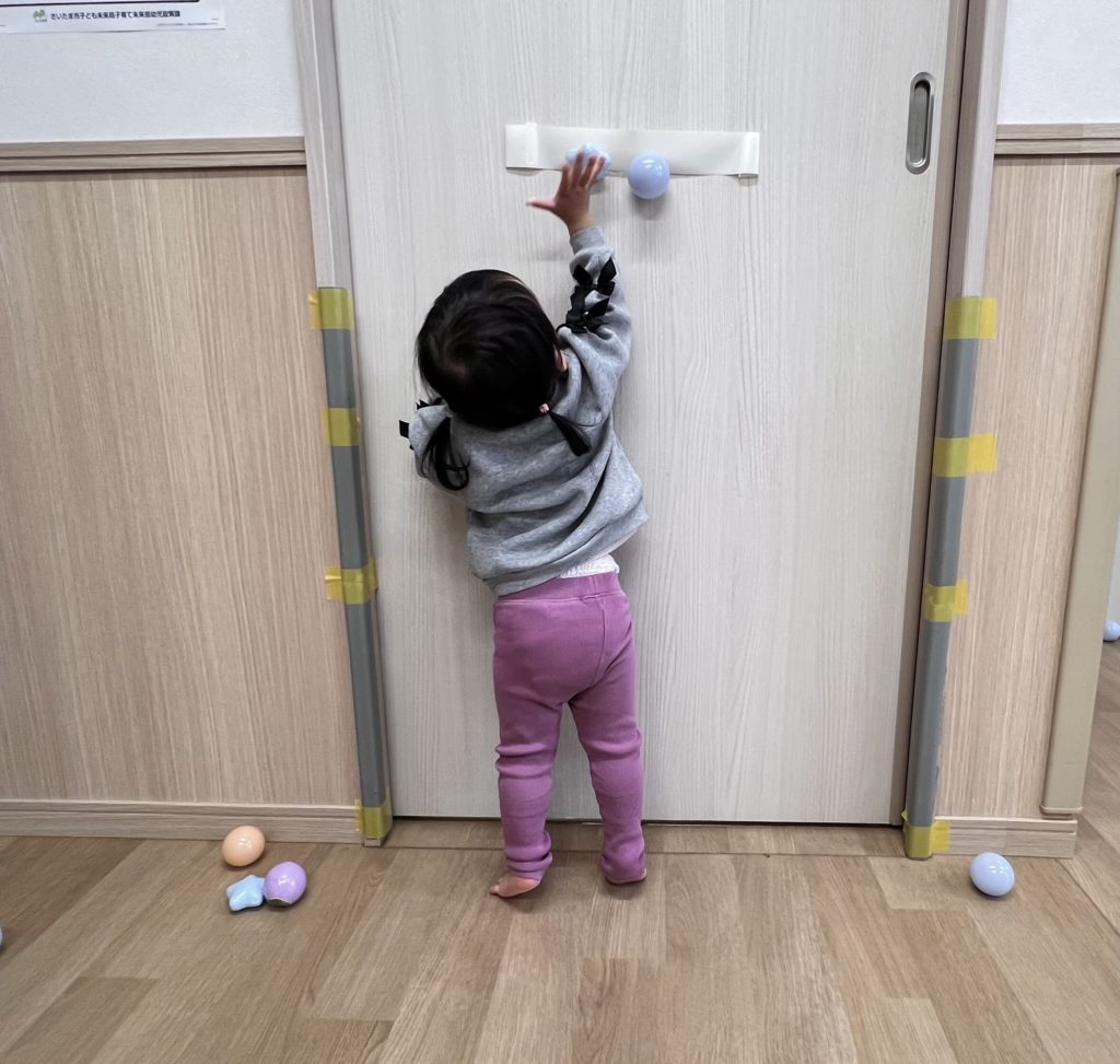 背伸びをしながらテープにボールをくっつけたり、ハートや星の形のボールを見つけると嬉しそうにニコニコしていました☺️