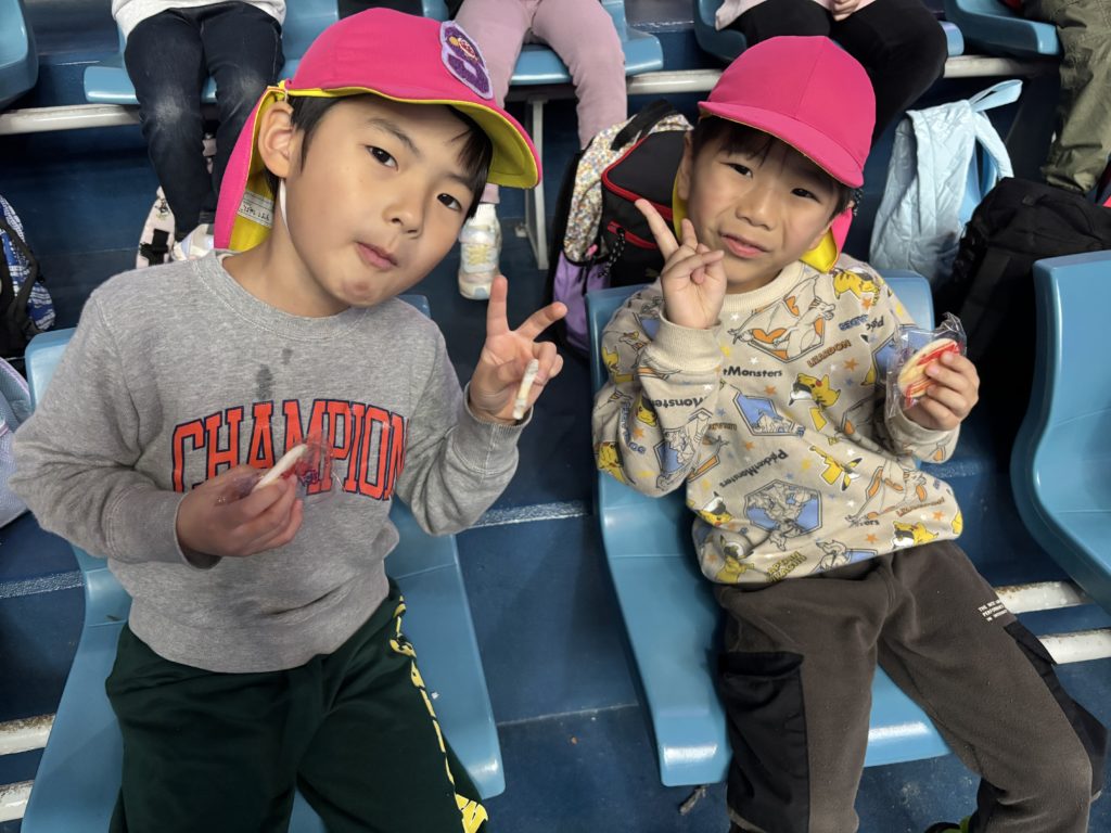 待ちに待ったお弁当🍱「からあげあるよー!!いちごあるんだー!!おにぎりだよ!」みんな、とても嬉しそうに食べていました😄