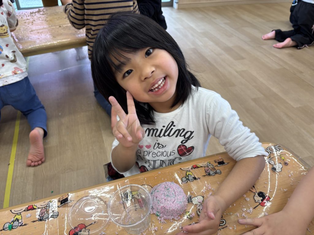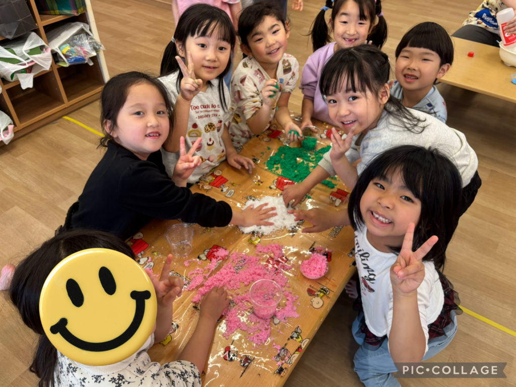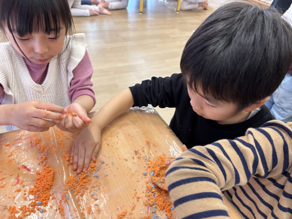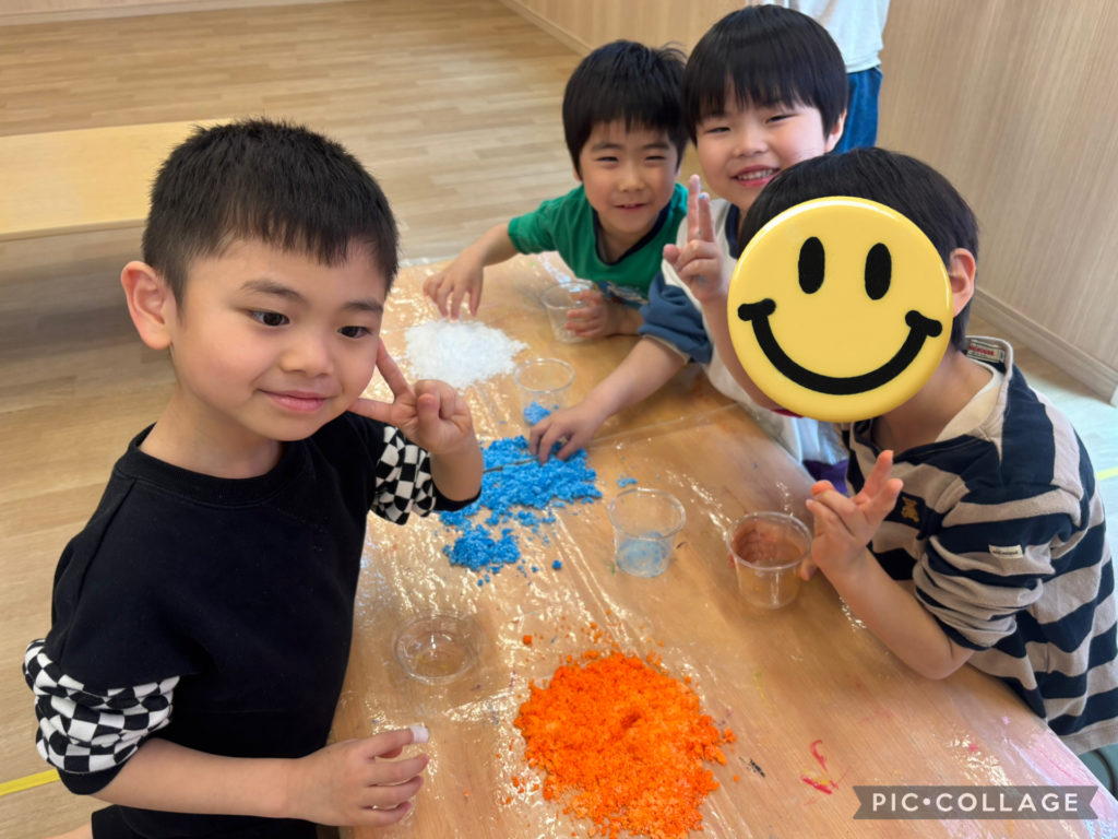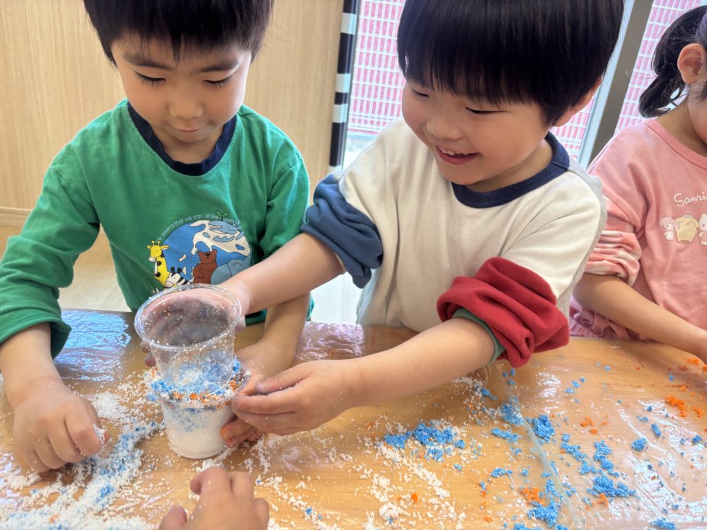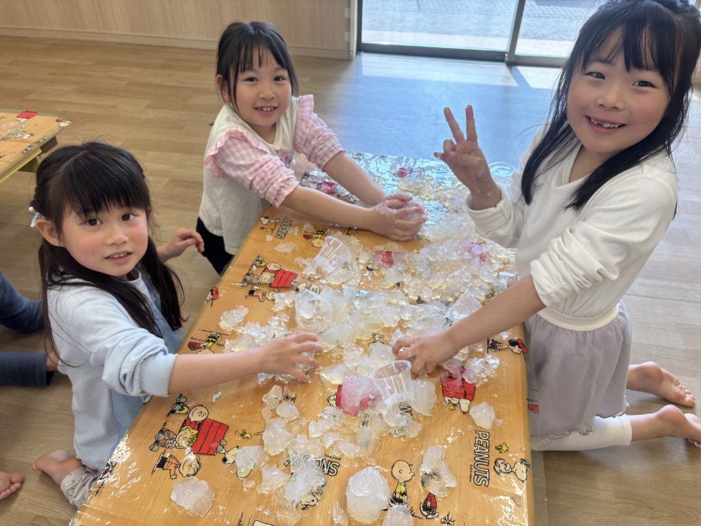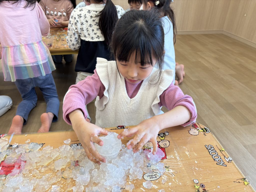 スライムを触ったり、インスタントスノーに絵の具を混ぜてカラフルな雪を作ったり、寒天を小さくして、ゼリーを作ったりしました!
