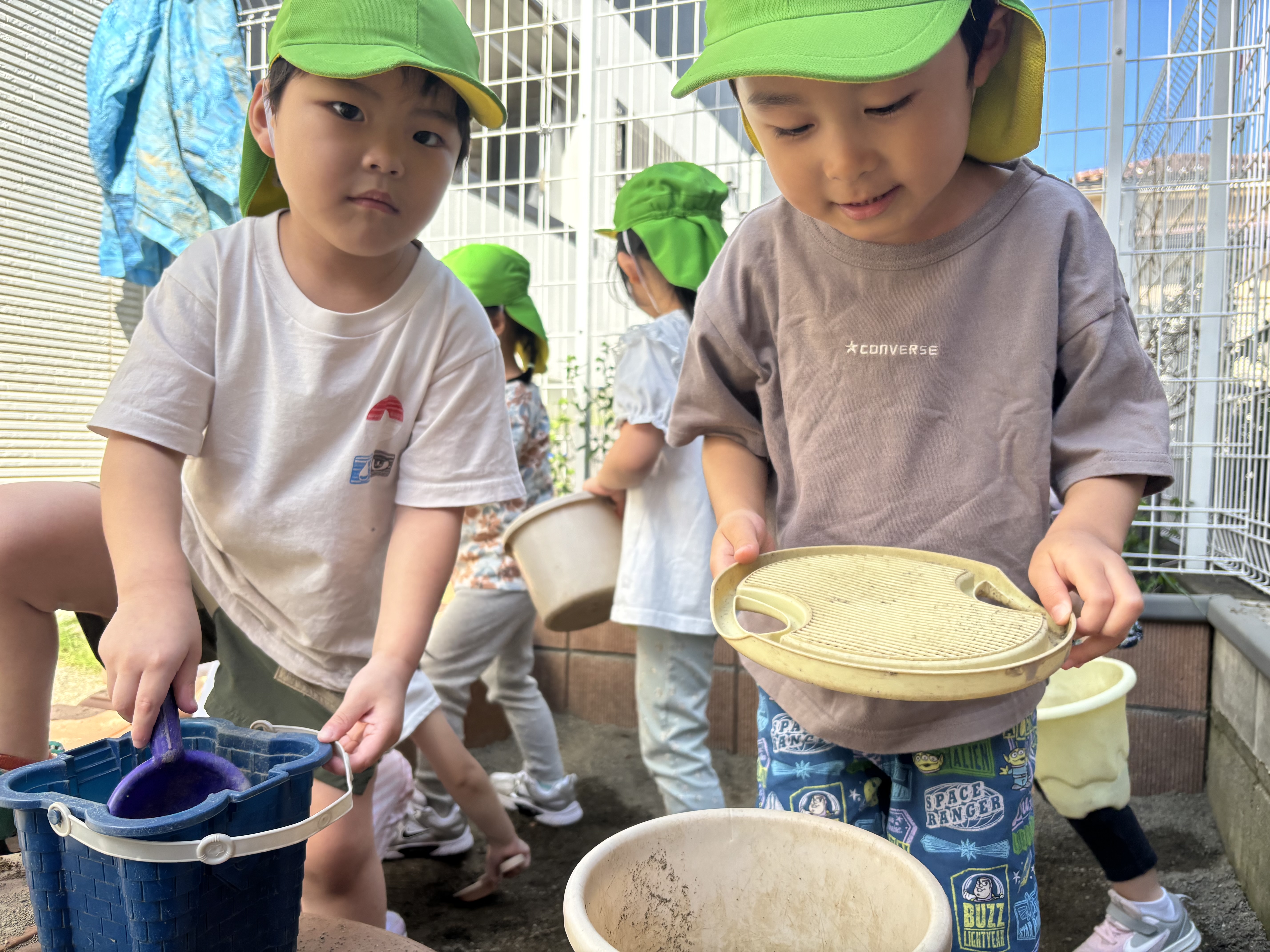 お砂場では、いるか組のケーキ屋さんが開店🎂 あざらし組は、プラレール遊び🚃