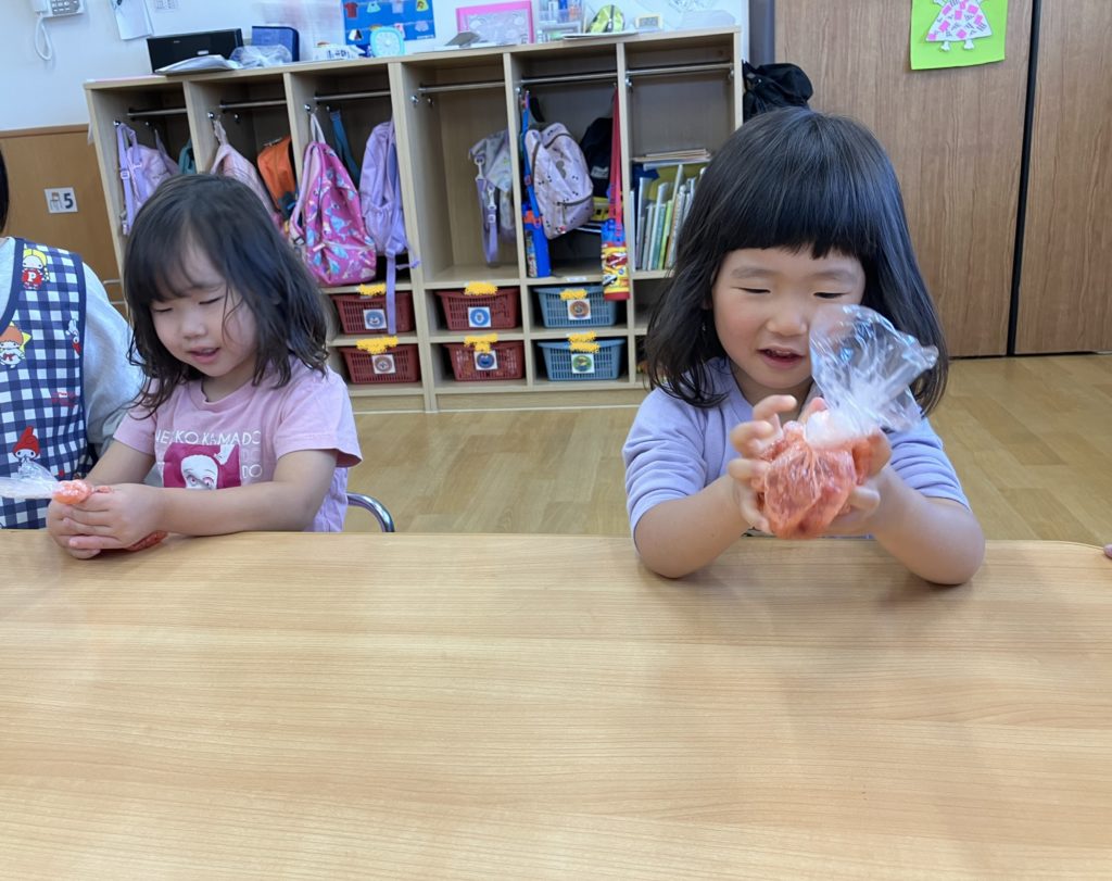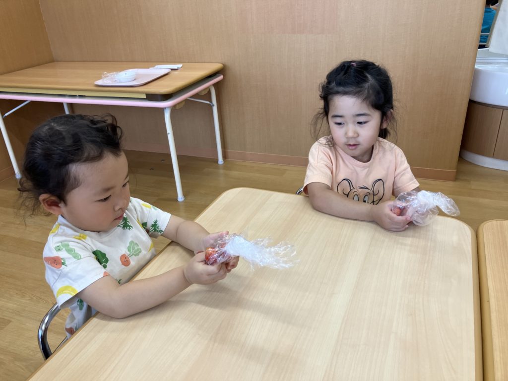 いちごの匂いを嗅いだり、潰す感覚を楽しむ子どもたちでした!