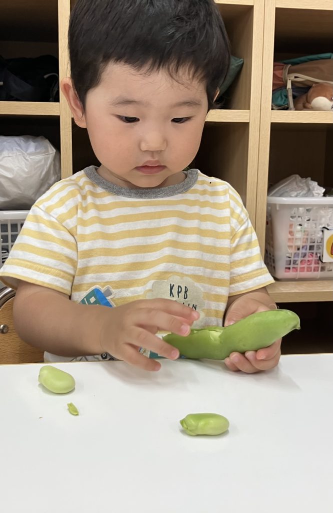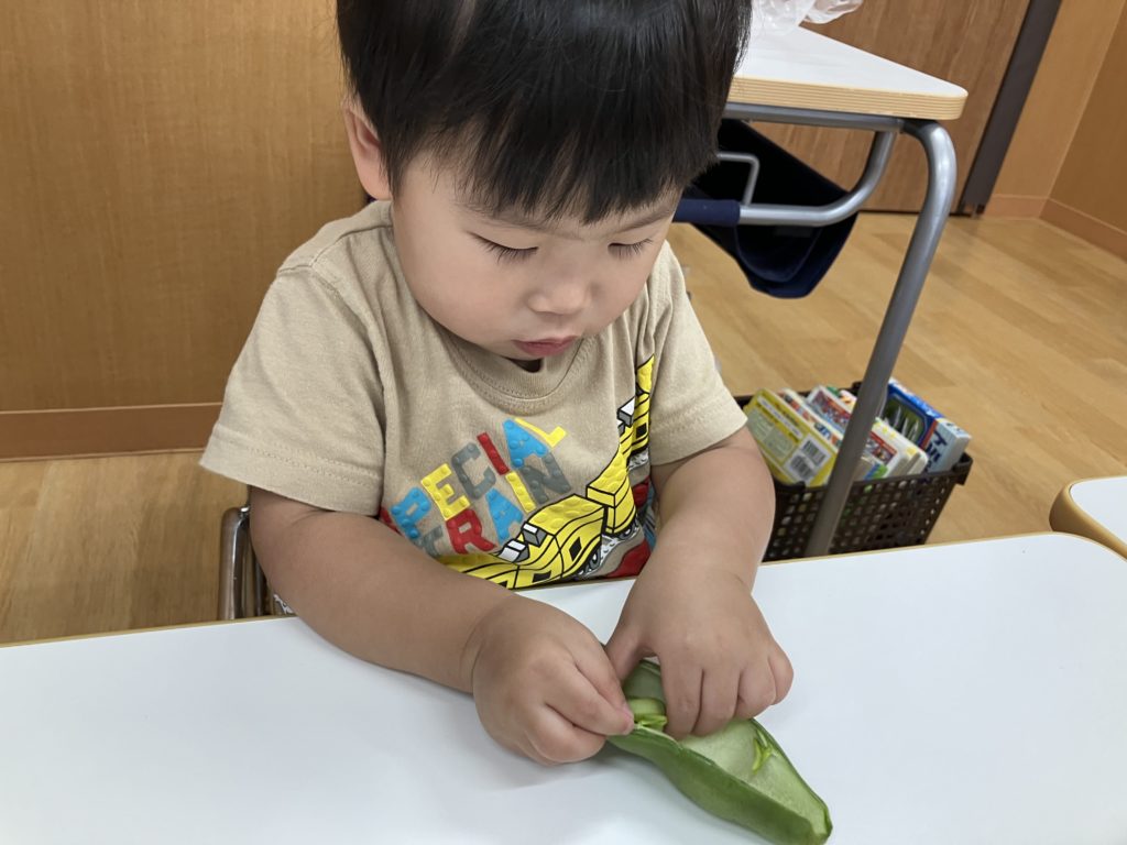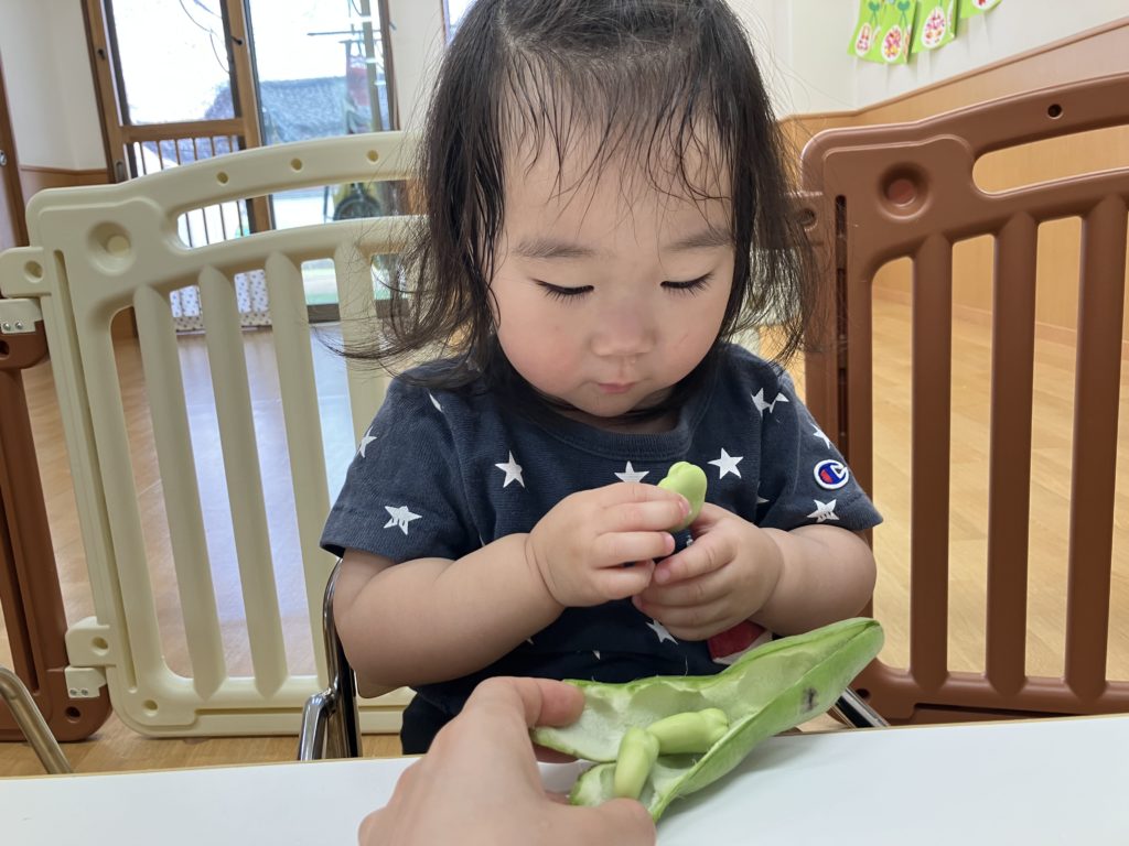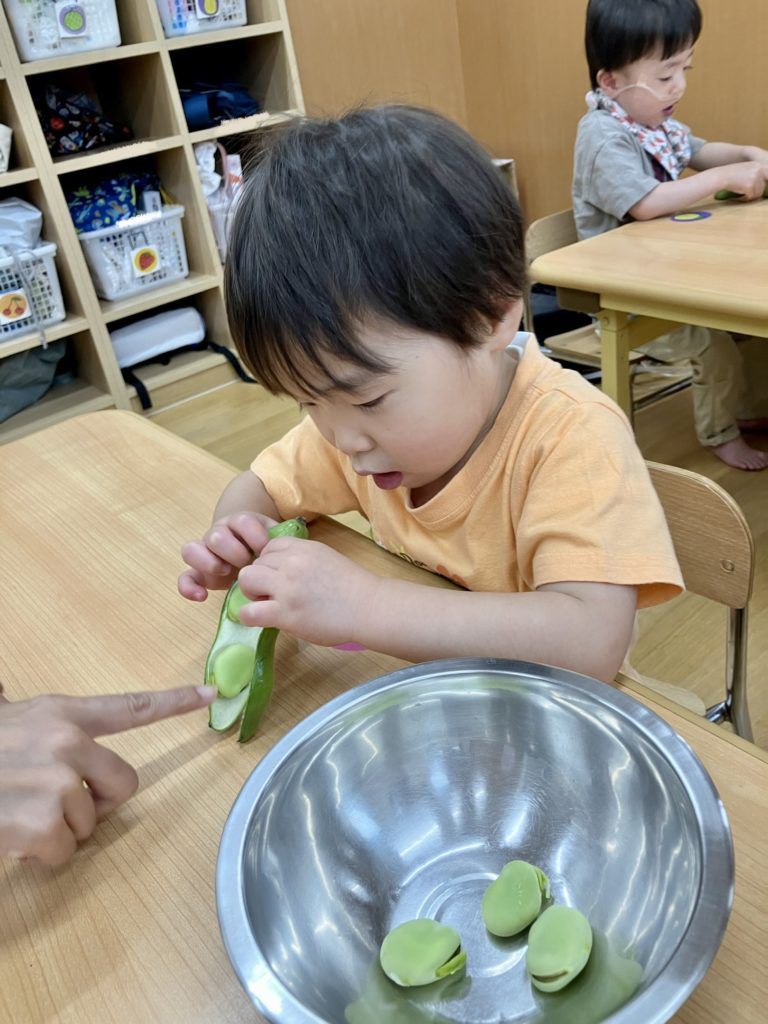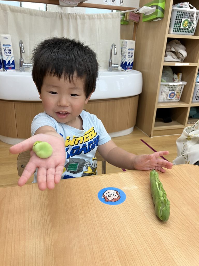 ペンギン組では、「そらまめくんのおやすみなさい」の絵本を読んだ後、そら豆の皮むきを行いました!!絵本で見たそらまめくんのベッドを思い出して「フワフワだね!」と言う子どもたち✨上手に剥く事が出来ました😊