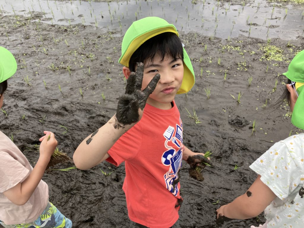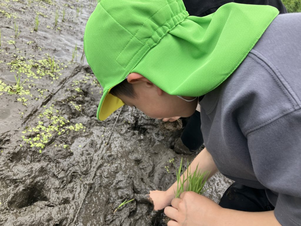 田植えをする場所に着き、いざ田植えが始まると、足場がぬかるんでいて、ヨロヨロしながらも頑張って歩いていました😊
