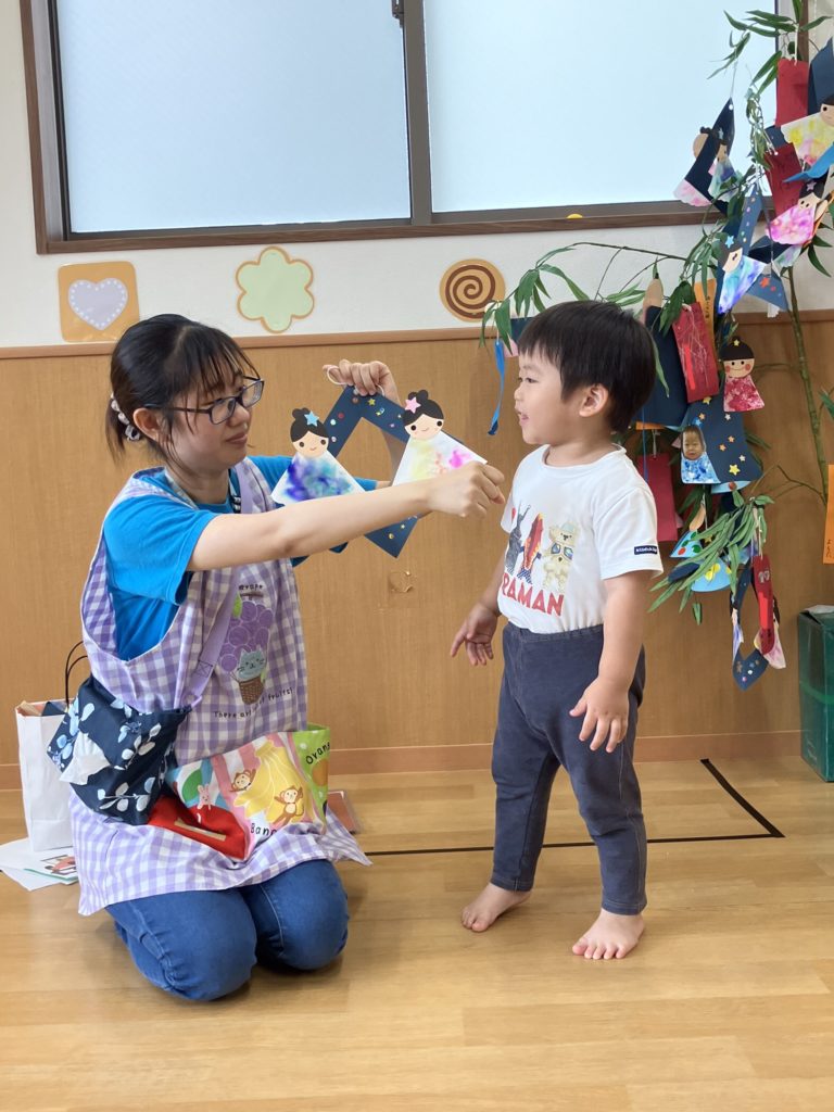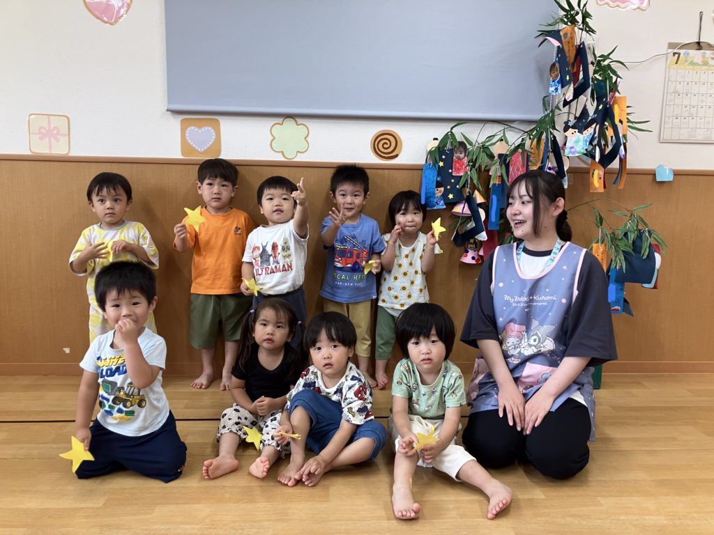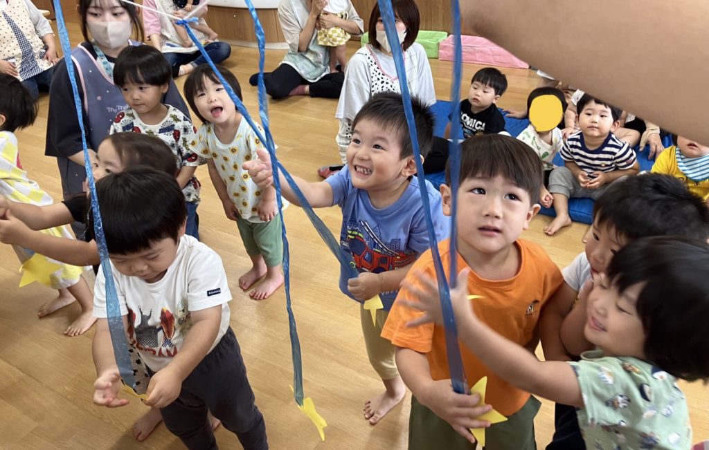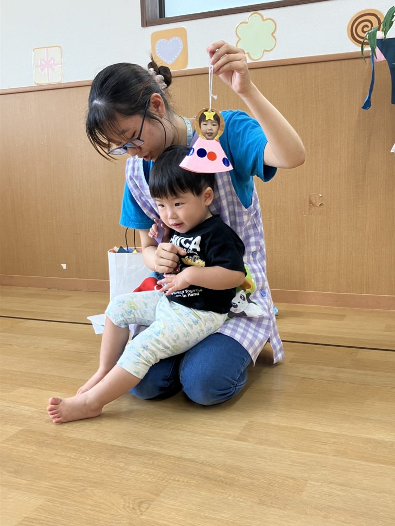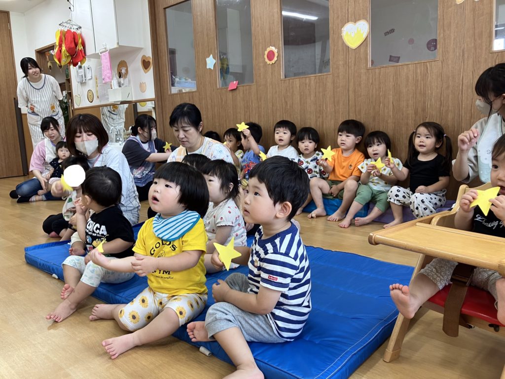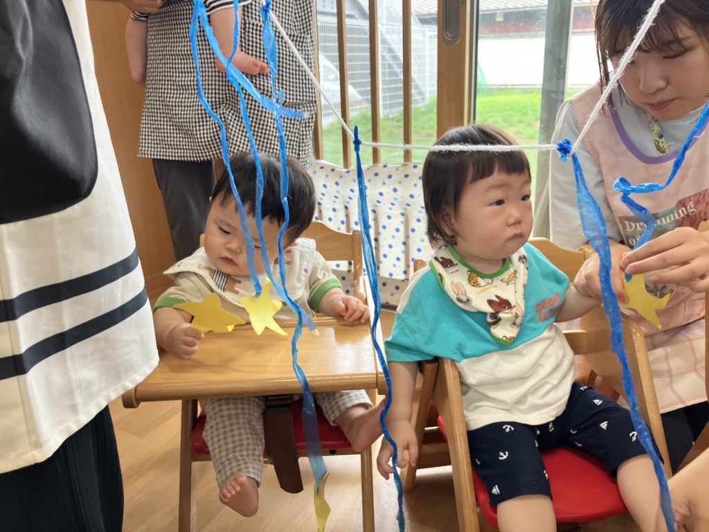 次に乳児クラス!七夕の由来を知った後に「星を捕まえよう⭐️」というミニゲームを行いました。取ったお星様を揺らしながら「たなばたさま」を歌いましたよ♪