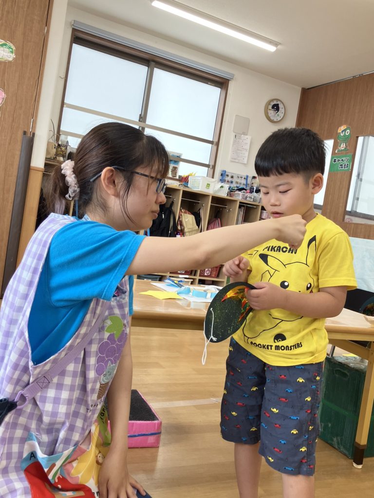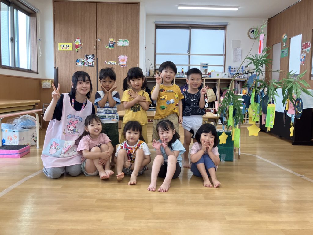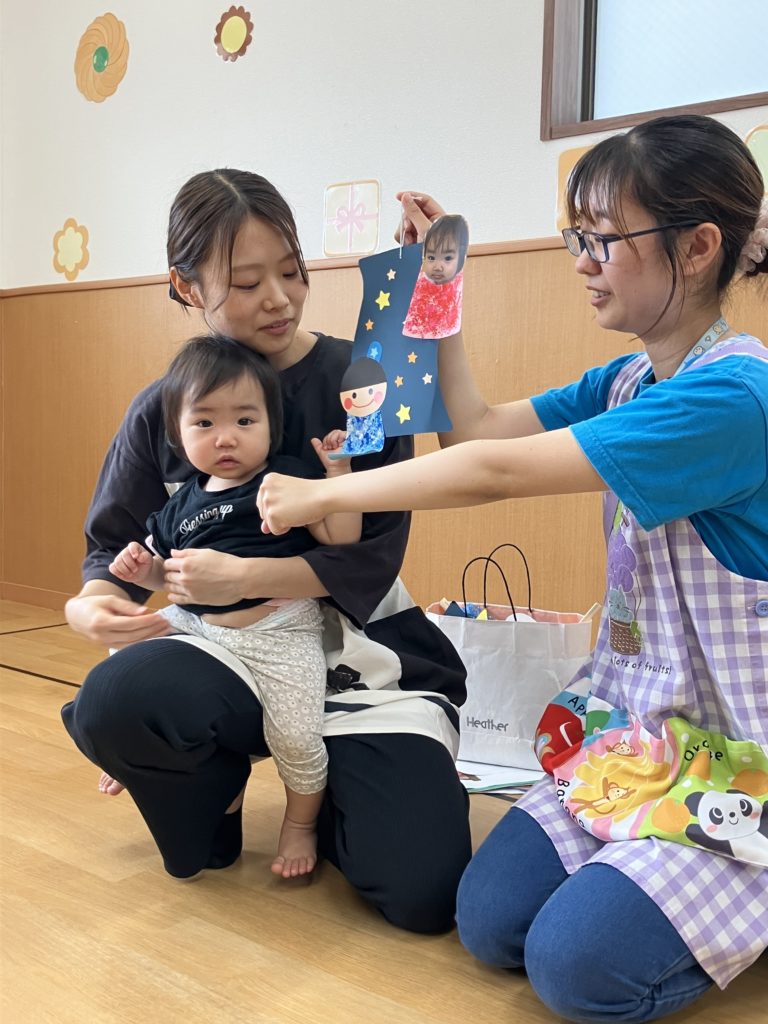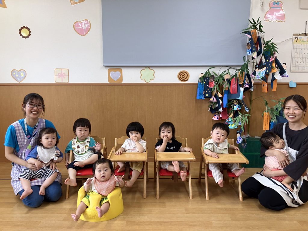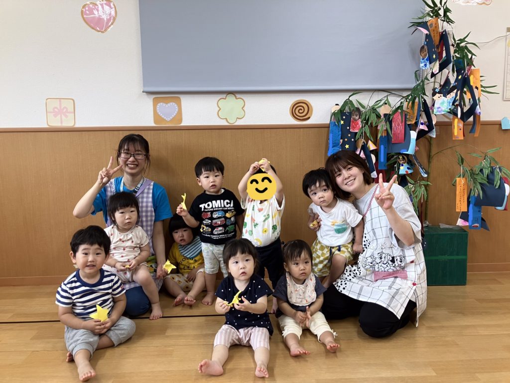 次に乳児クラス!七夕の由来を知った後に「星を捕まえよう⭐️」というミニゲームを行いました。取ったお星様を揺らしながら「たなばたさま」を歌いましたよ♪