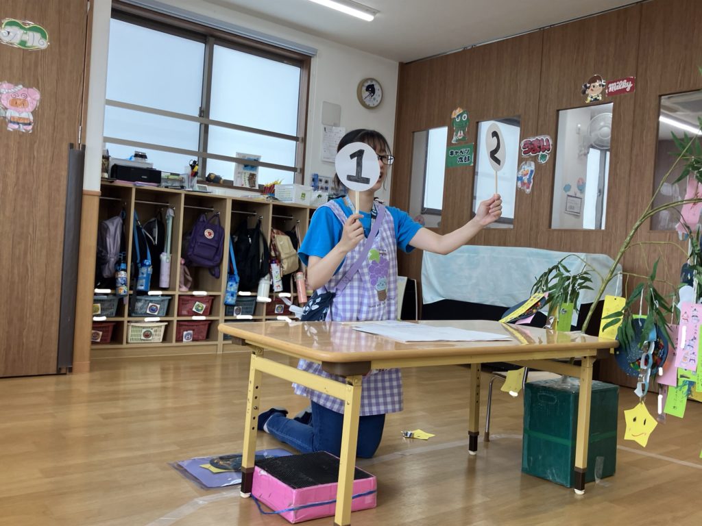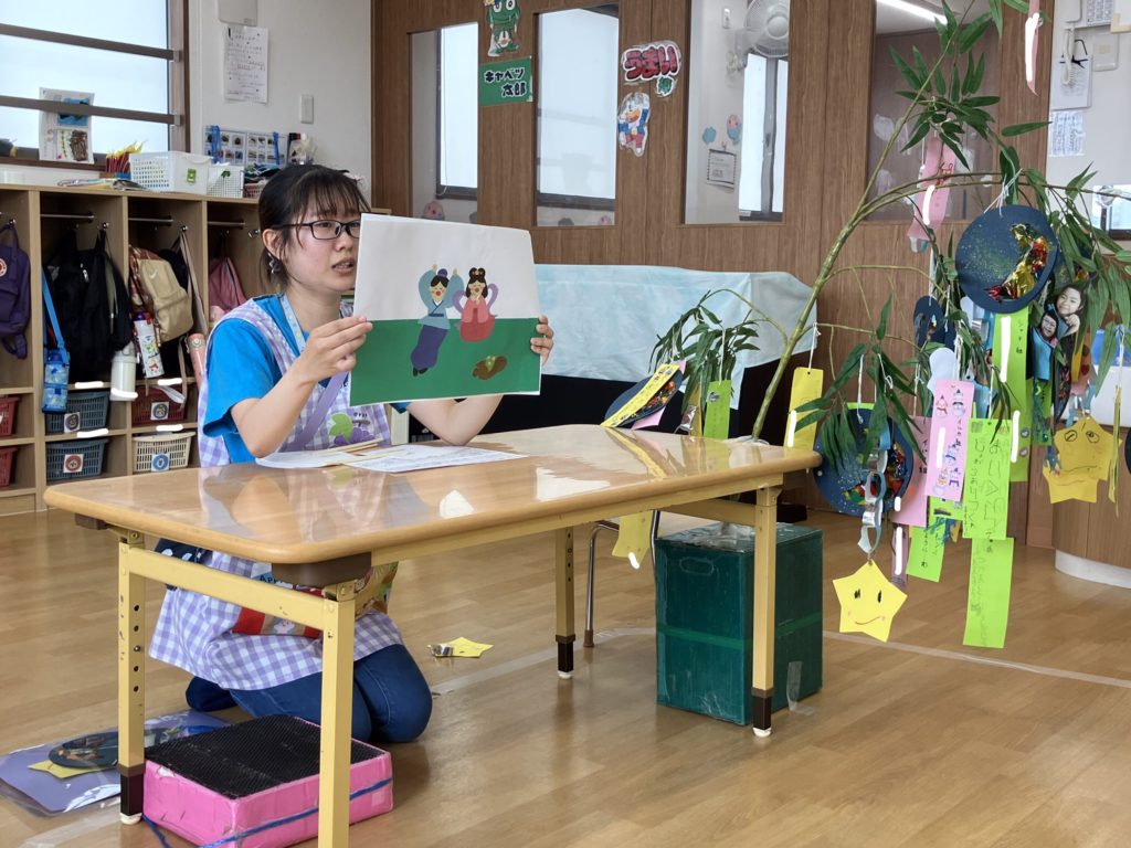 まずは幼児クラス!カードシアターで七夕の由来を知った後はクイズをしました!正解すると大盛り上がりの子どもたちでした!