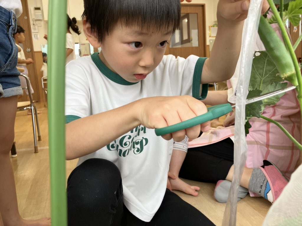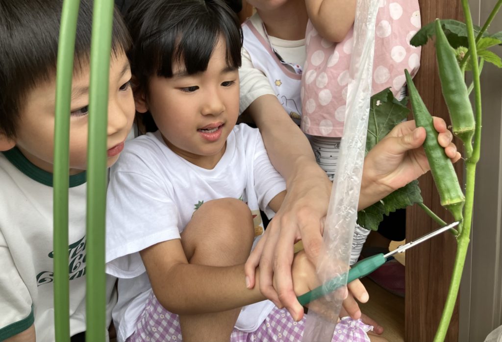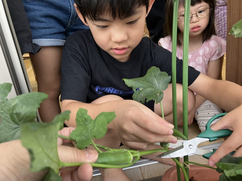 今日はシャチ組が夏野菜で育てていたオクラを収穫しました!☺️