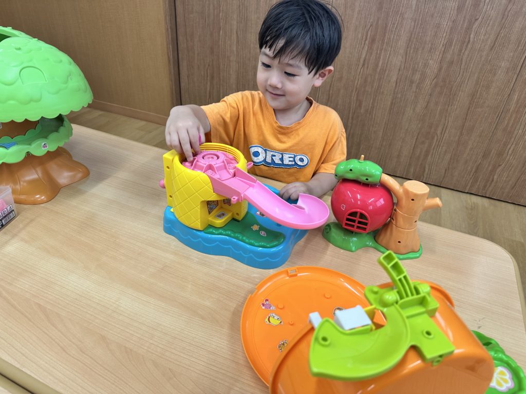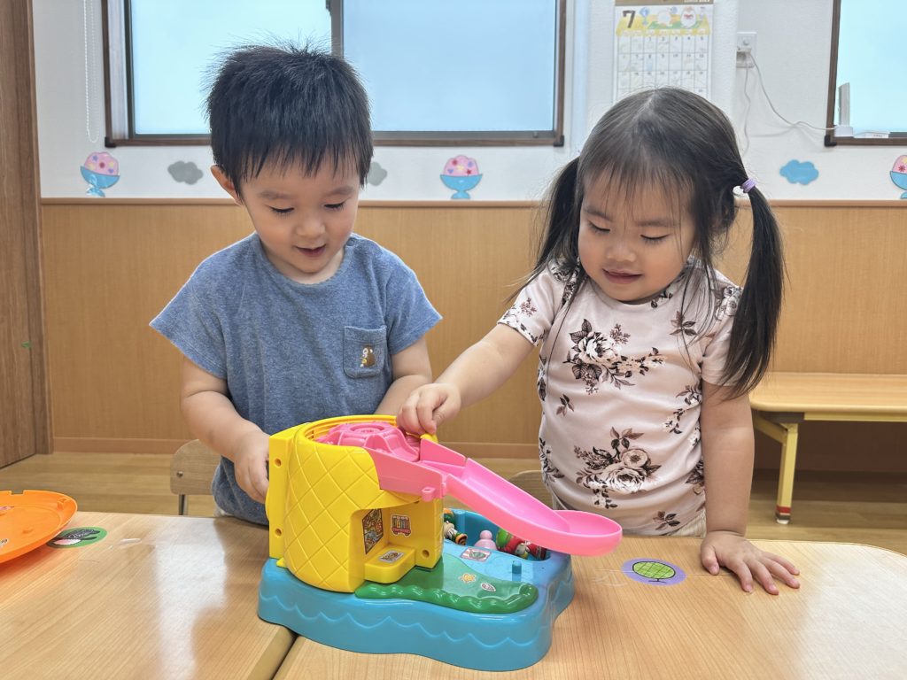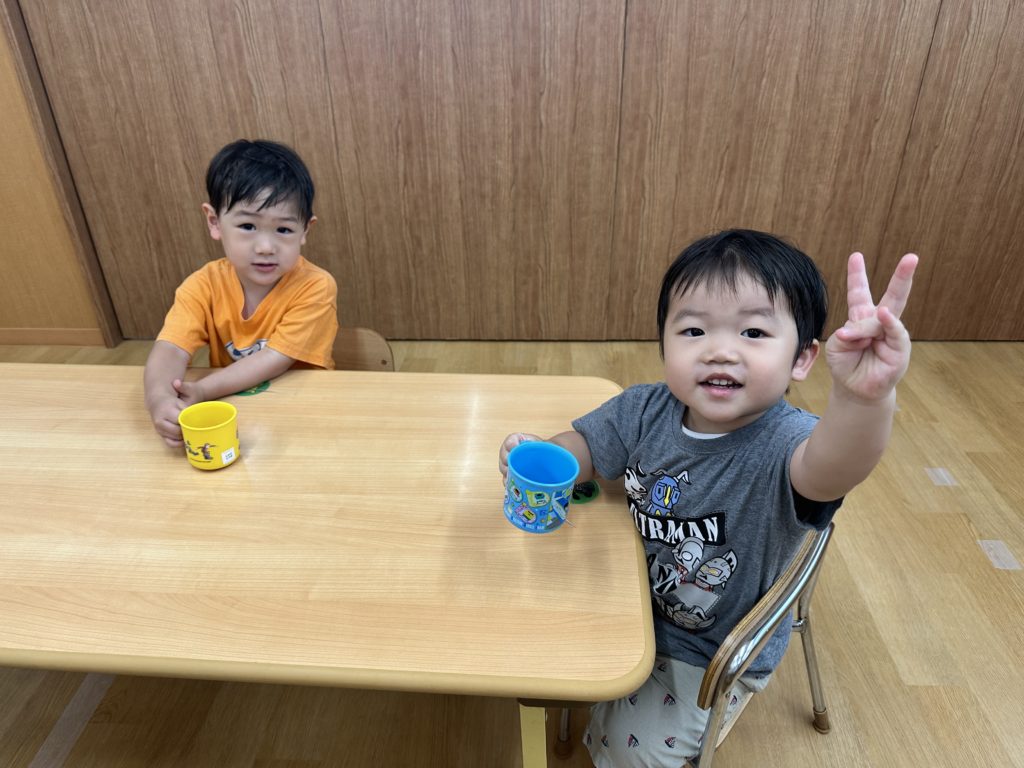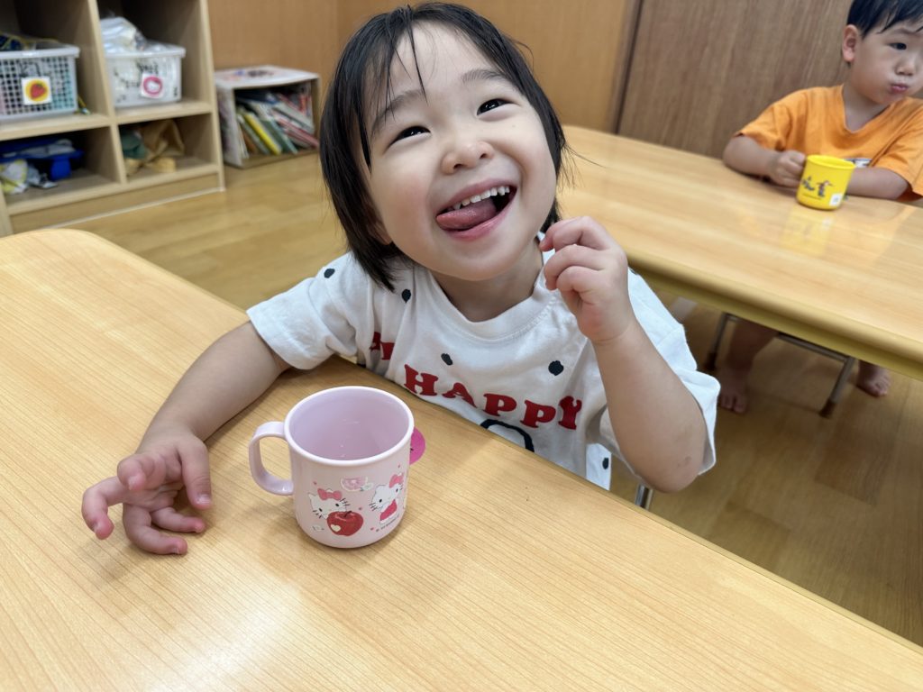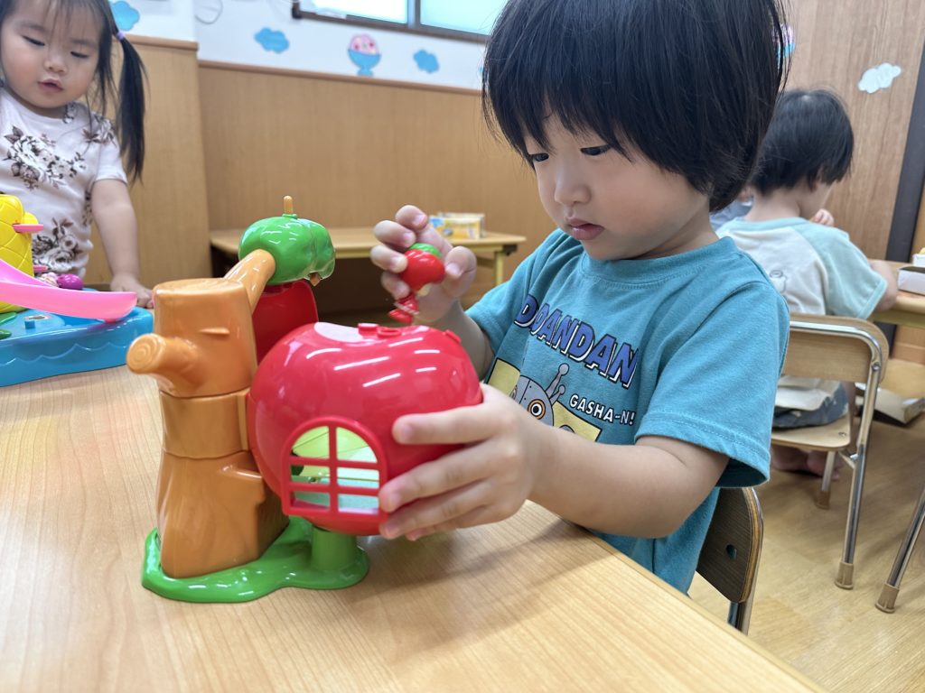 水遊びの後、水分補給をしてからお気に入りの玩具で遊びました☺️