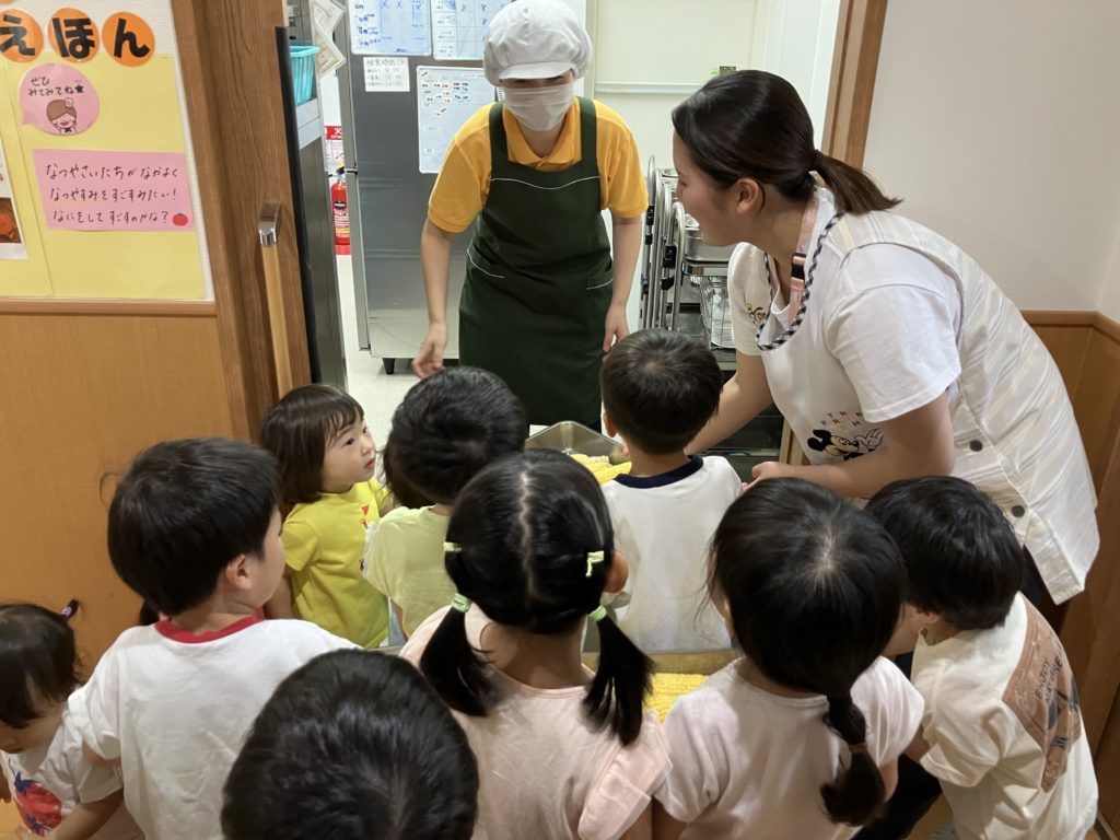 剥き終わったとうもろこしを給食室にお届け♪子どもたちが剥いたとうもろこしは美味しいおやつになって出てきました!!