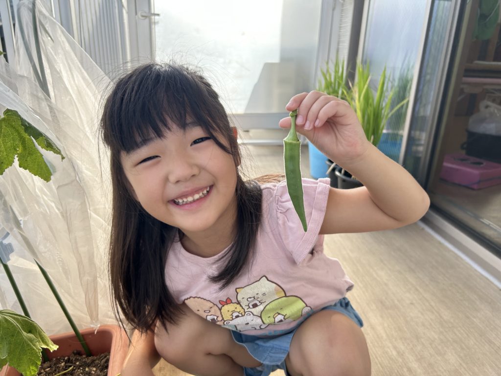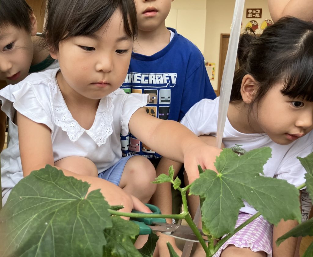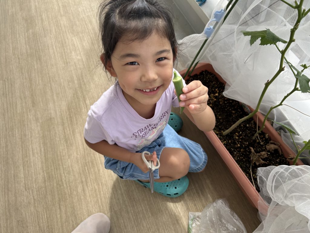 自分でハサミを使ってオクラを取ることで、オクラの感触や匂いを楽しんでいました😊