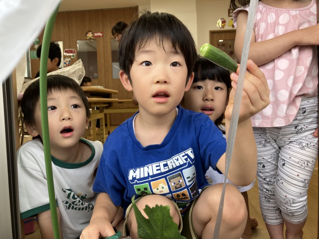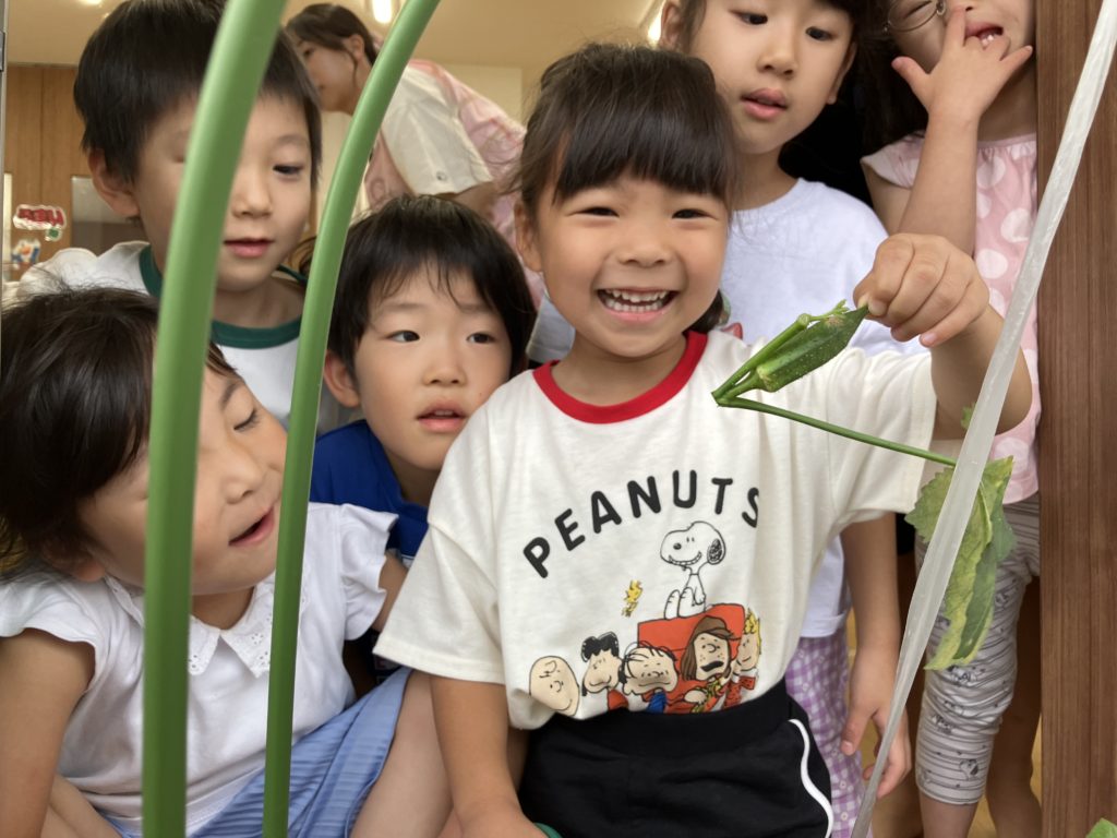 子どもたちは「ちょっと硬くなってるね!」や「このオクラはとても長く育ってるね!」等、気づきをお友達に教え合いながら行っていました🌻