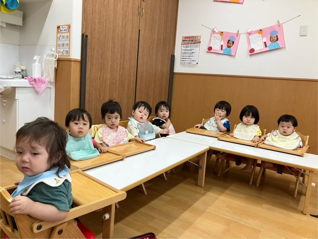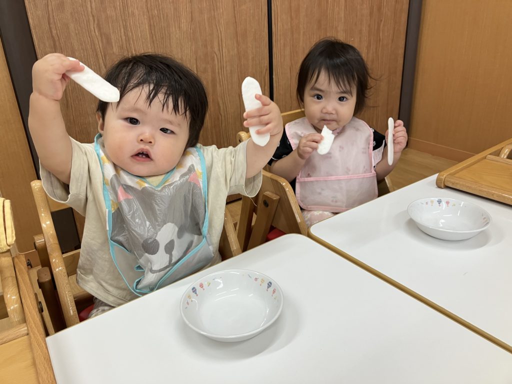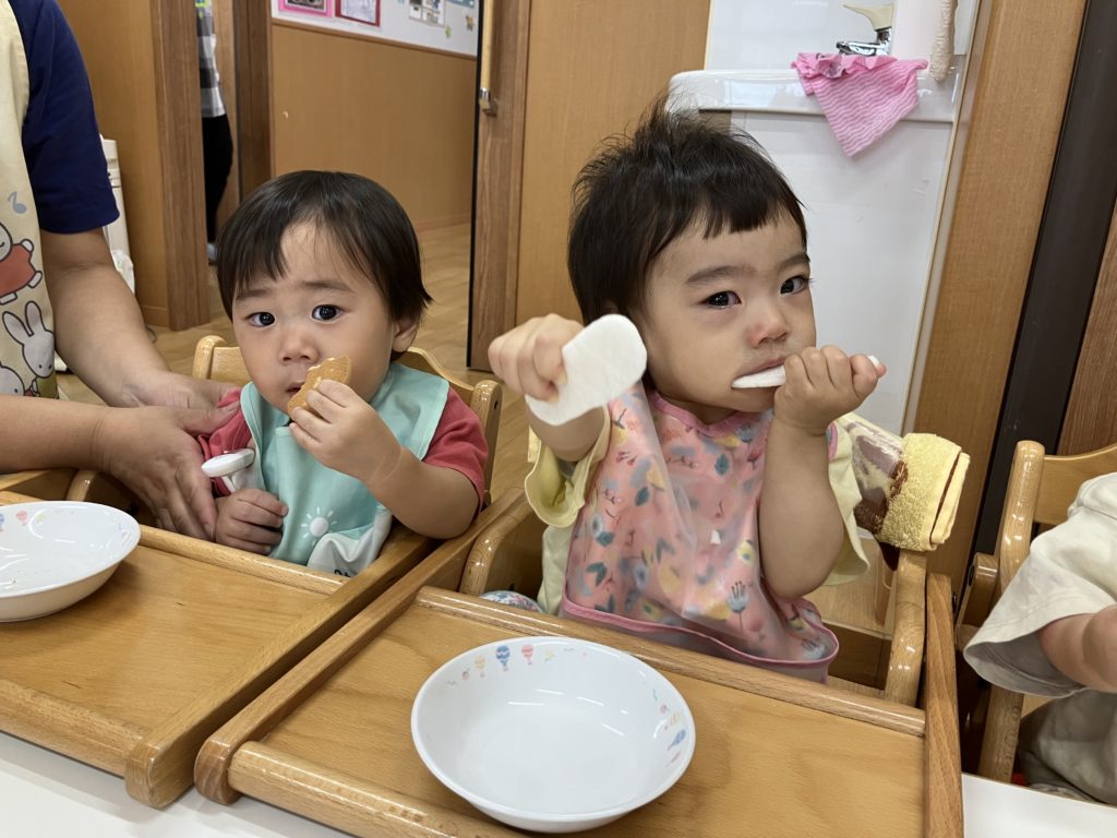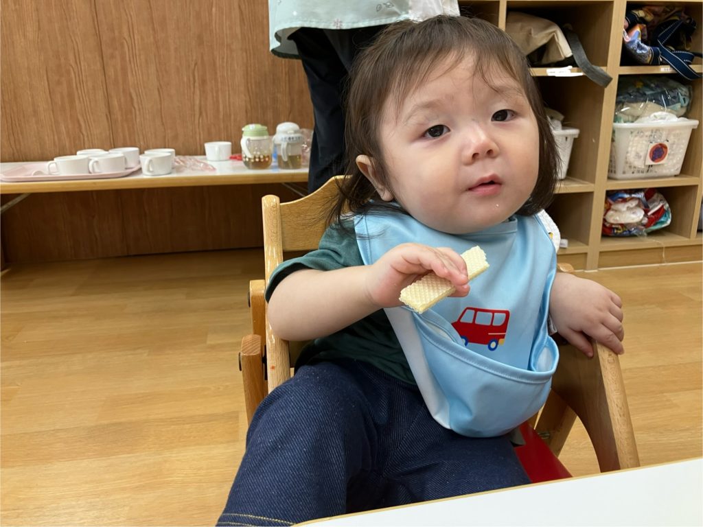 朝の会にも慣れてきたラッコ組さん!朝おやつも楽しく食べました✨