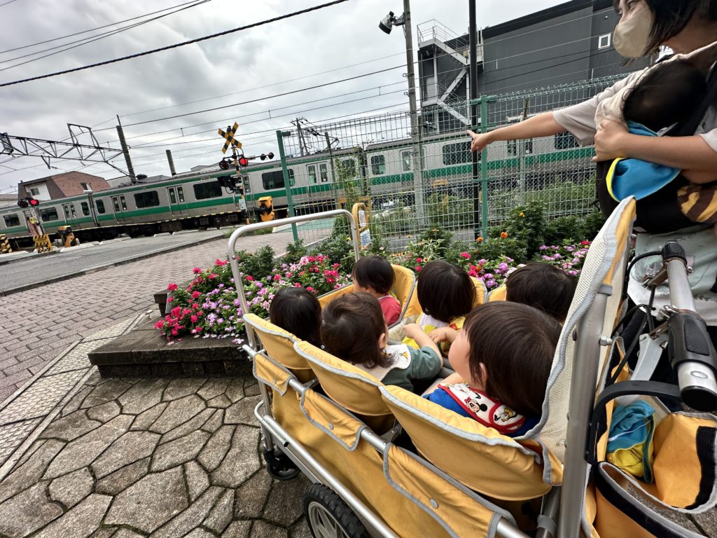 線路沿いを歩いて踏切で電車を見てから保育園へ帰ってきました🚃