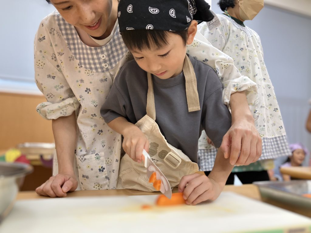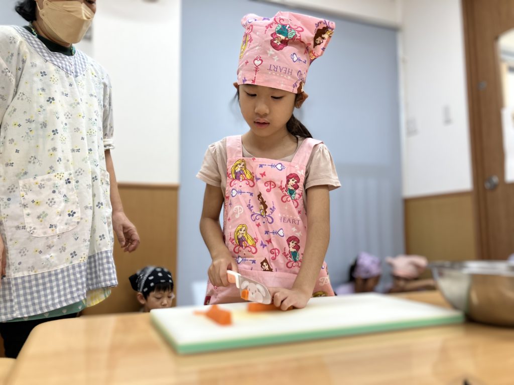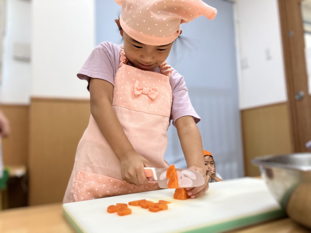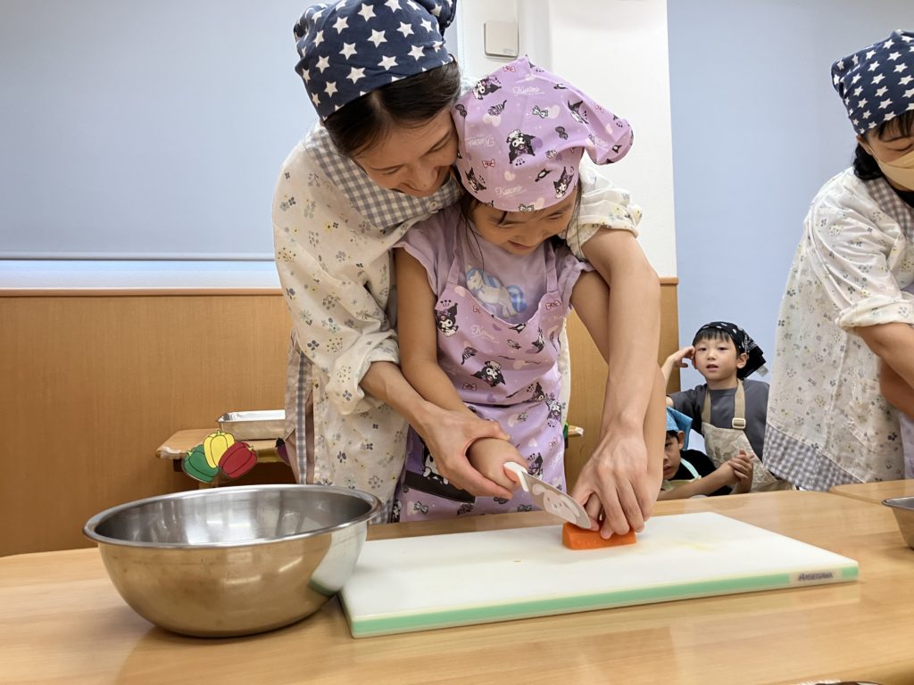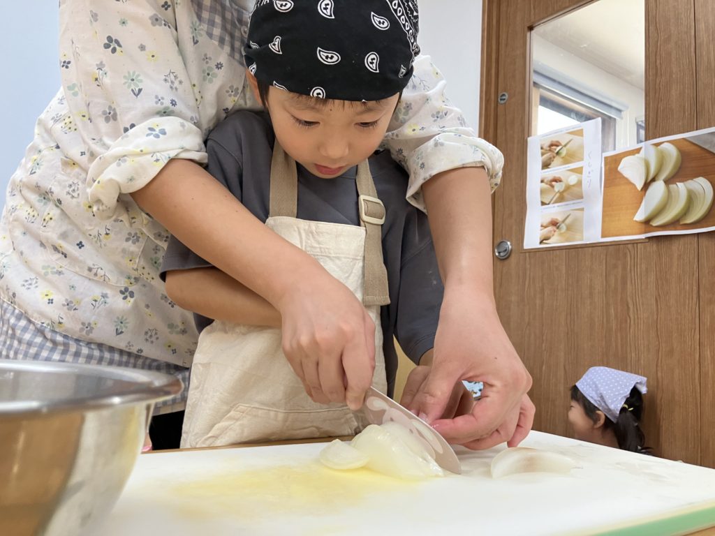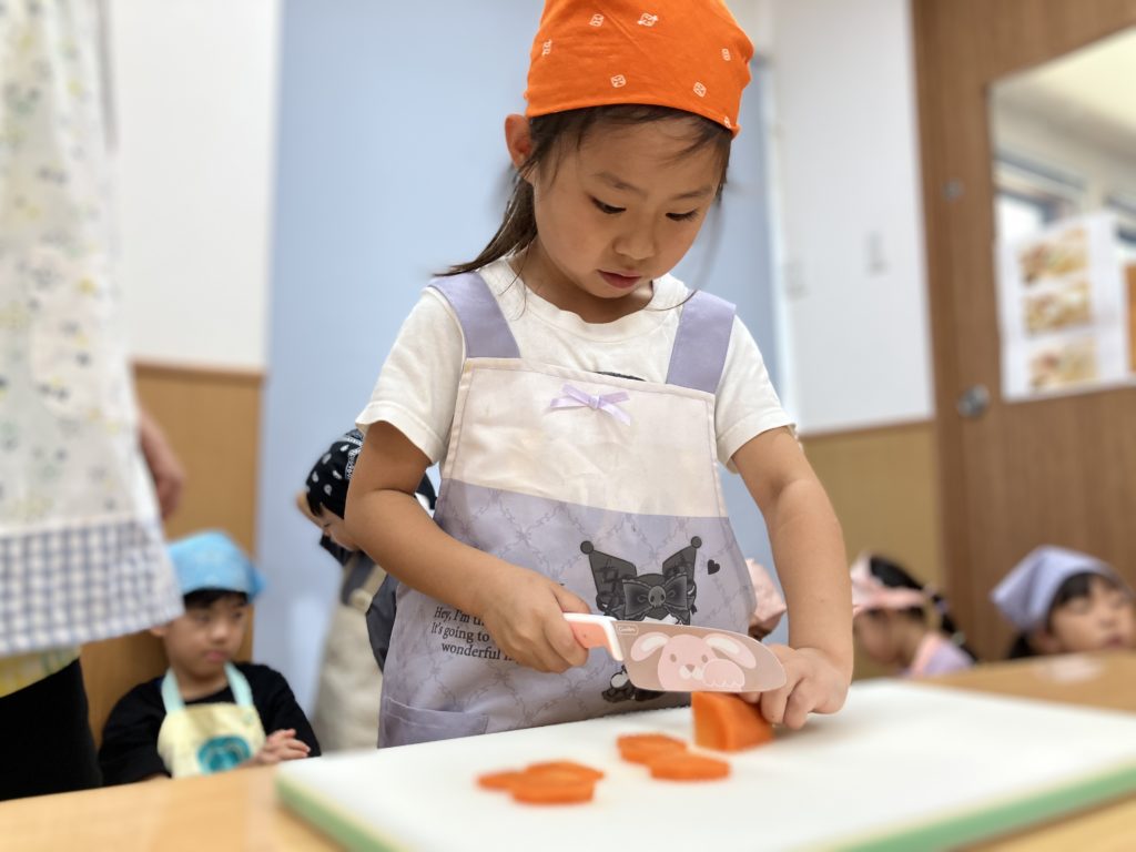 稲刈りやご家庭で野菜を切る経験をしていたので、皆「猫の手でやるんだよね!」、「包丁の刃は自分に向けないの!」などと教えてくれたりもしました🌼