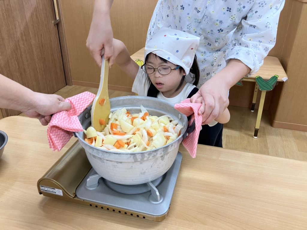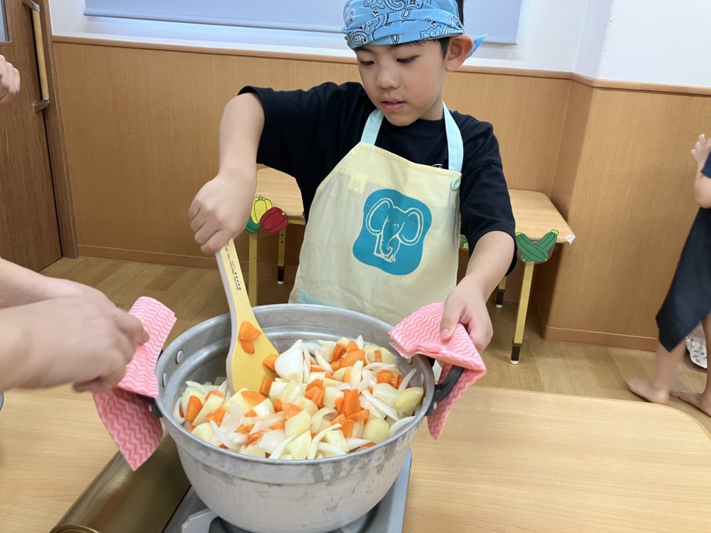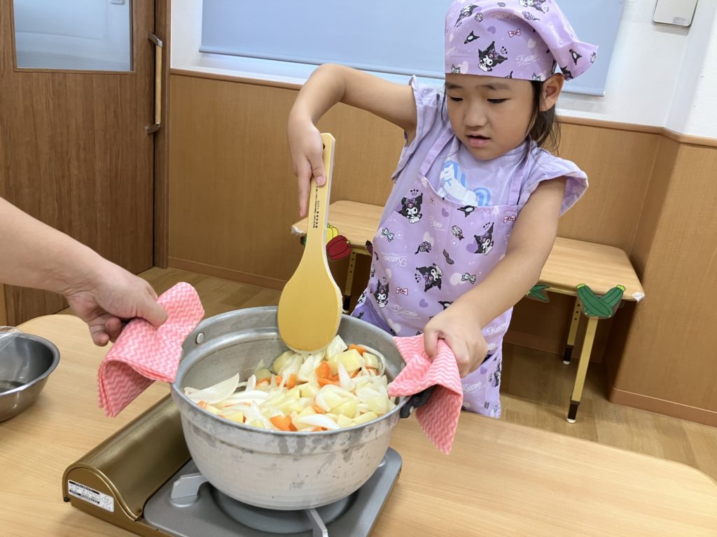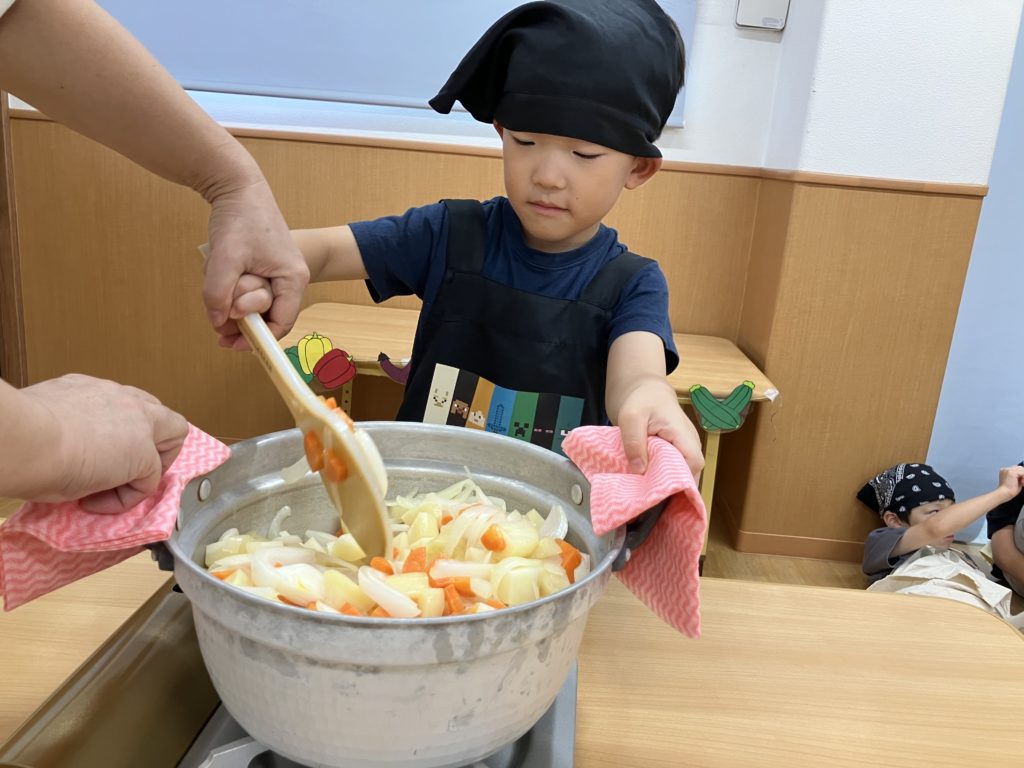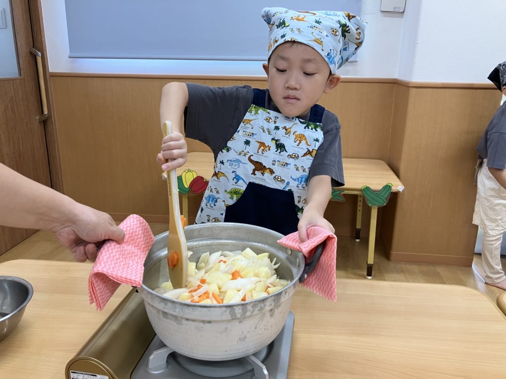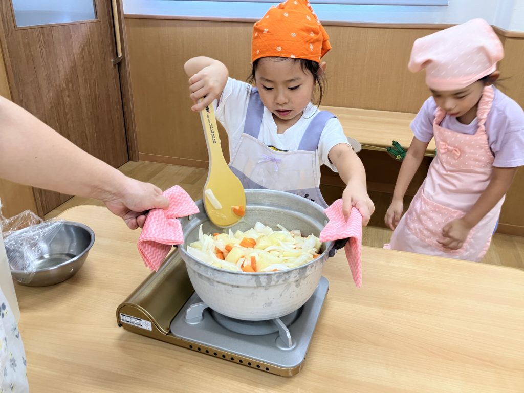 野菜を切った後は、お鍋で炒める作業も子ども達が行いました☺️