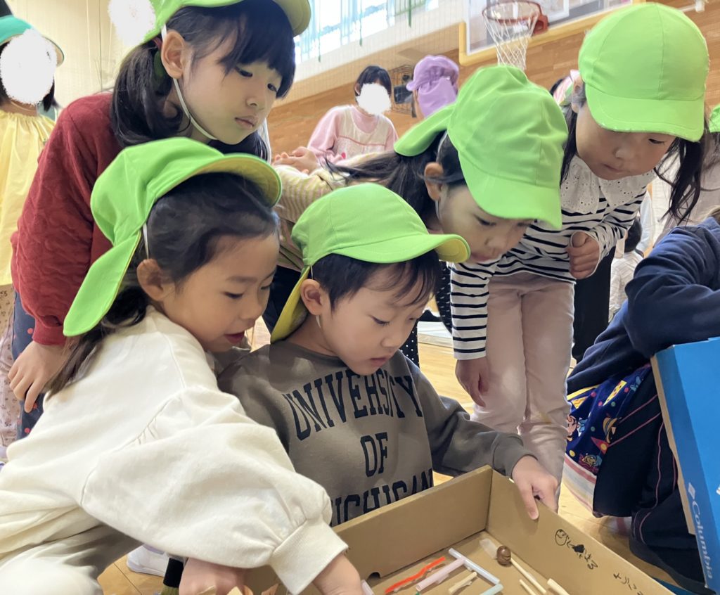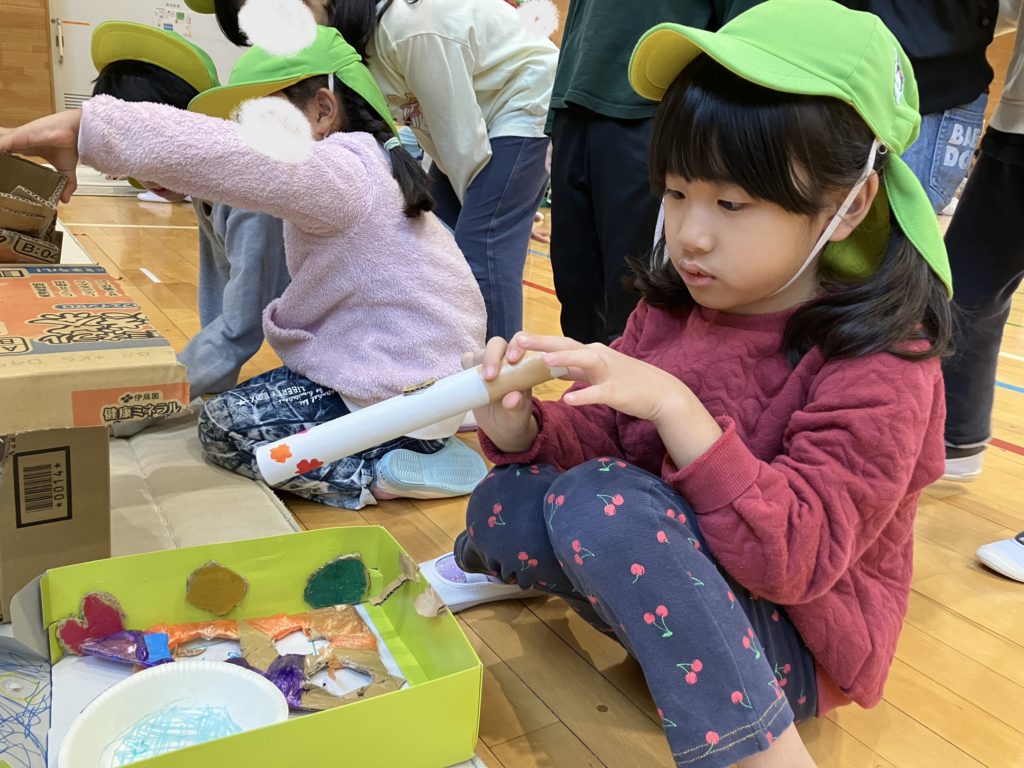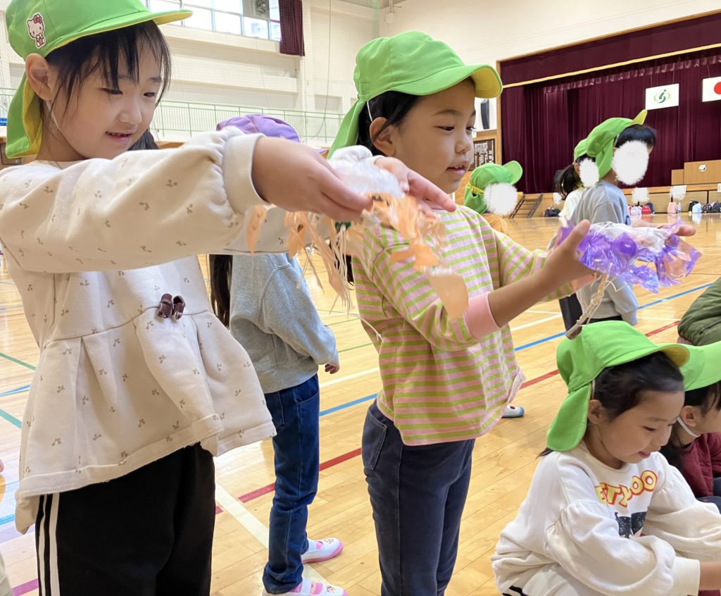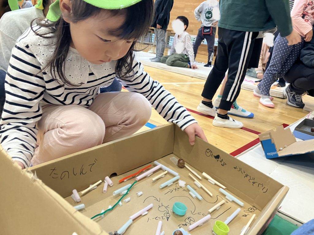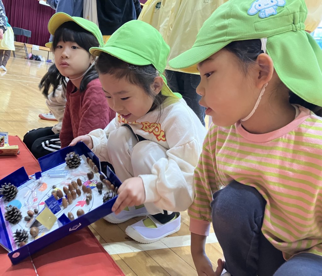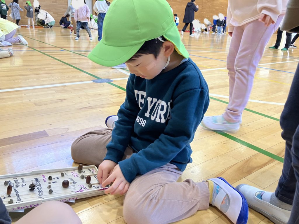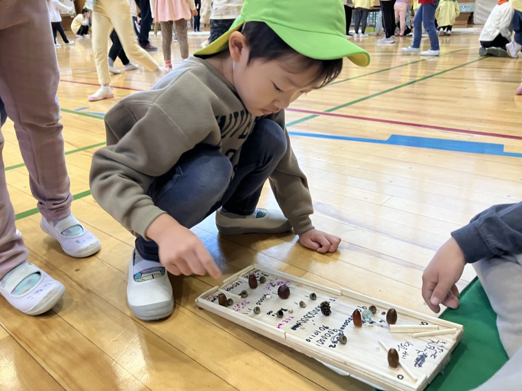 一年生のお店屋さんがオープンすると、一目散に色々なお店へ行き、一年生が作ってくれたどんぐり迷路や、どんぐり釣り、ビニール袋で作ったクラゲ、などなど、沢山の玩具で遊びました😆✨