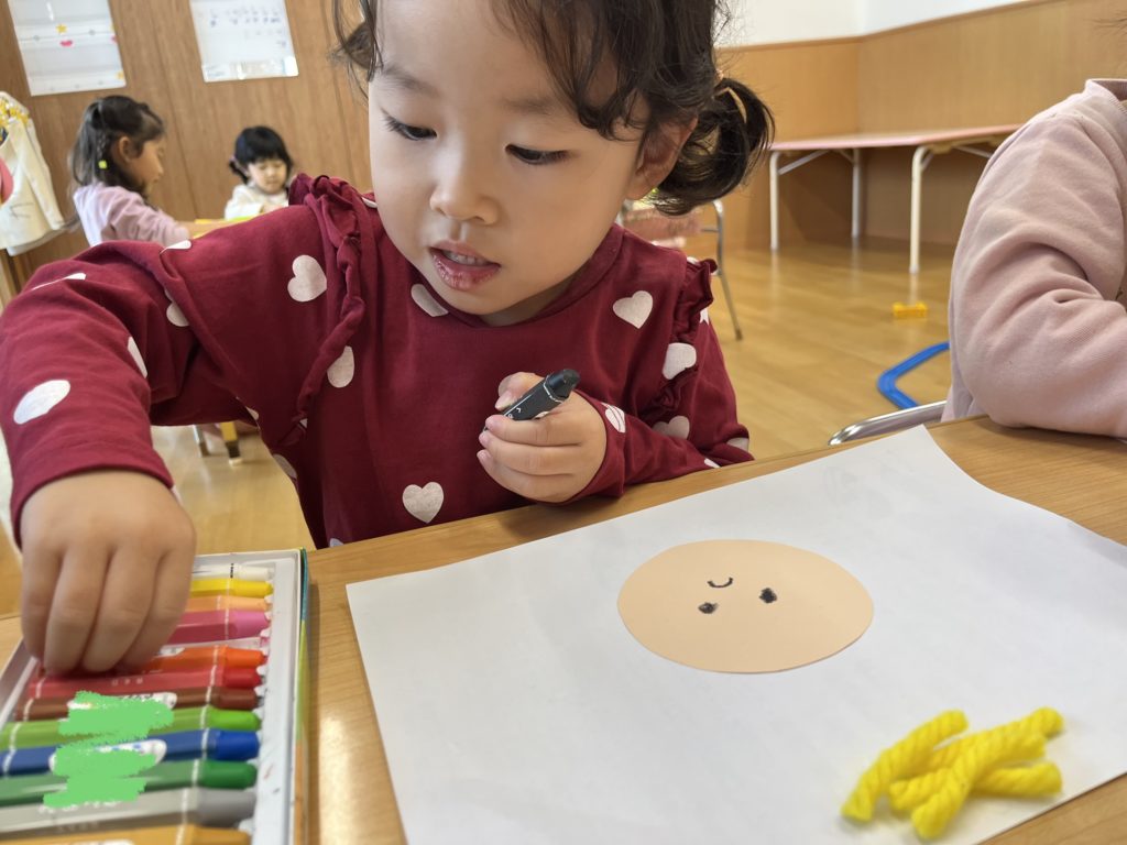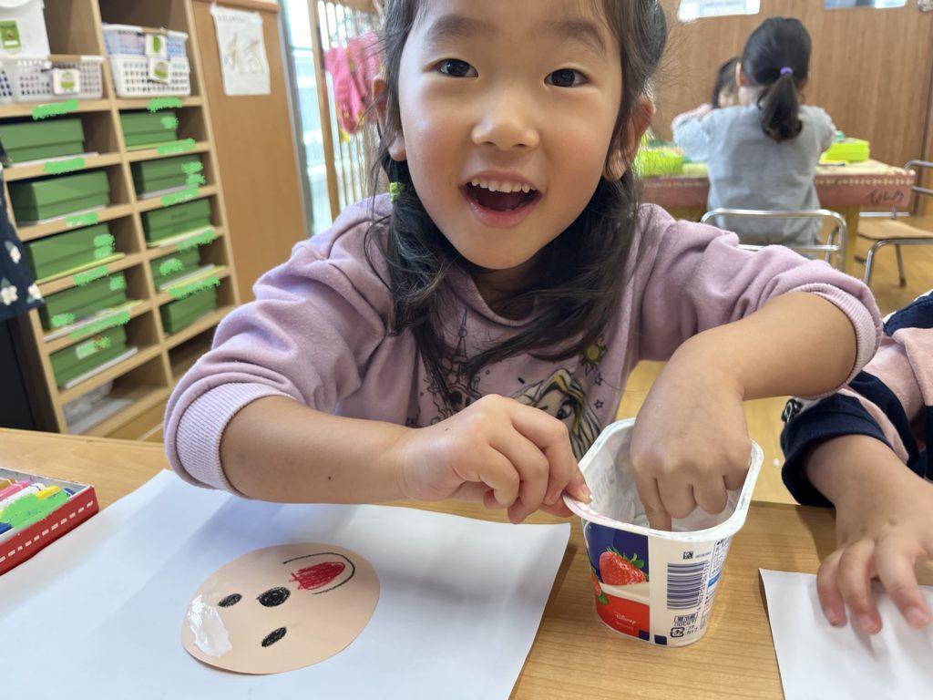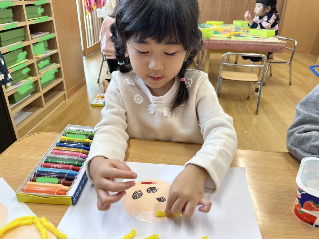 毛糸で髪の毛をつける時もボンドの感触に「わぁつめたい!」と喜んでいました!