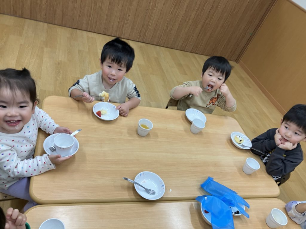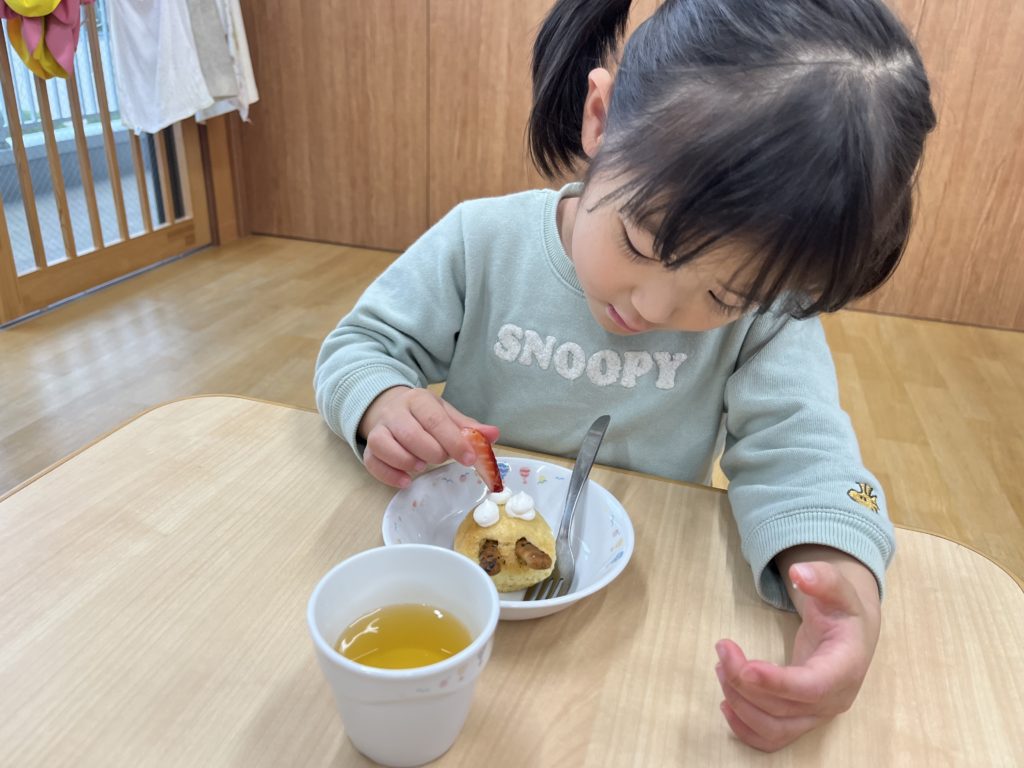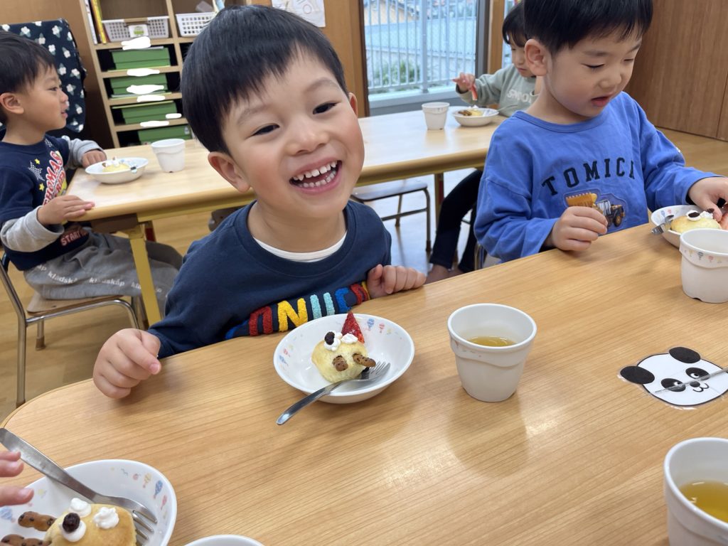 今日のおやつはクリスマスをイメージしたトナカイケーキです!