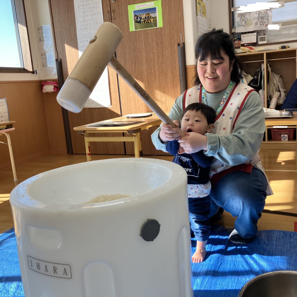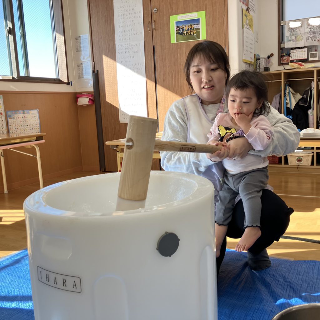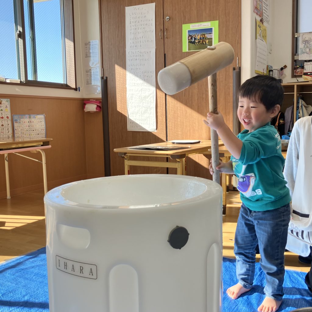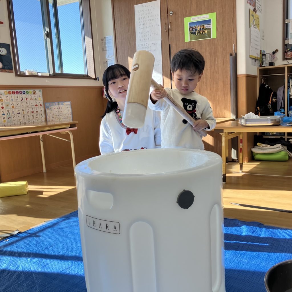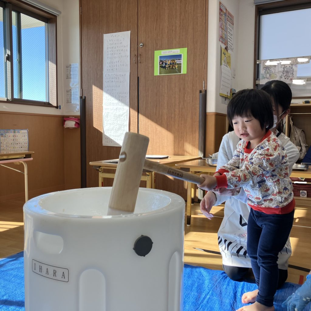 みんなで「よいしょ!」と言い、大盛り上がりの餅つきでした!
