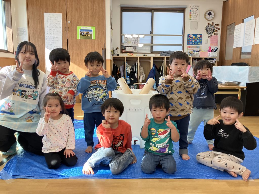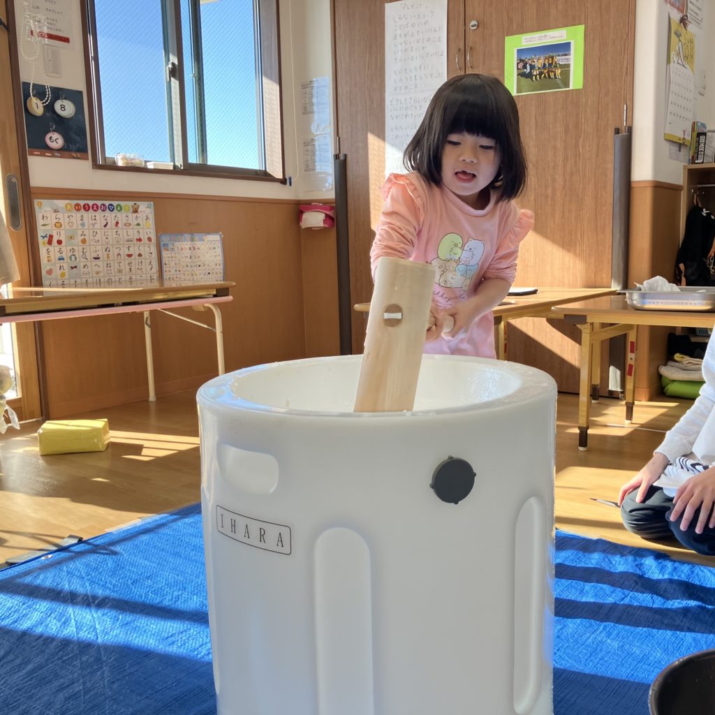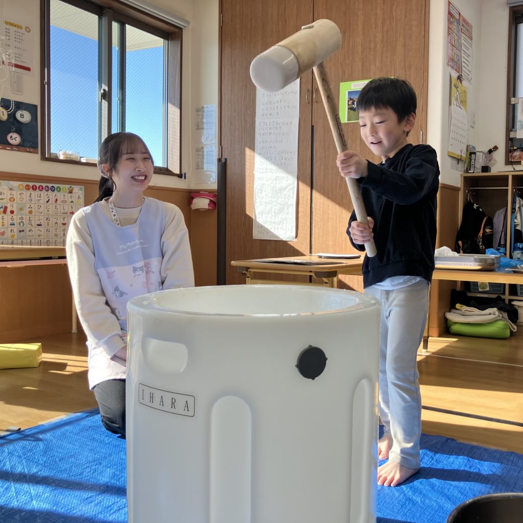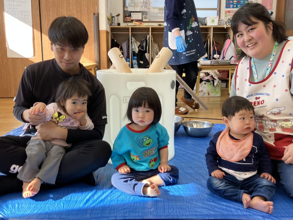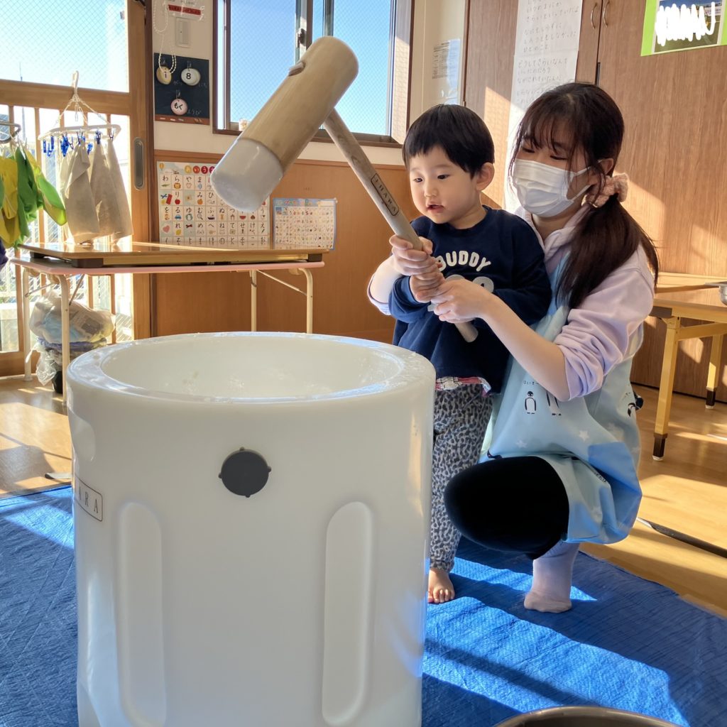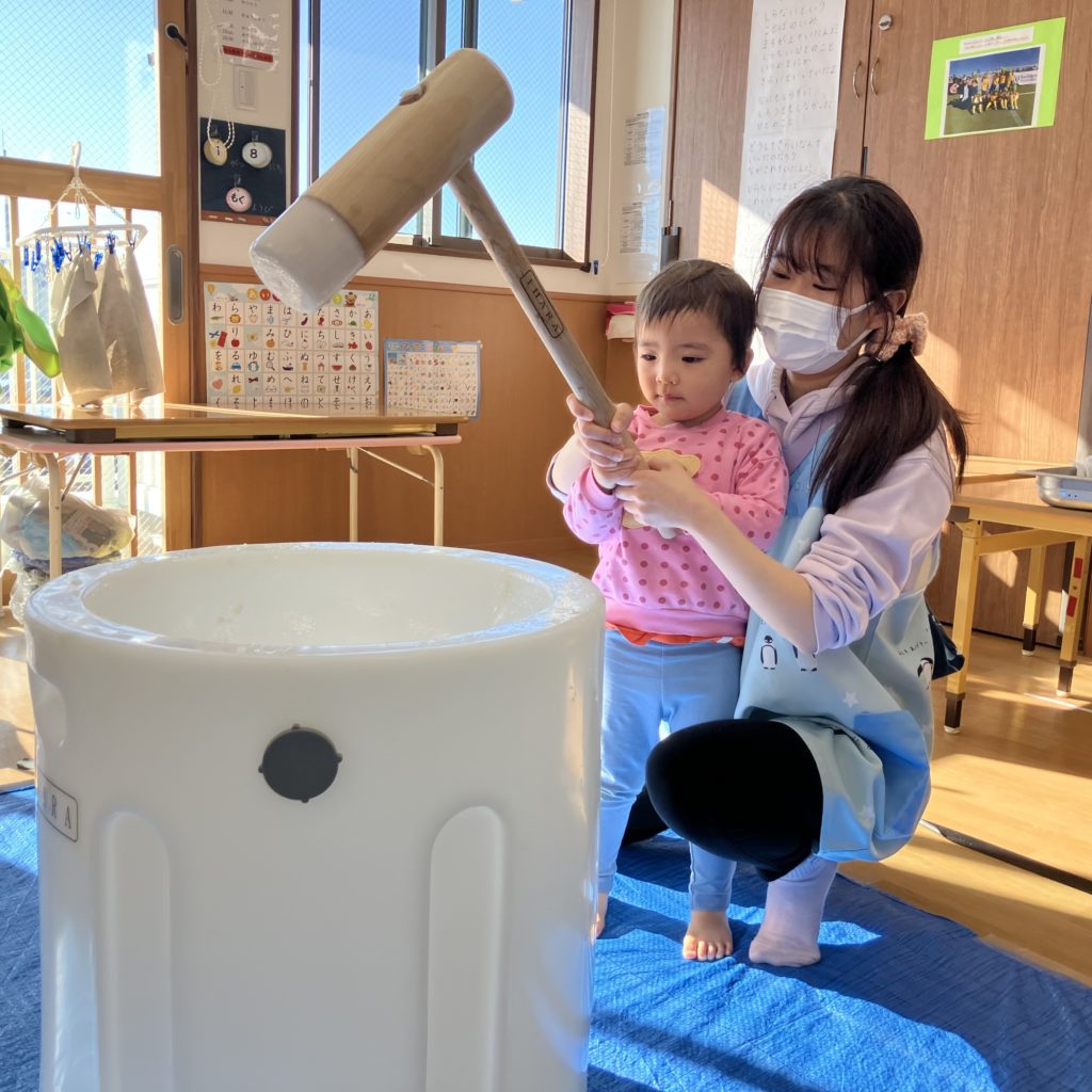 みんなで「よいしょ!」と言い、大盛り上がりの餅つきでした!