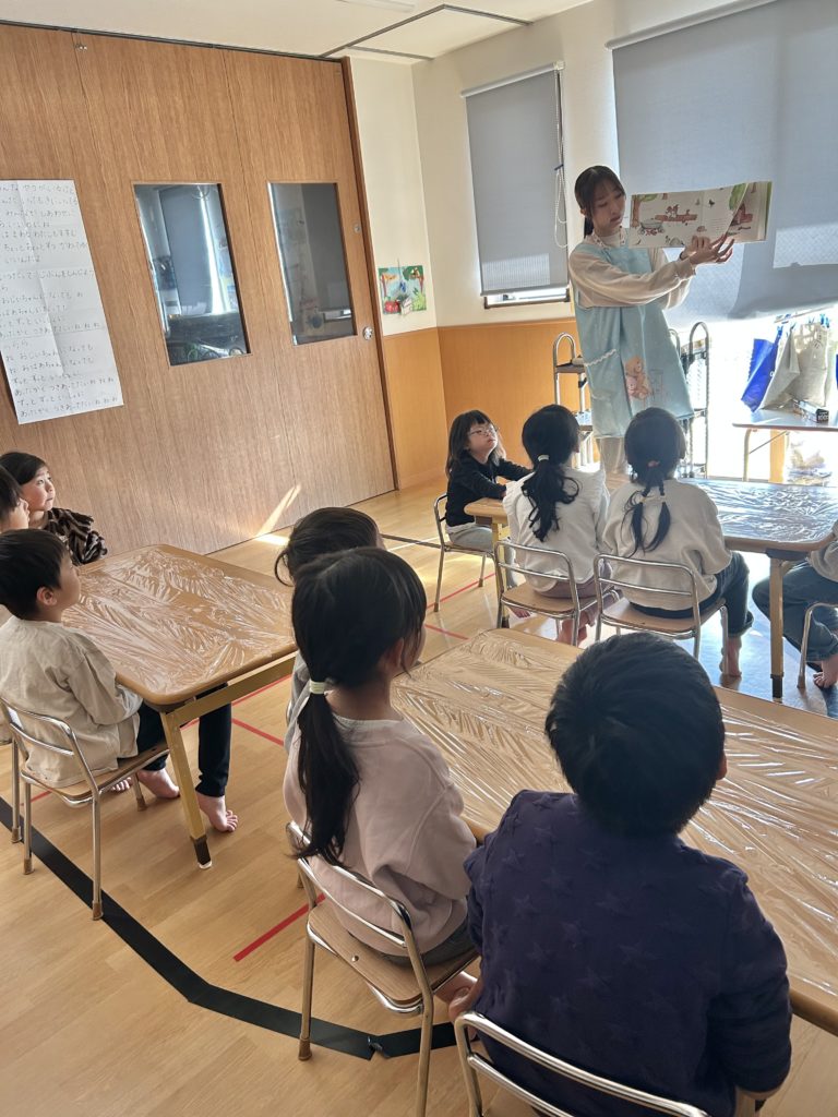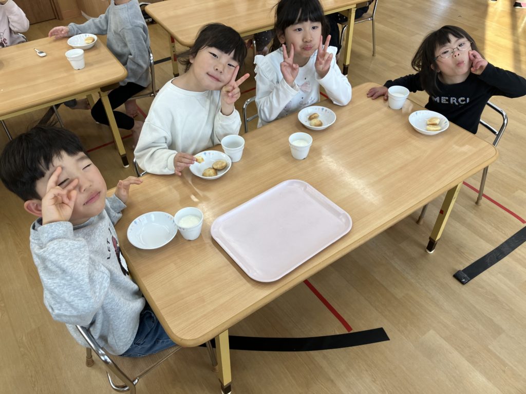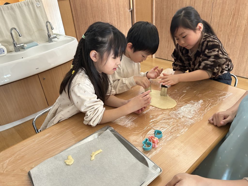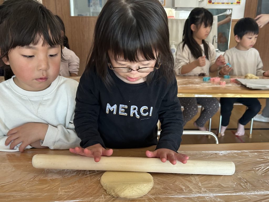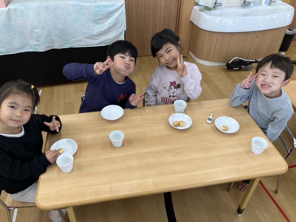 おやつでは皆んなで頑張って作ったクッキーを食べました♪自分達で作ったクッキーは特別美味しかったようで、「これ私が作ったやつ!」などと、にこにこ笑顔で味わっていました☺️