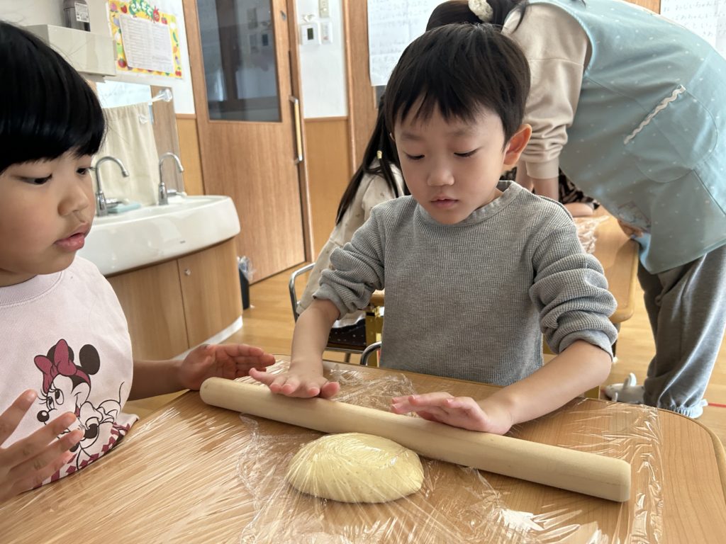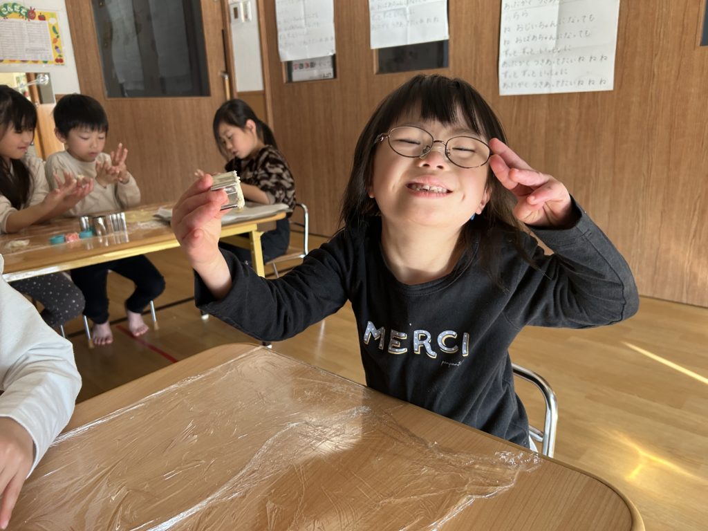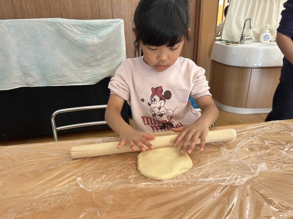 子どもたちの手の温度が温かいと、徐々に生地が柔らかくなってしまい、「手にくっついちゃったー!」「すばやくこねこねしたらつかないよ!」など、話し合いながら行っていました✨