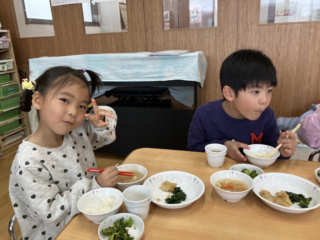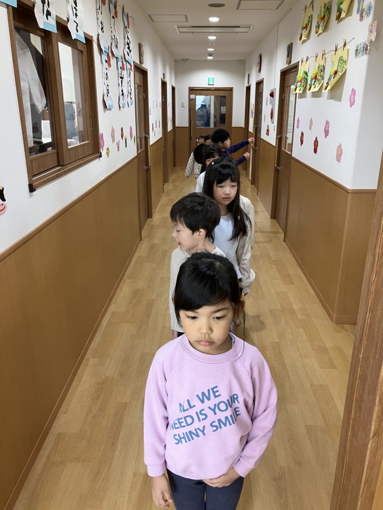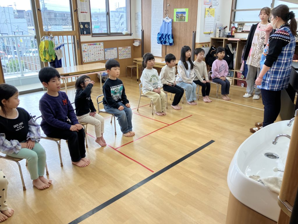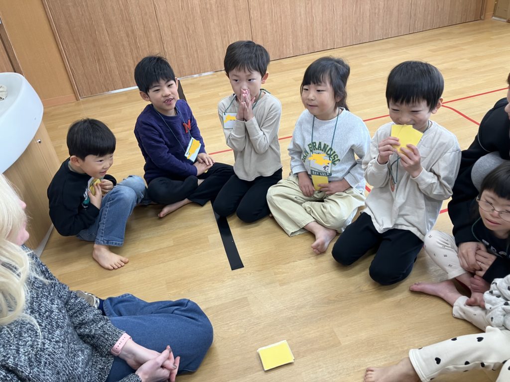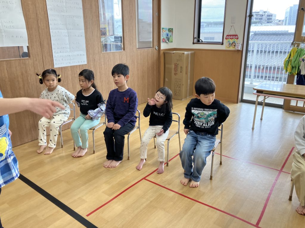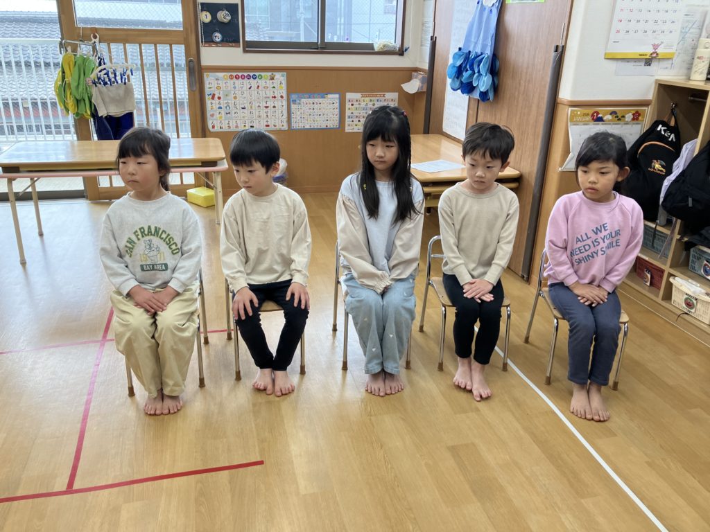 みんなの大好きな英語の時間では、お互いに自己紹介をしたり物の色を言ったりして楽しそうでした!卒園式練習では、座り方の練習をしました。初めてやる事に戸惑いながらもやっていました♪