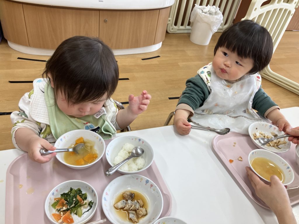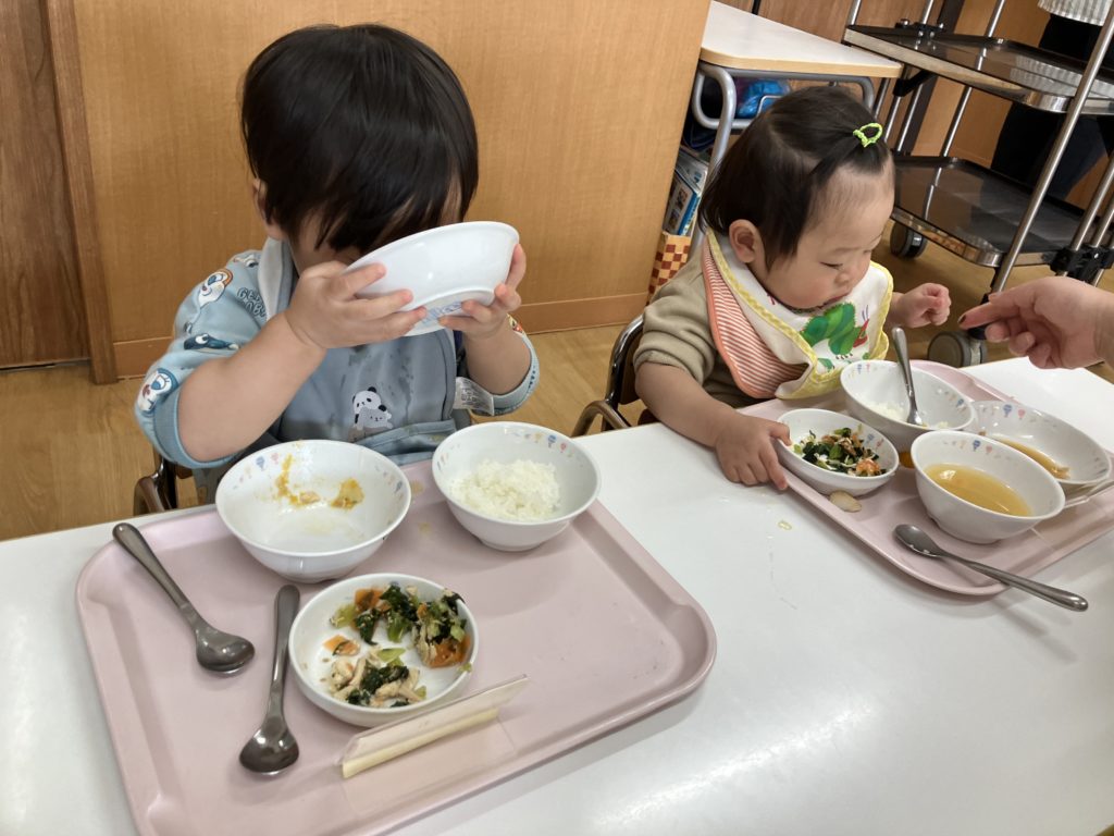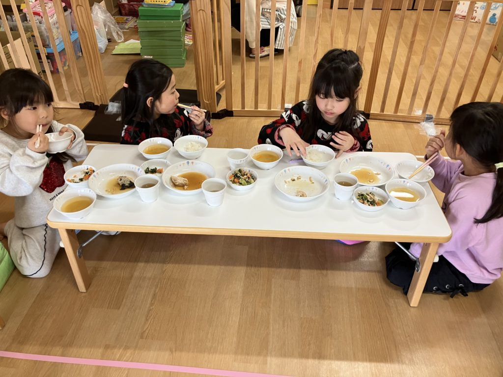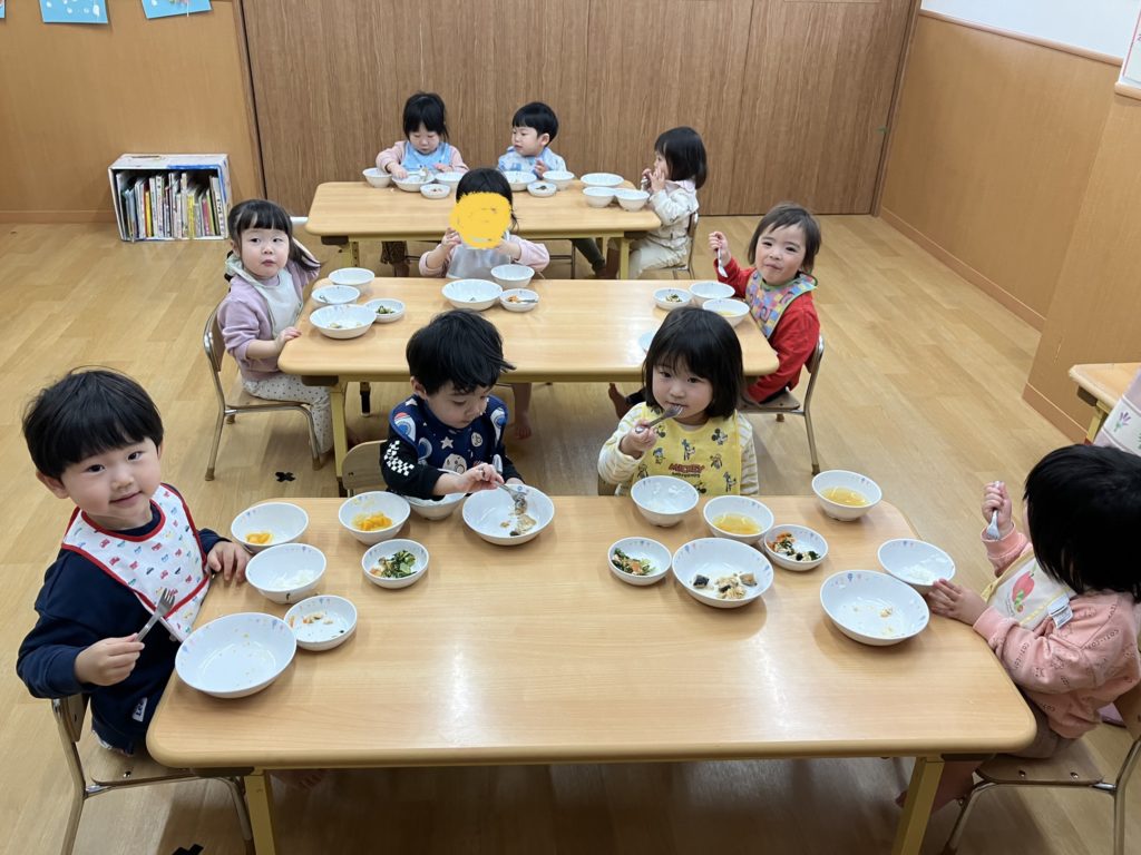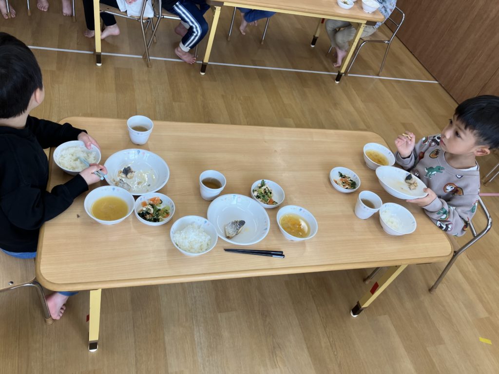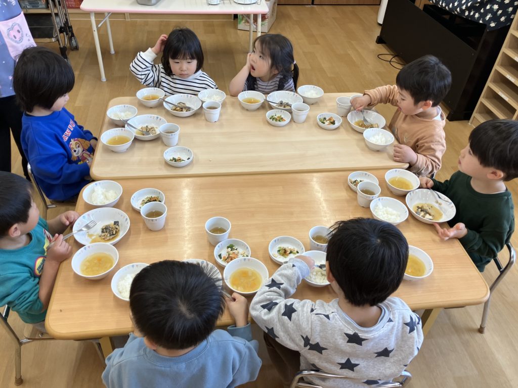新しい部屋にワクワクの子どもたち🎶少し大きな椅子と机で楽しく給食を食べました!