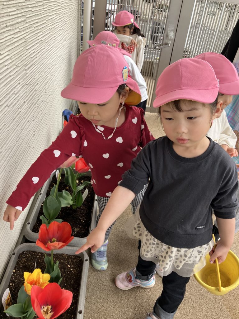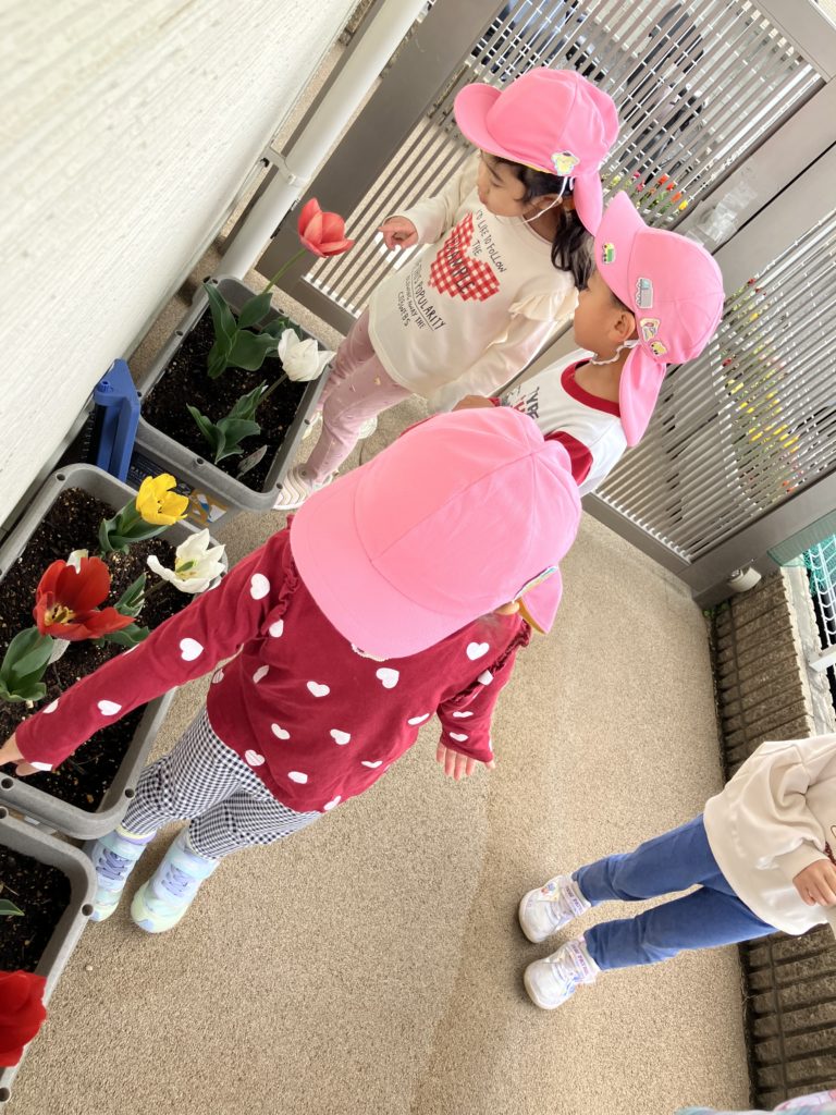 園庭に出たとき、チューリップが咲いていることに気づいて「きれい」と目を輝かせながら観察していました🌷
