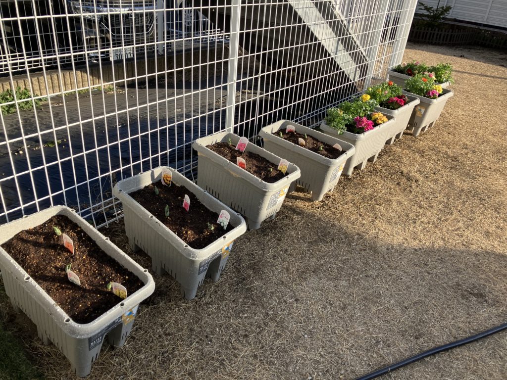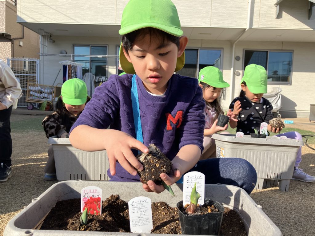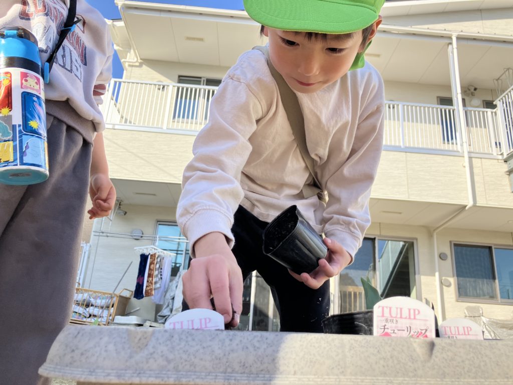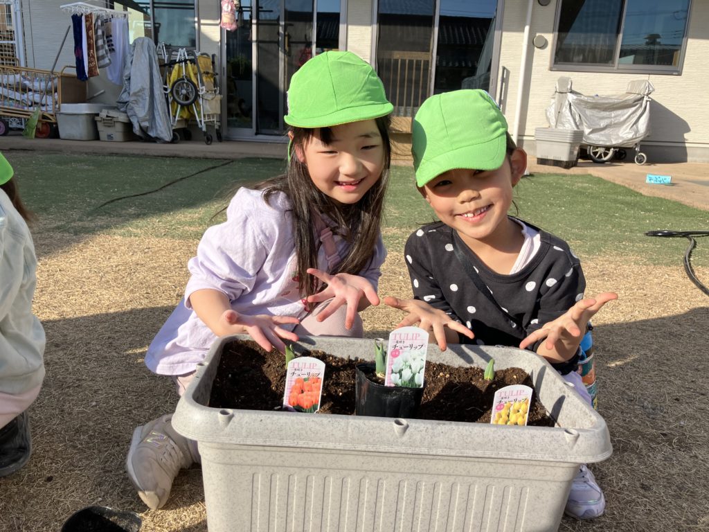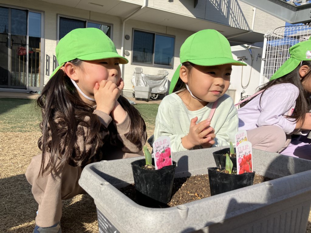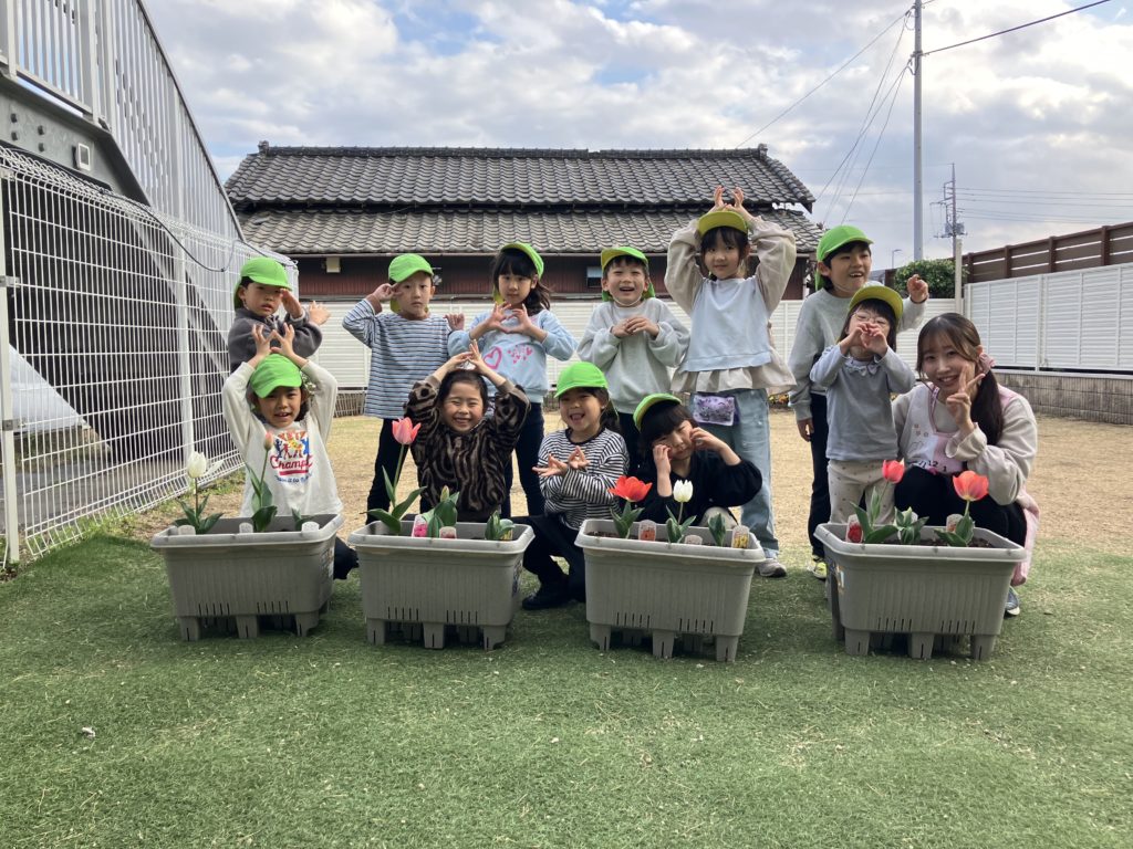 以前、シャチ組で園庭にチューリップを植えたのですが、ようやく咲いてきたので皆で写真を撮りました♪