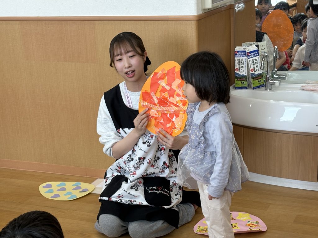 イルカ組は折り紙貼り、クジラ組はクレヨンでお絵描き、シャチ組はハート型にはさみで切りました🐣