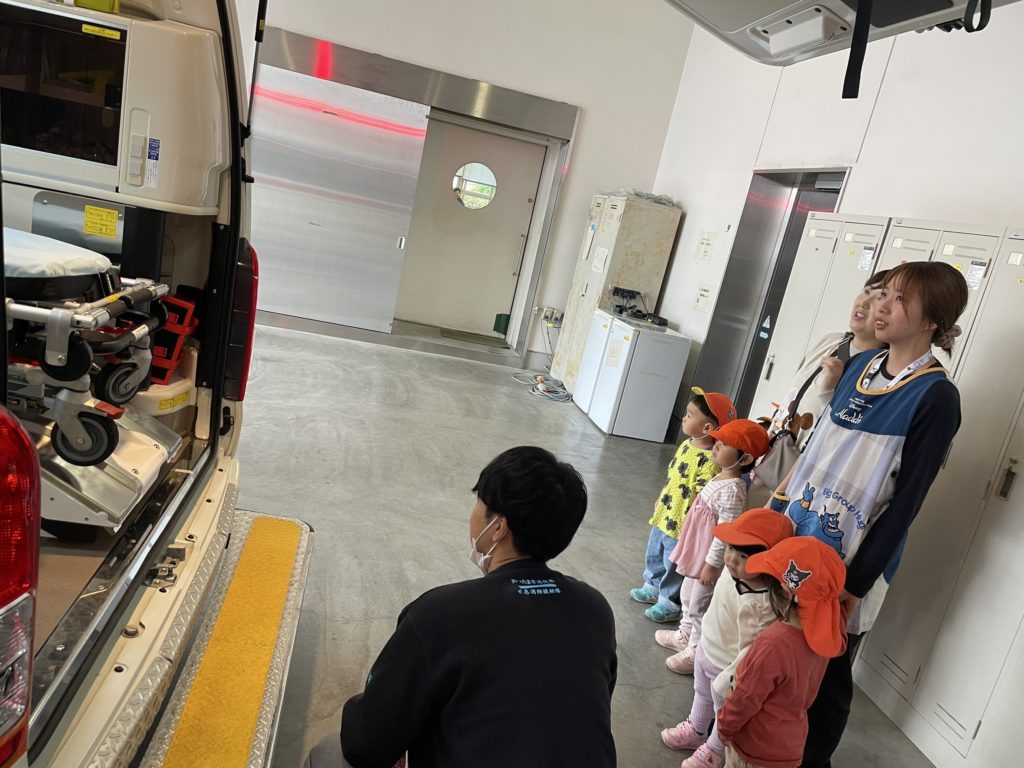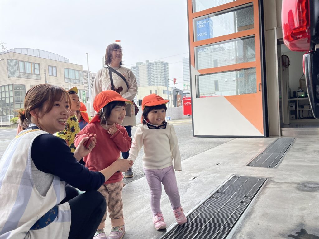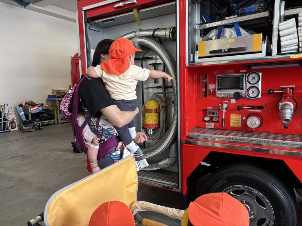 子どもたちが大好きな消防署までお散歩に行きました。今日もラッキなことに消防署の中まで見学させていただきましたよ!