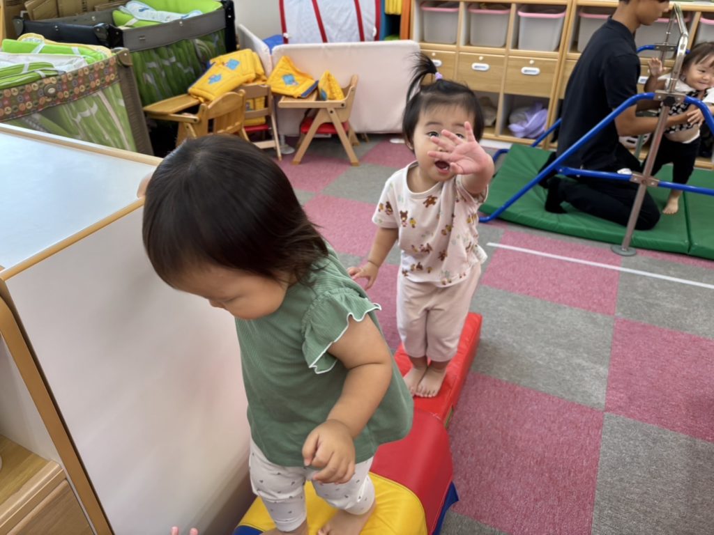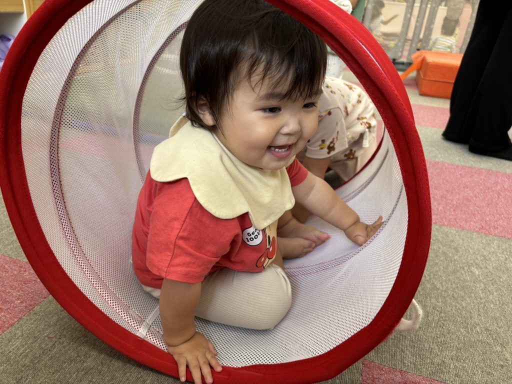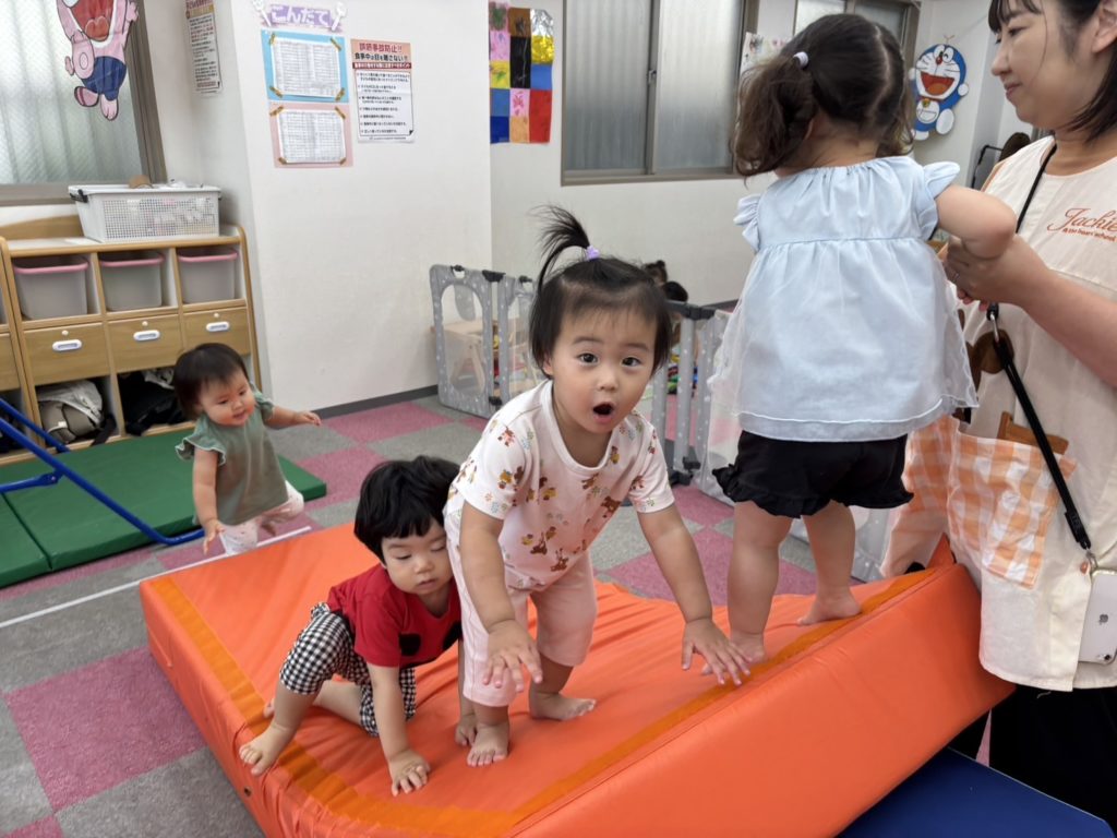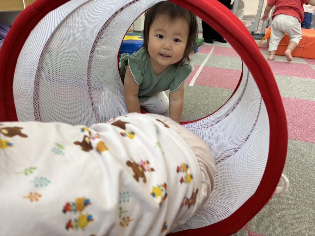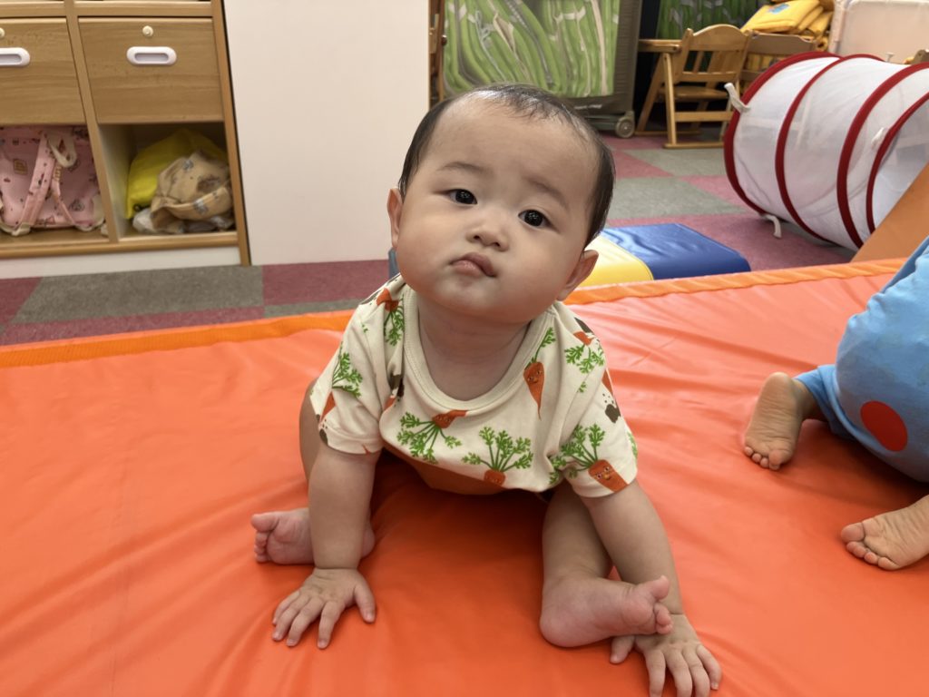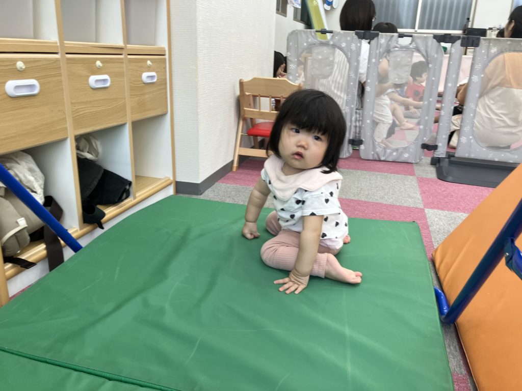 今日は沢山身体を動かす正課体育の日です! みんな楽しみにしており、順番が来るのを今か今かと待っていましたよ✨ 〜0歳児〜 👅行っちゃうよ〜😏どう??🩷 〜1歳児〜 座っ