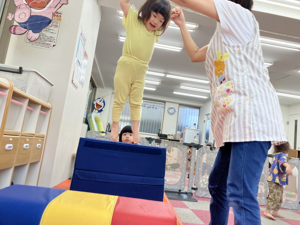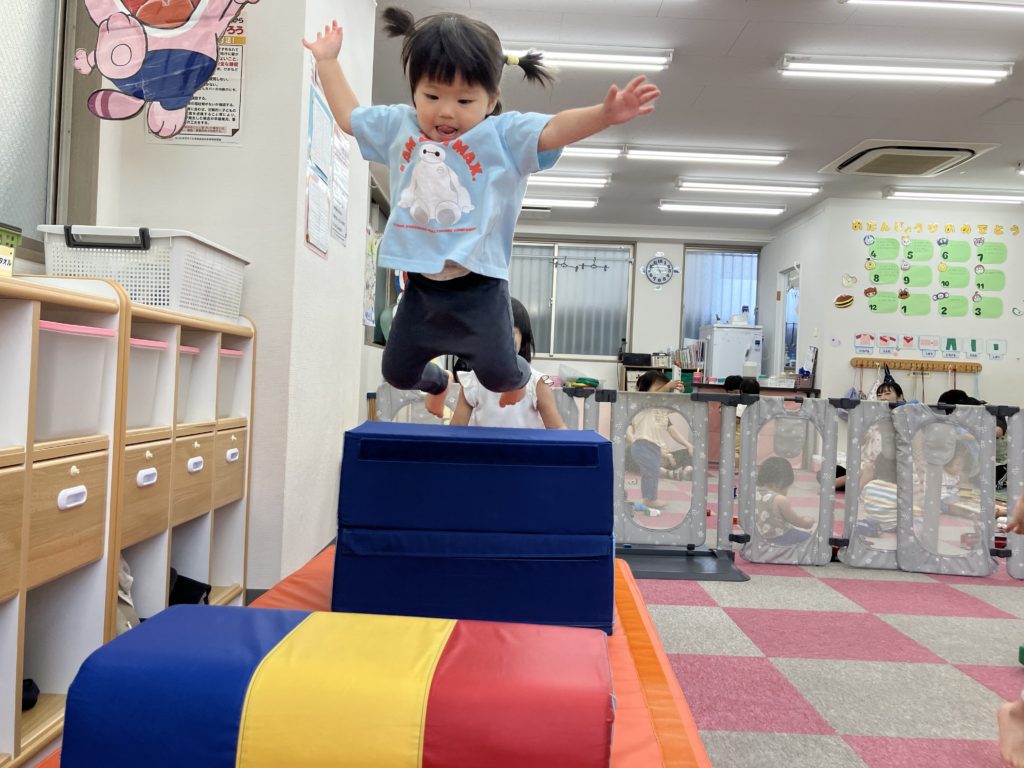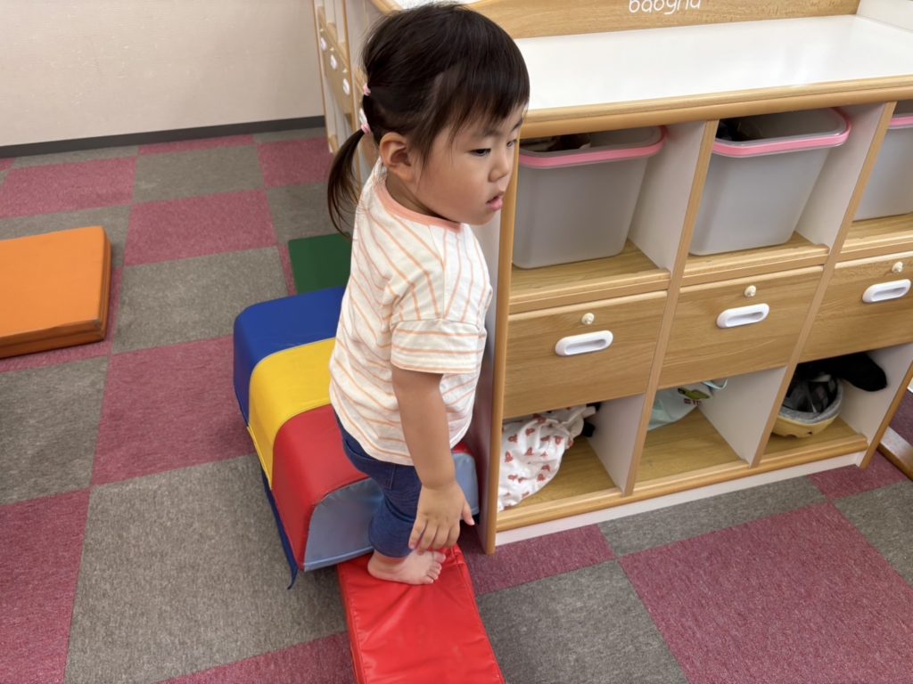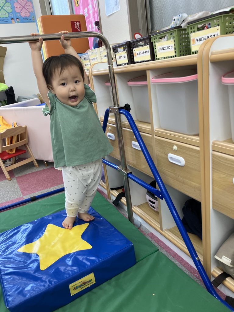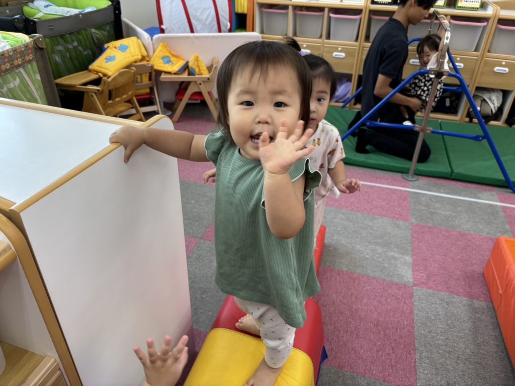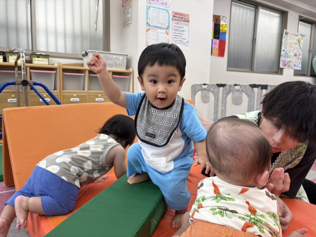 今日は沢山身体を動かす正課体育の日です! みんな楽しみにしており、順番が来るのを今か今かと待っていましたよ✨ 〜0歳児〜 👅行っちゃうよ〜😏どう??🩷 〜1歳児〜 座っ