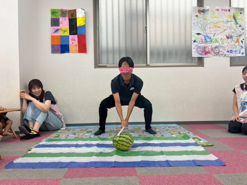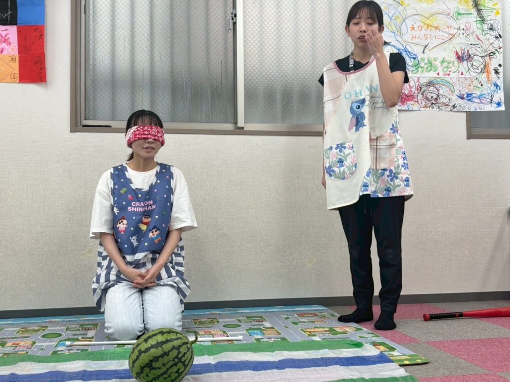 先生たちもスイカ割りに挑戦💪🏻目隠して頑張ります!
