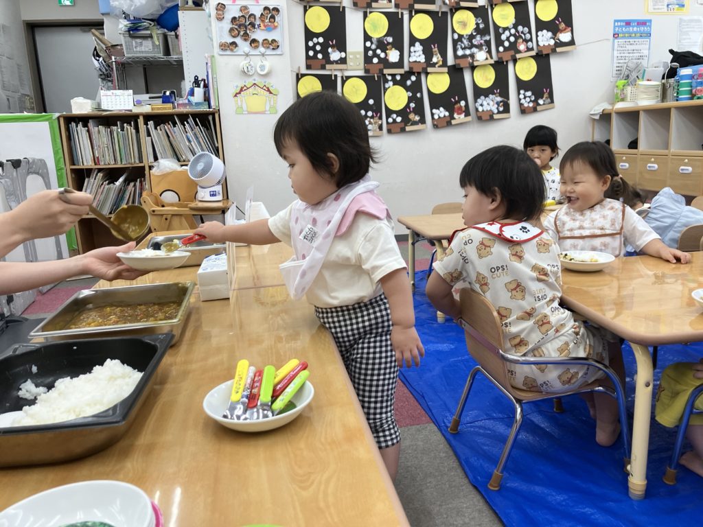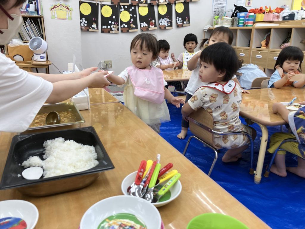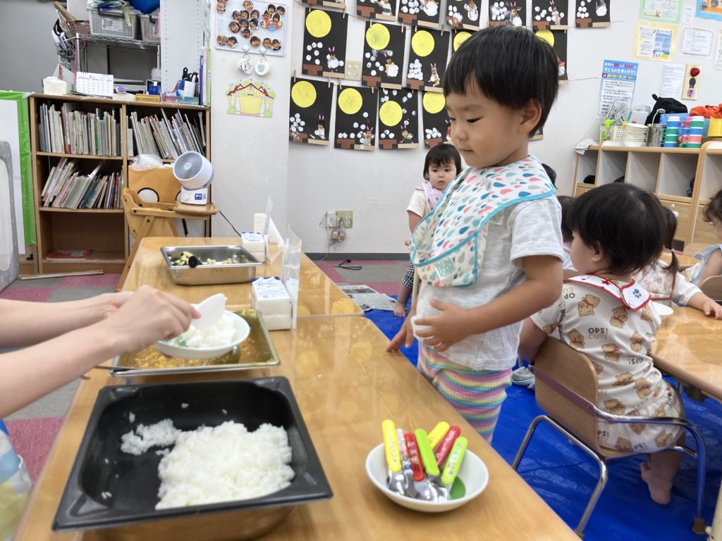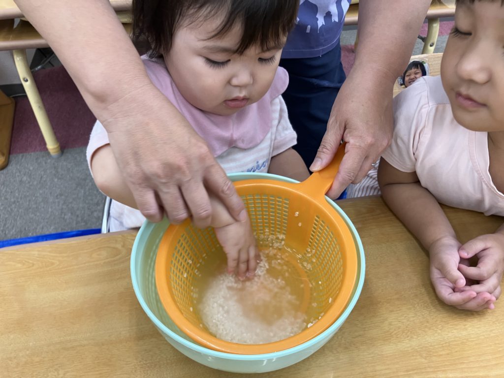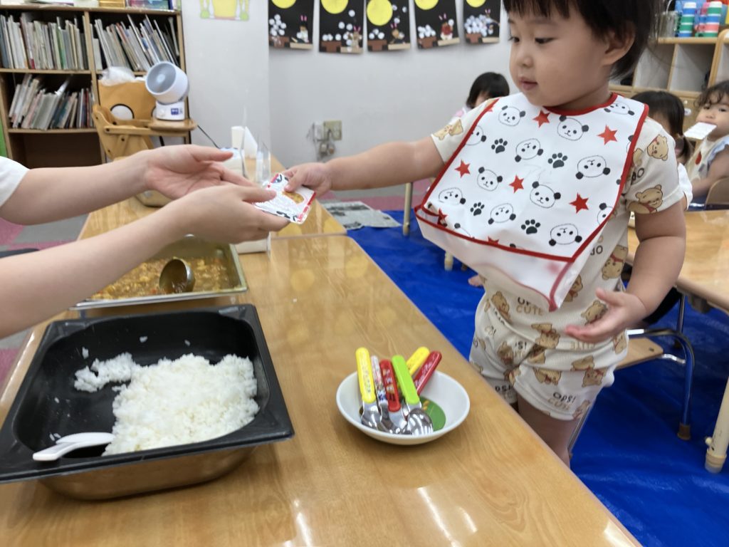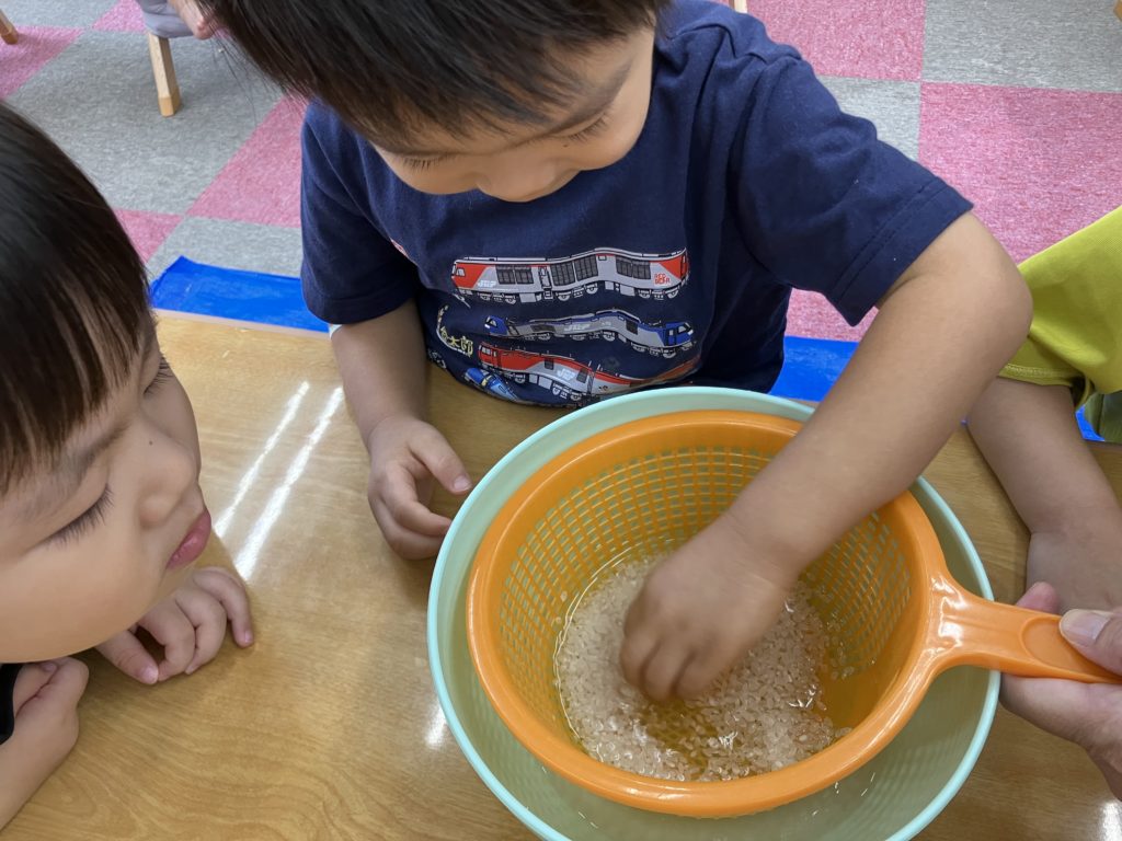 今日は朝のおやつの後に、米とぎをしました。お昼には子どもたちが研いでくれたお米がカレーに変身して、バイキング式での給食になりました😋🍴