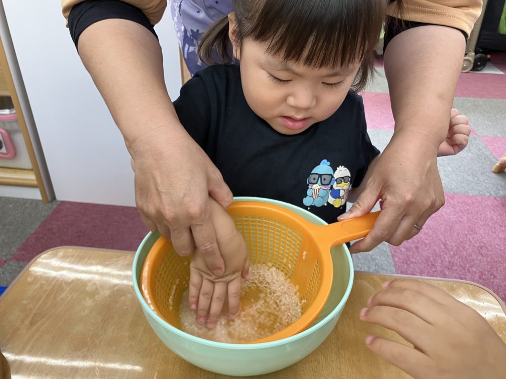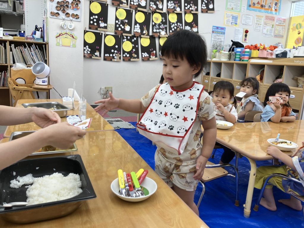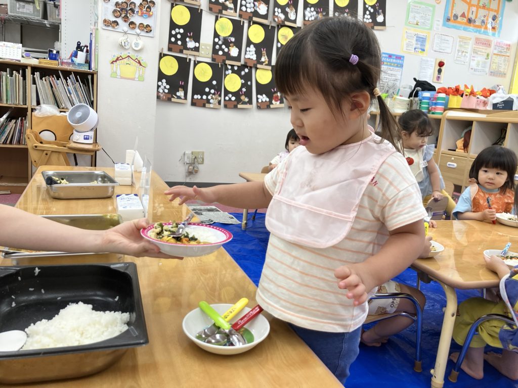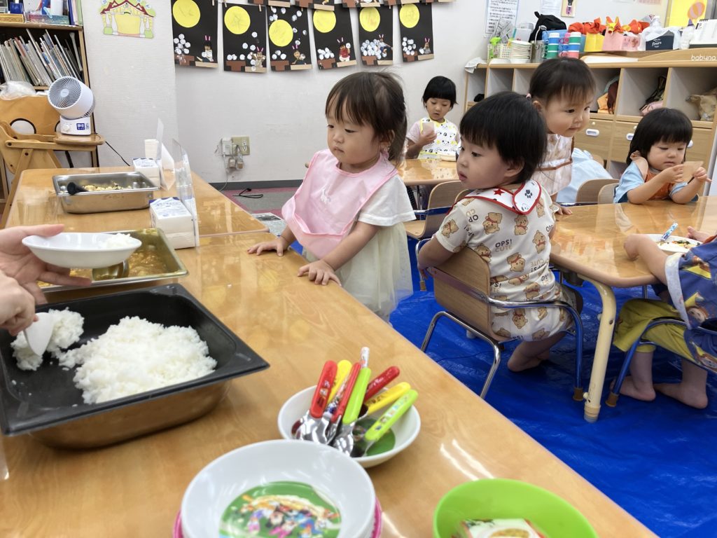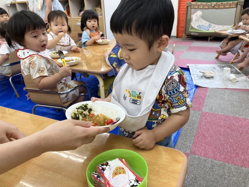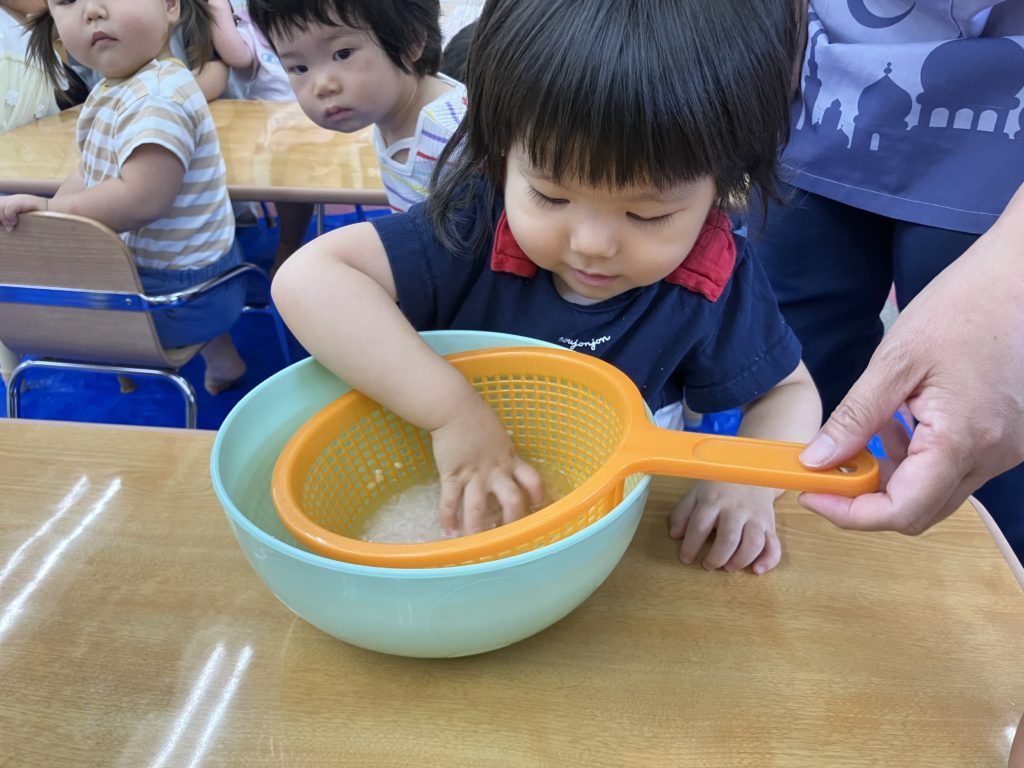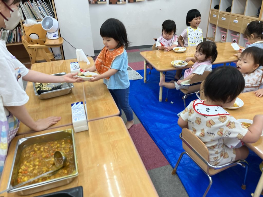 今日は朝のおやつの後に、米とぎをしました。お昼には子どもたちが研いでくれたお米がカレーに変身して、バイキング式での給食になりました😋🍴