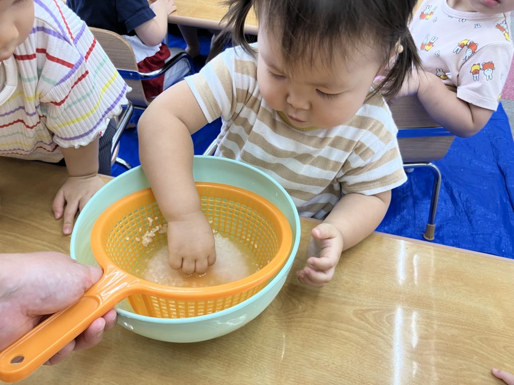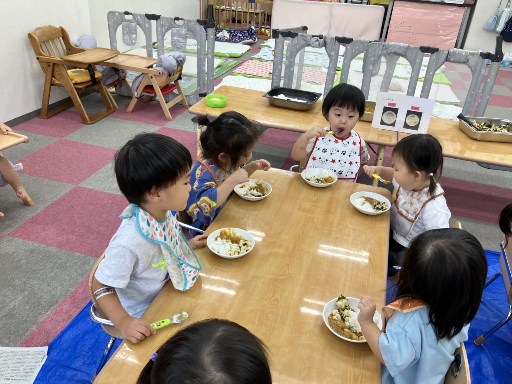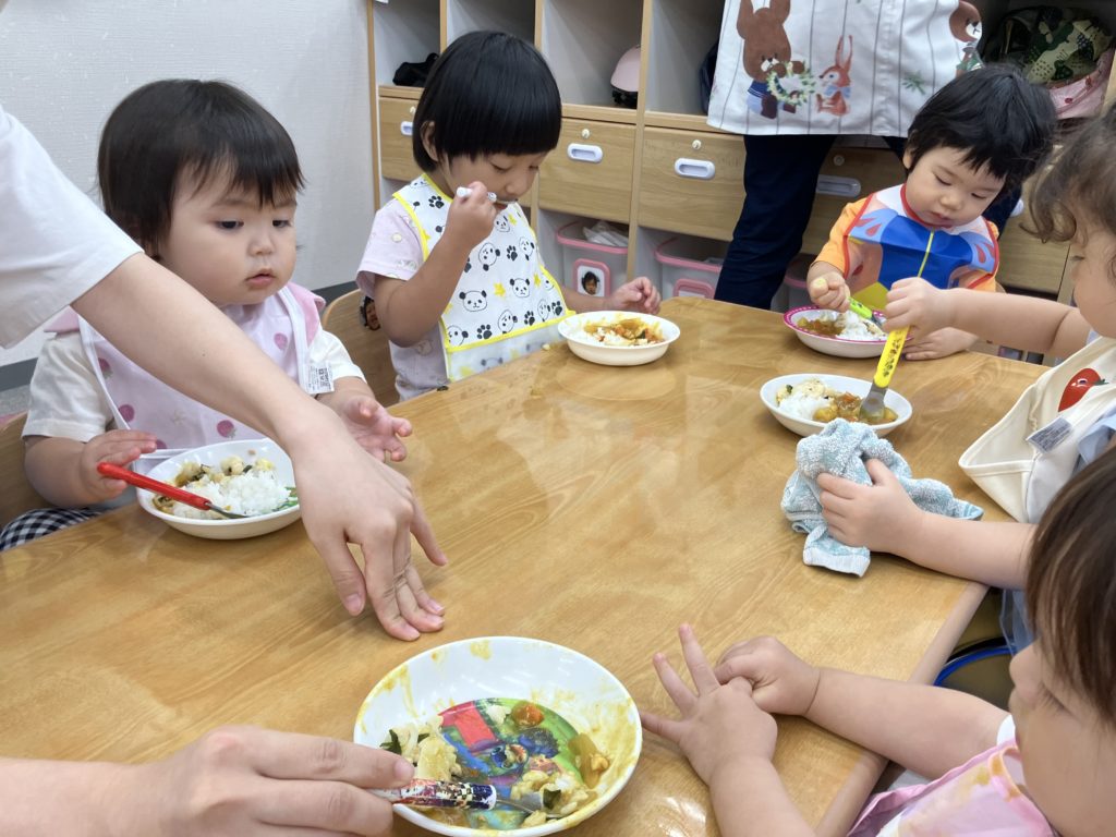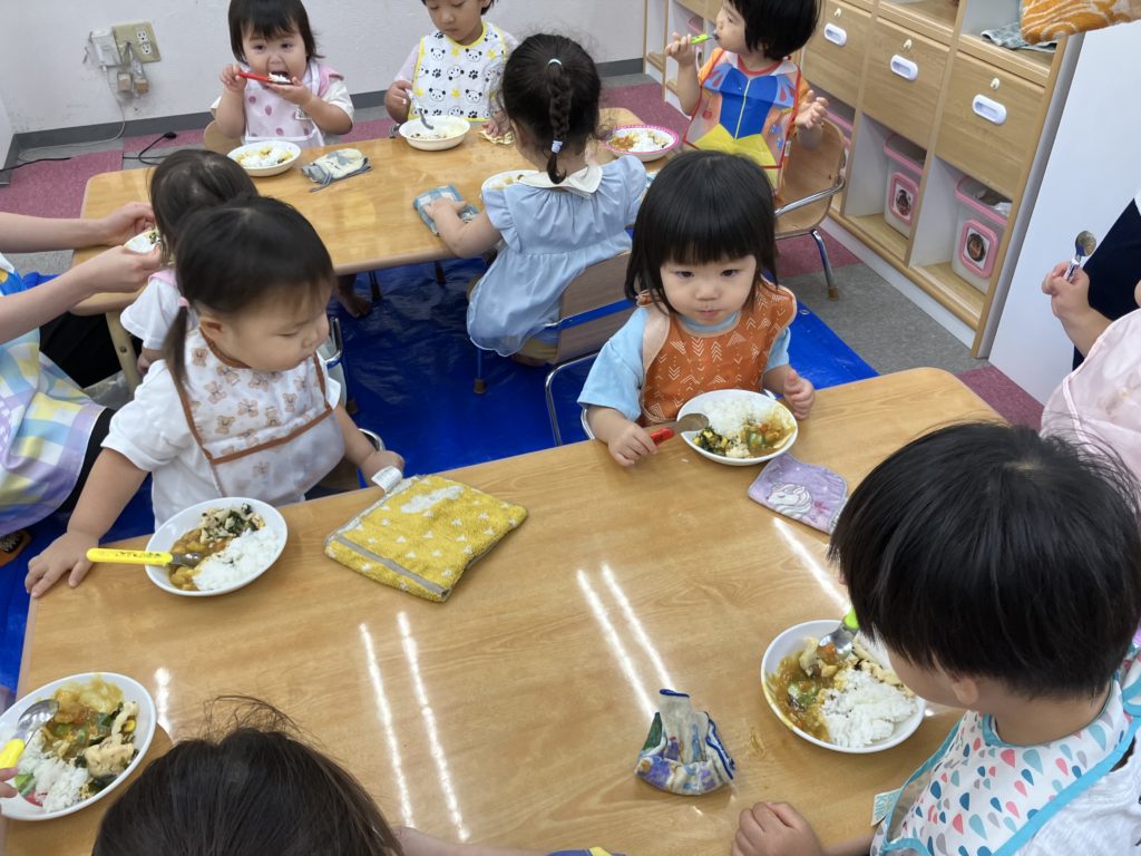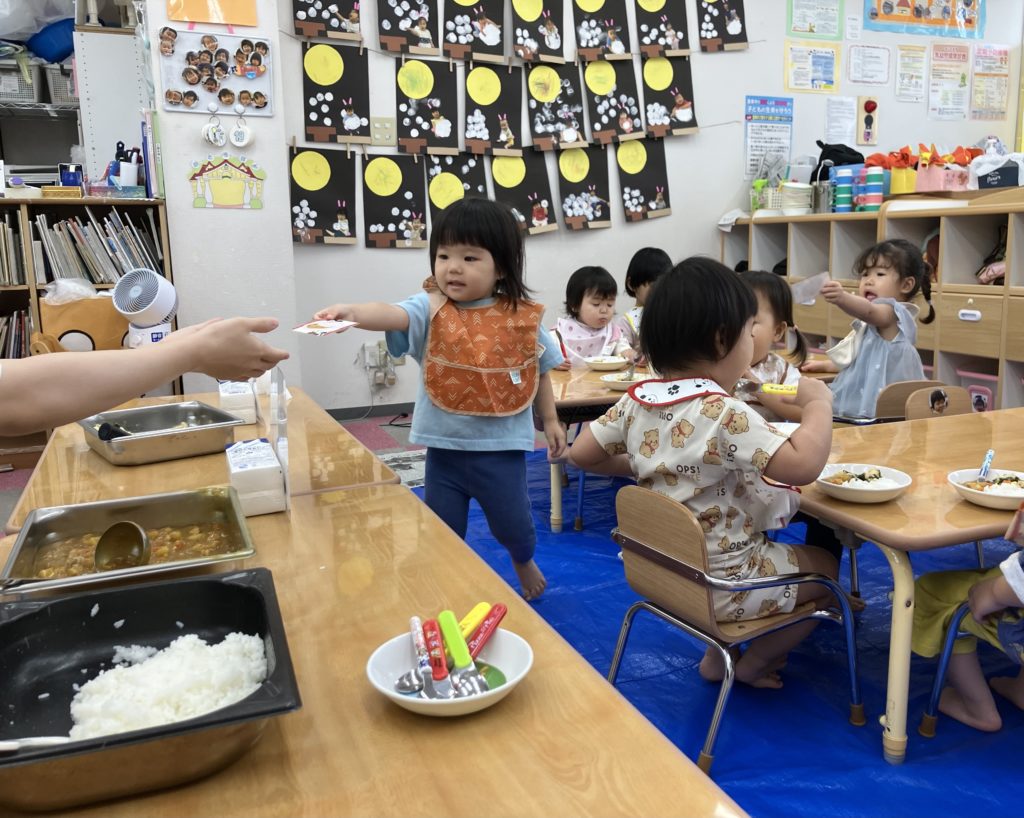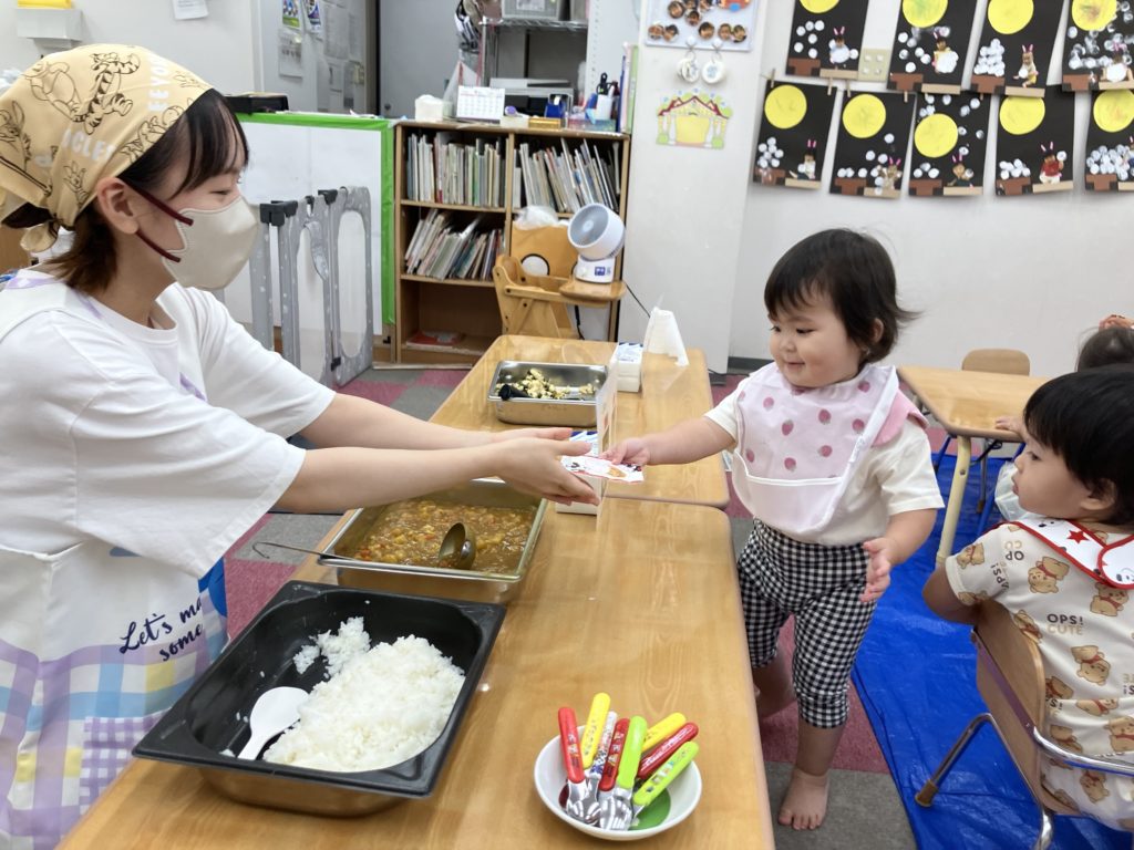 今日は朝のおやつの後に、米とぎをしました。お昼には子どもたちが研いでくれたお米がカレーに変身して、バイキング式での給食になりました😋🍴