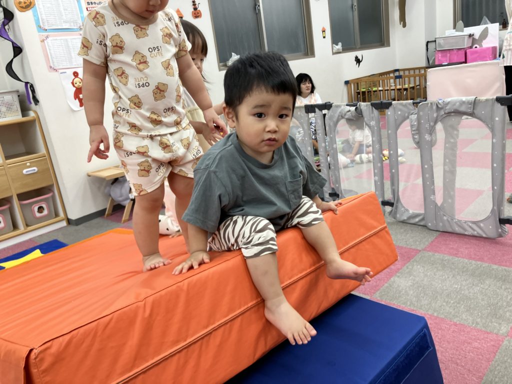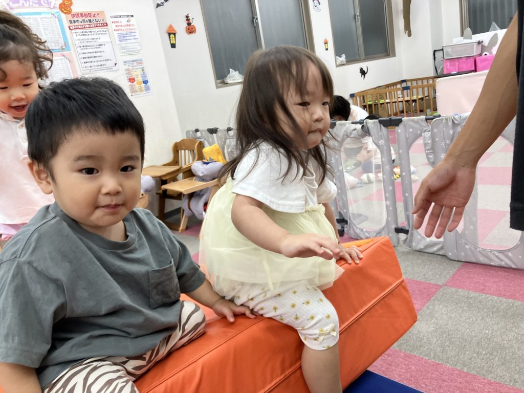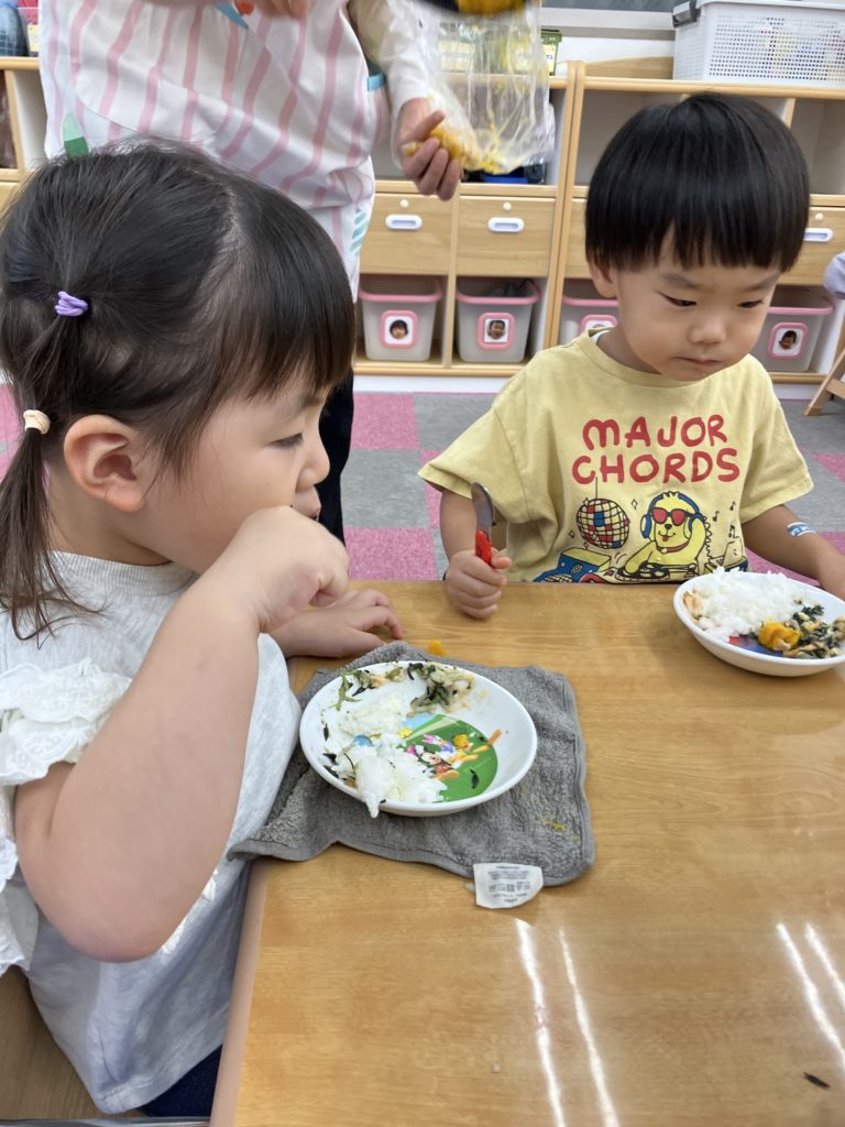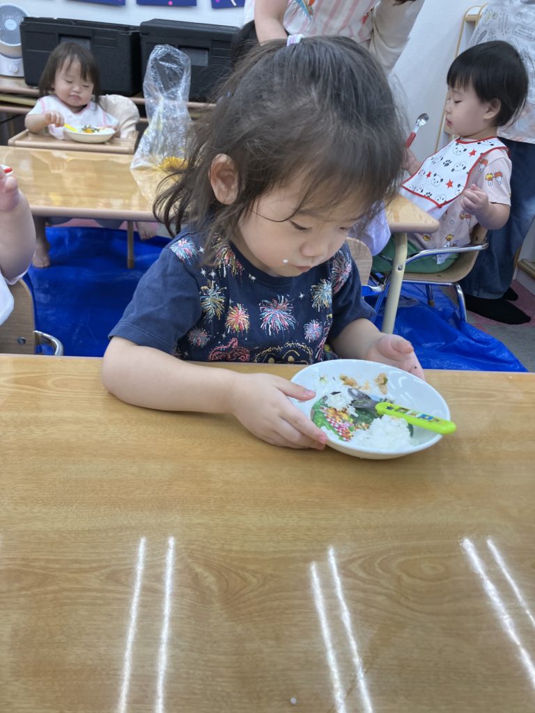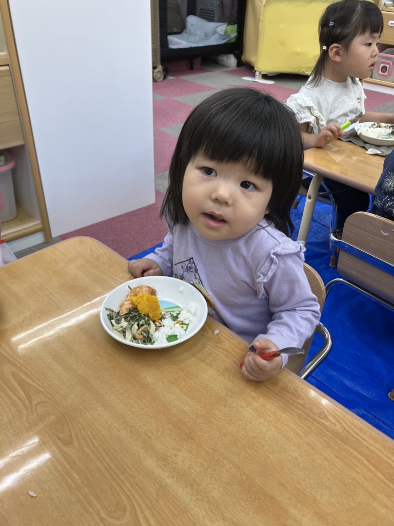 今日から10月。今月から2歳児はエプロンなしで給食を食べます🥄