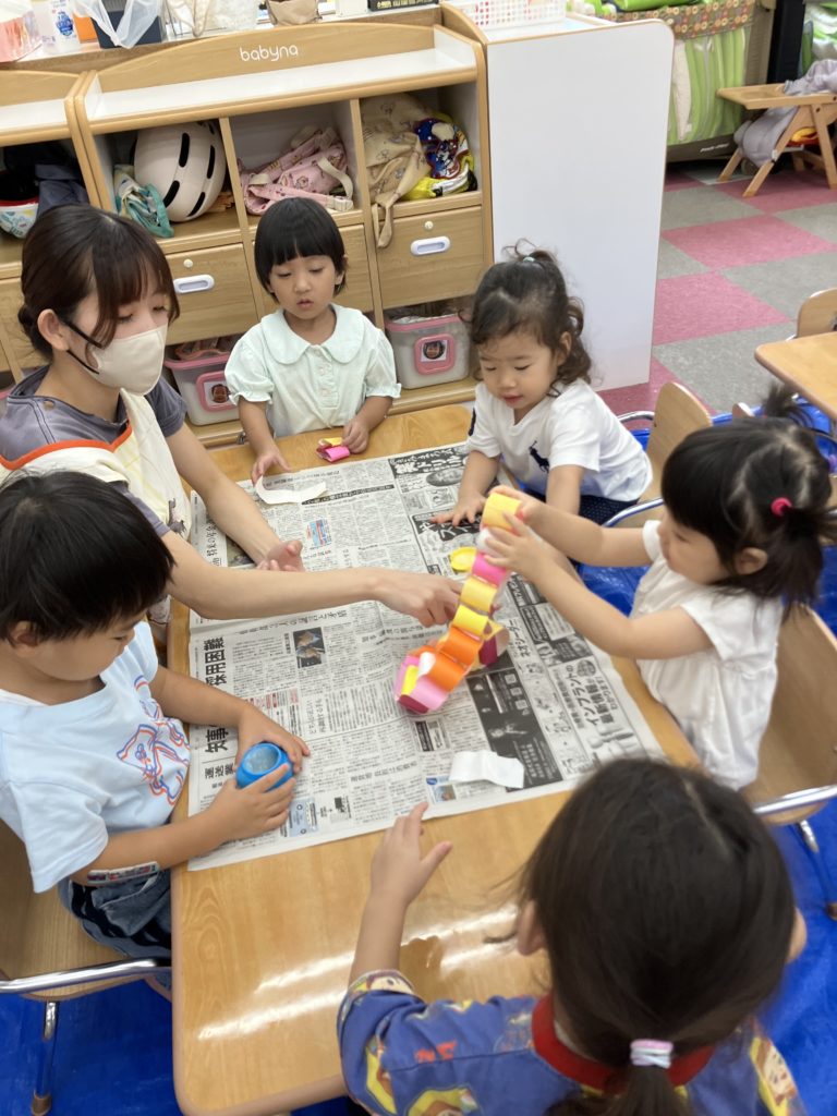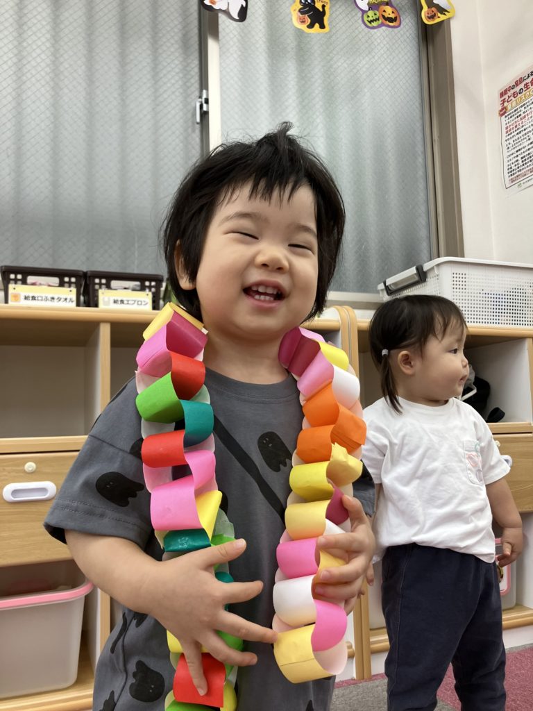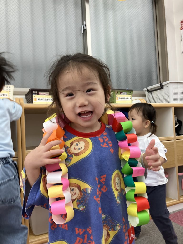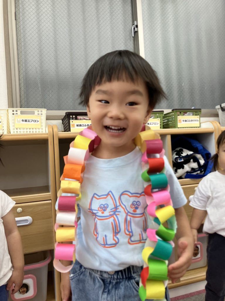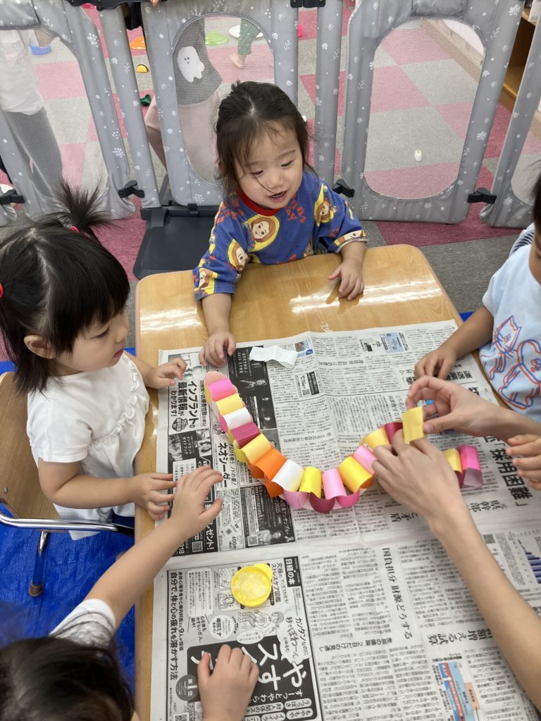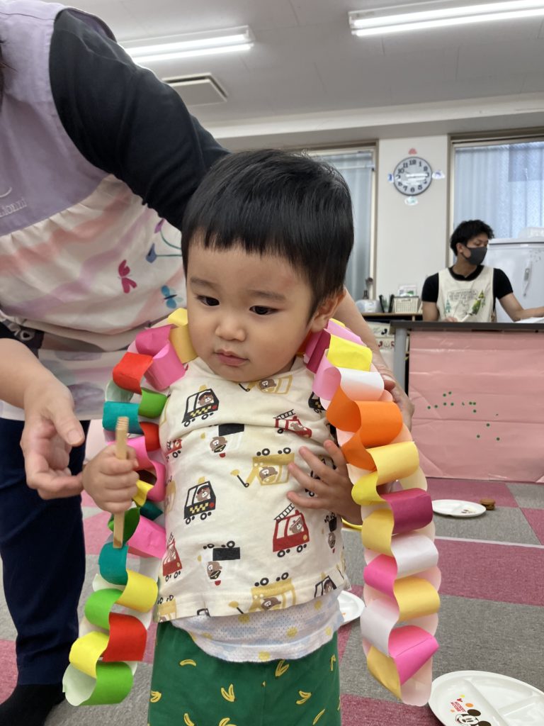 好きな色で輪っかを作り、和飾りをみんなで協力して作りました😊完成するとネックレスにしたり、「ヘビみたい🐍」と言って揺らしてみたりと見立てて遊びました✨
