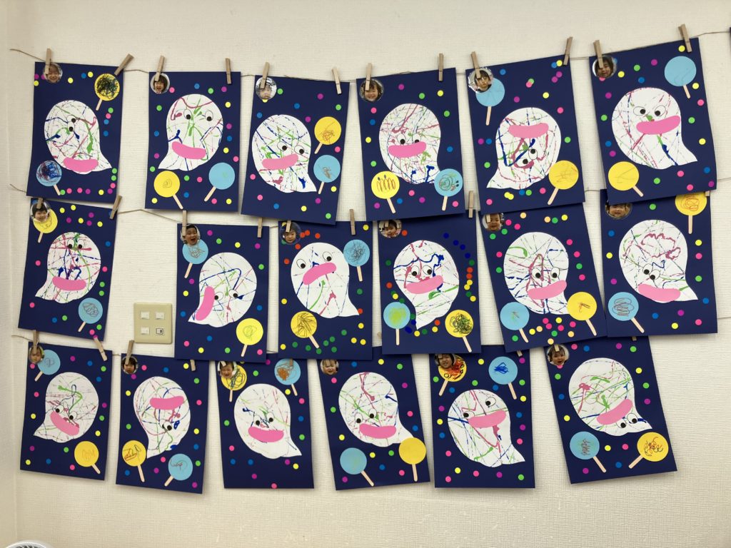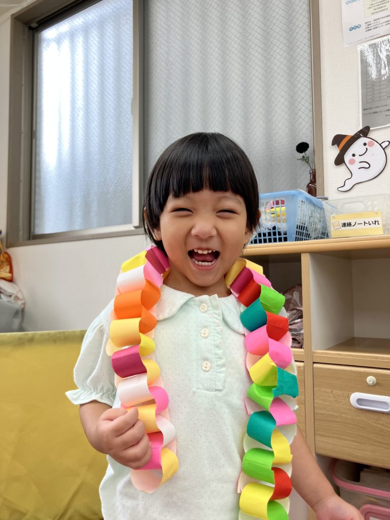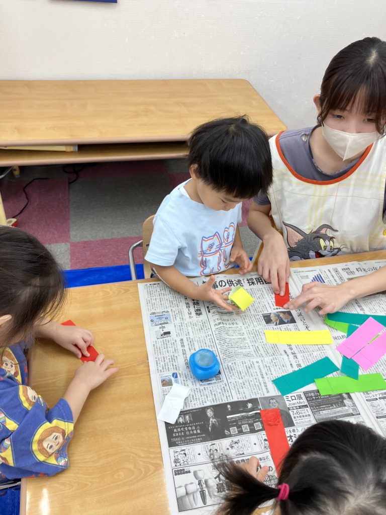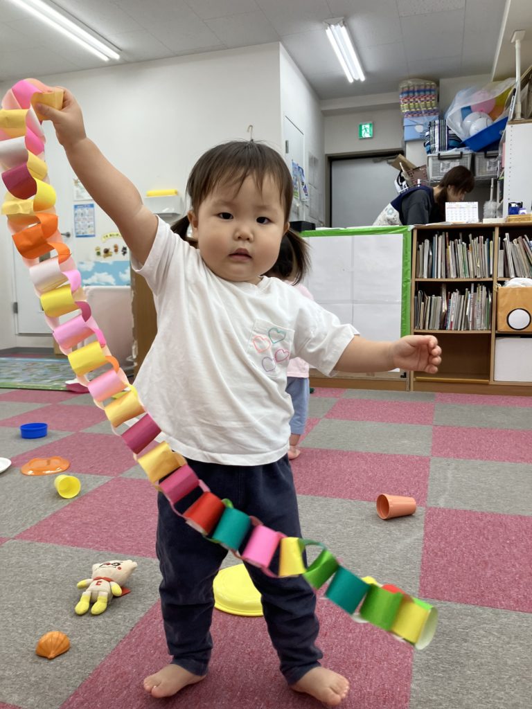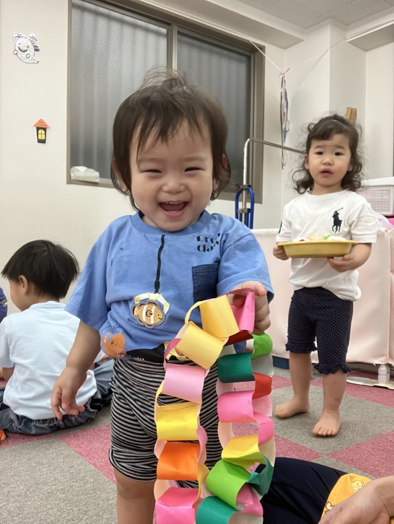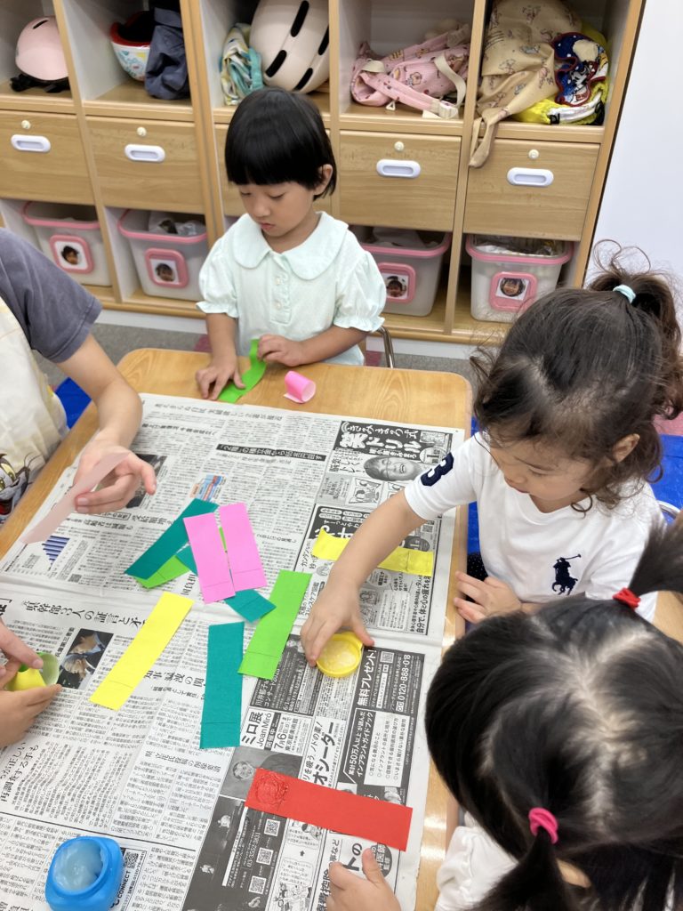 好きな色で輪っかを作り、和飾りをみんなで協力して作りました😊完成するとネックレスにしたり、「ヘビみたい🐍」と言って揺らしてみたりと見立てて遊びました✨