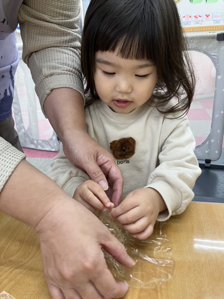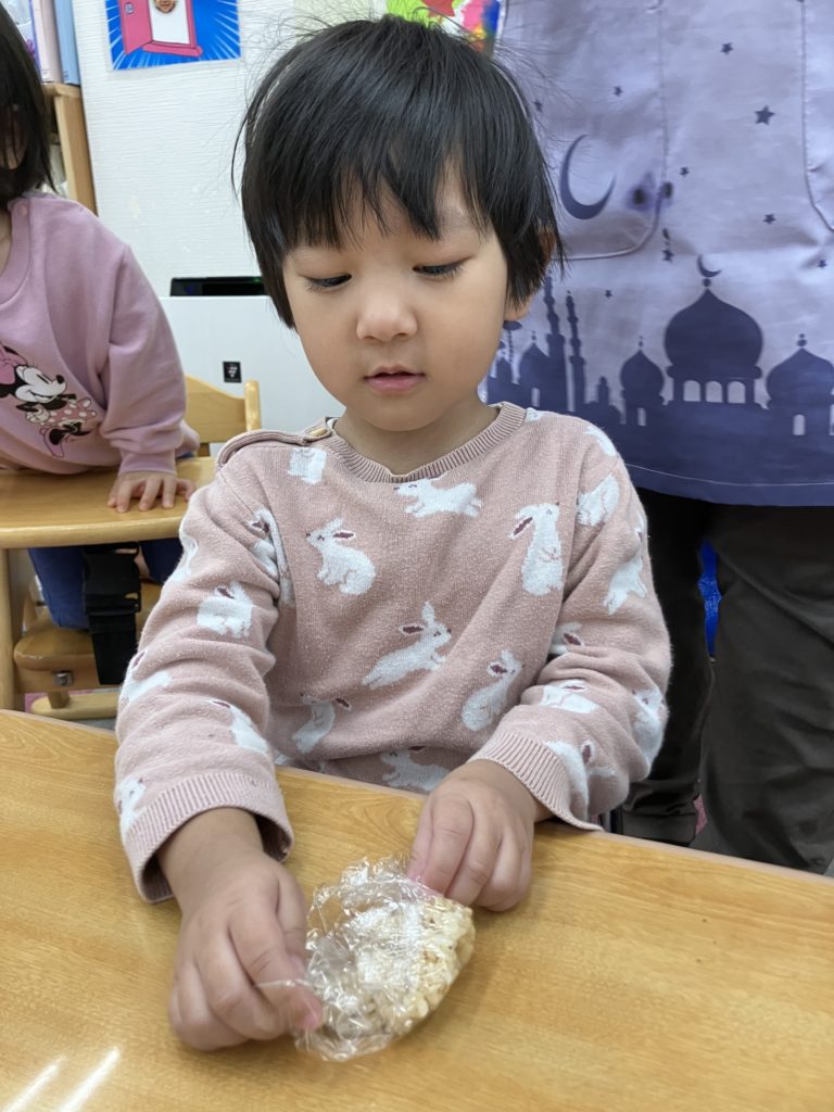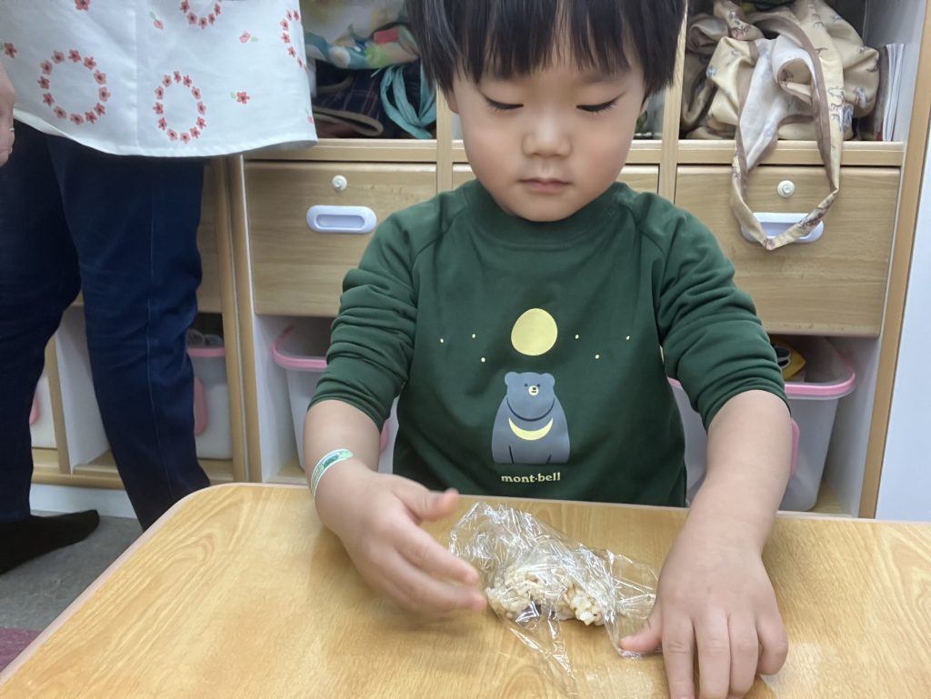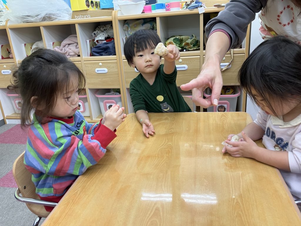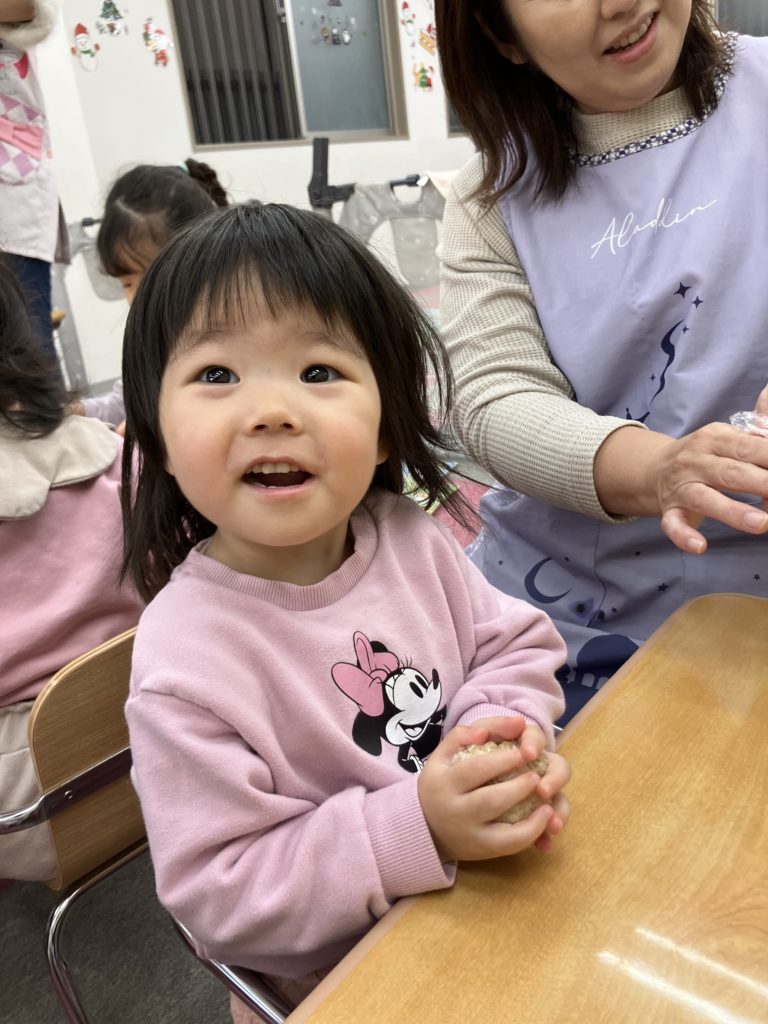 午後のおやつは、2歳児中心でおにぎり作りをしました。上手に握れたかなぁ❓